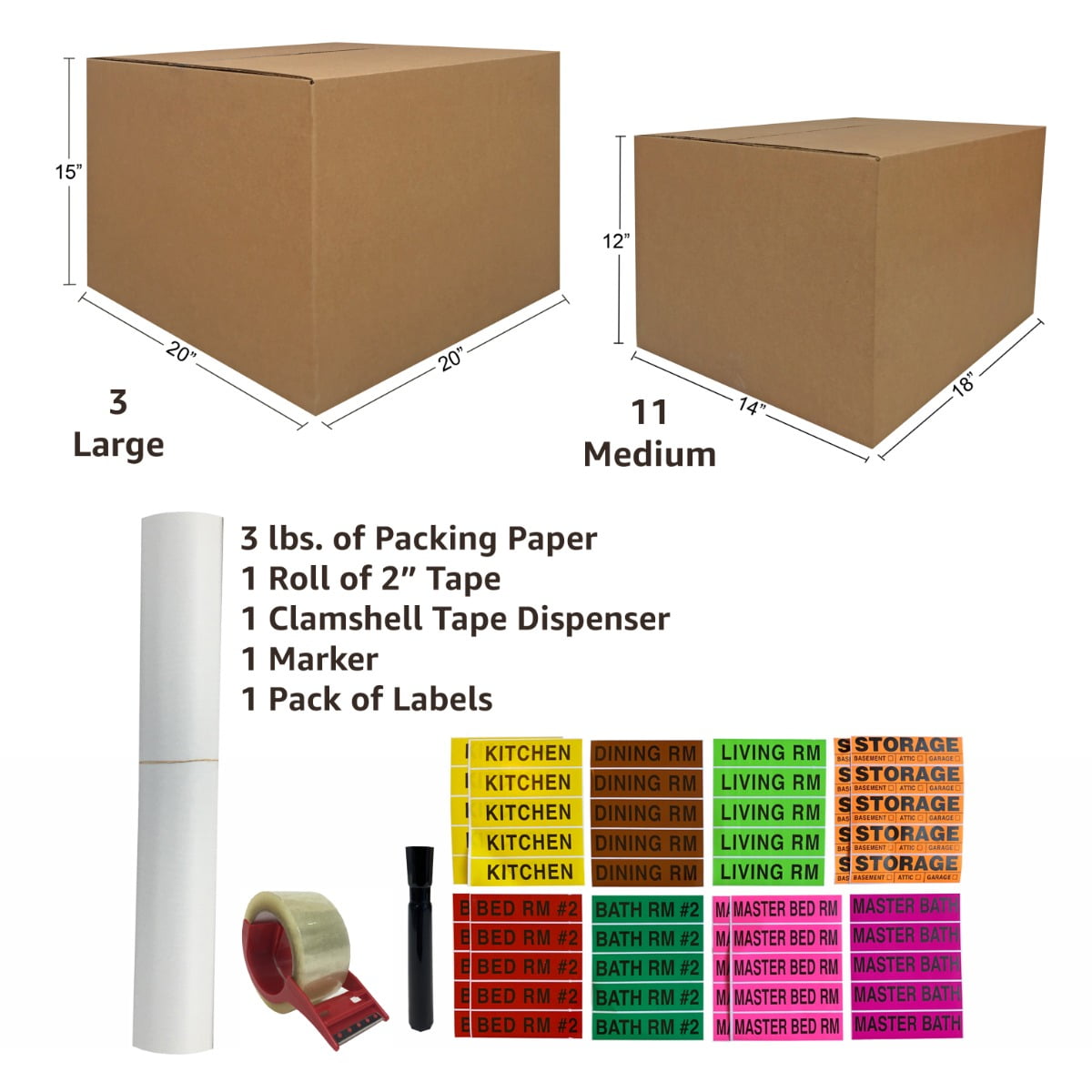 Kit Content: 14 Boxes, Supplies, and 30 cu. ft. of space 11 Medium moving boxes 18″ x 14″ x 12″ 3 Large moving boxes 20″ x 20″ x 15″ 60 Moving Labels 1 Roll of Packing Tape 1 Tape Dispenser 3 lbs. of Wrapping paper 1 Marker