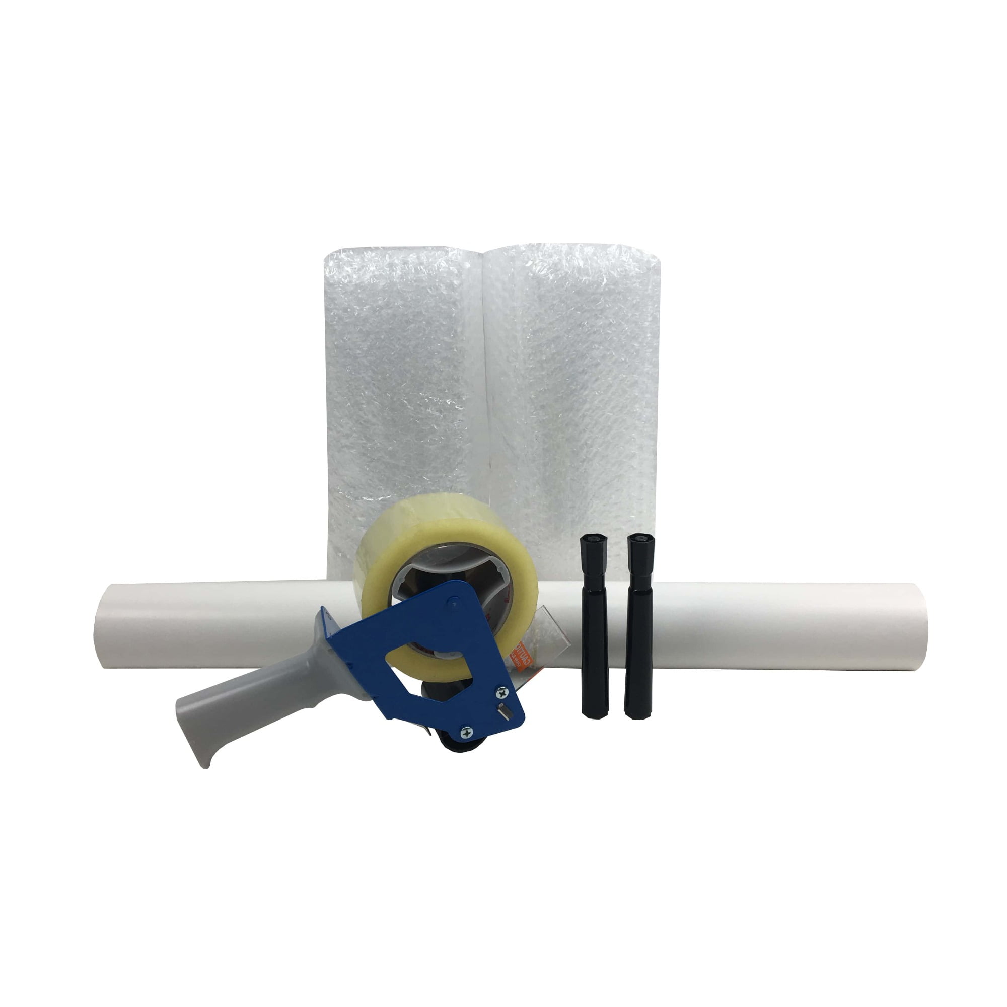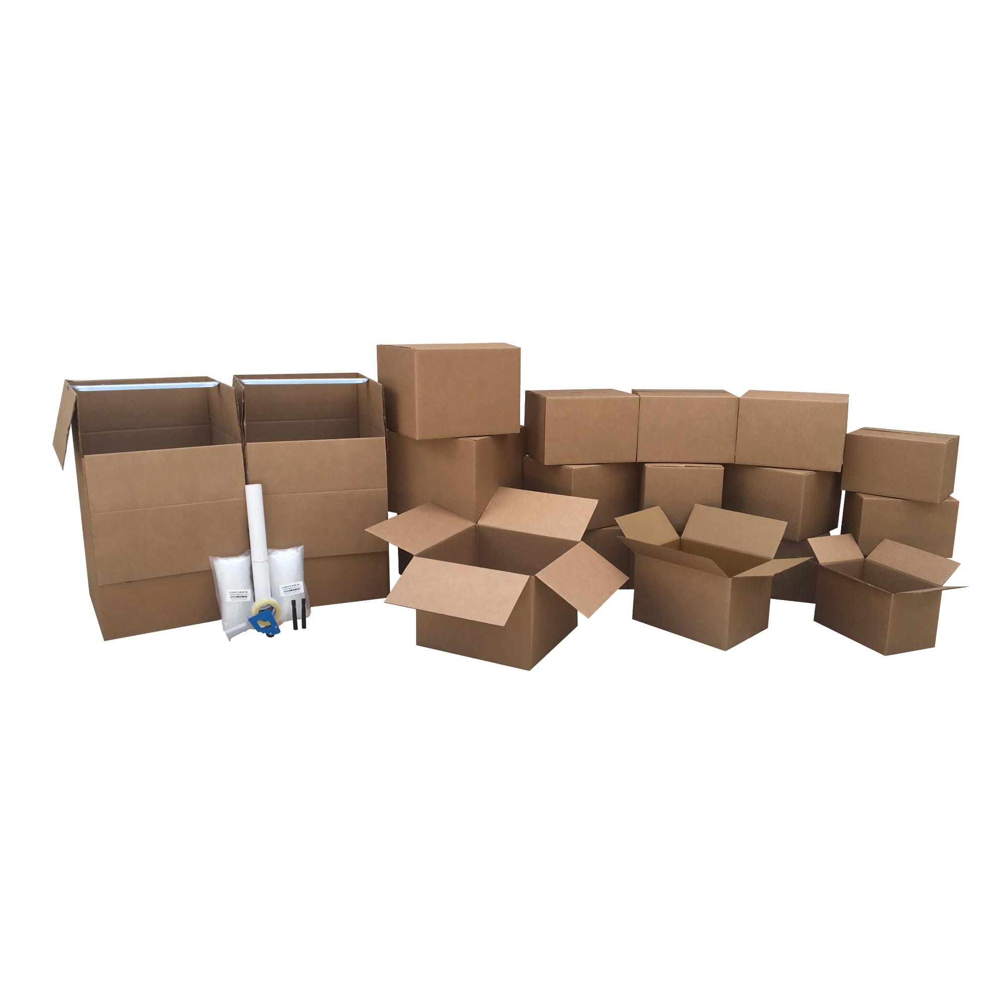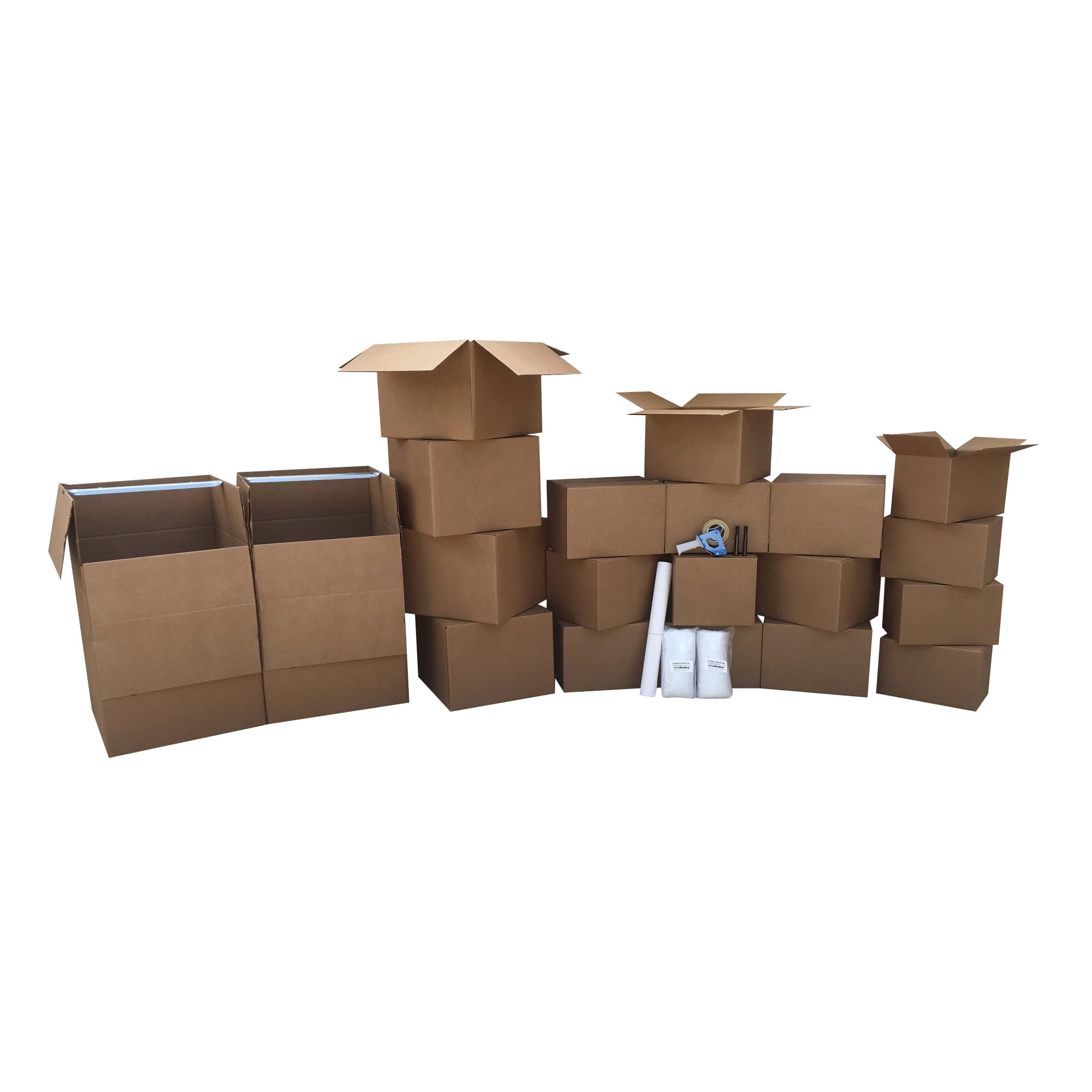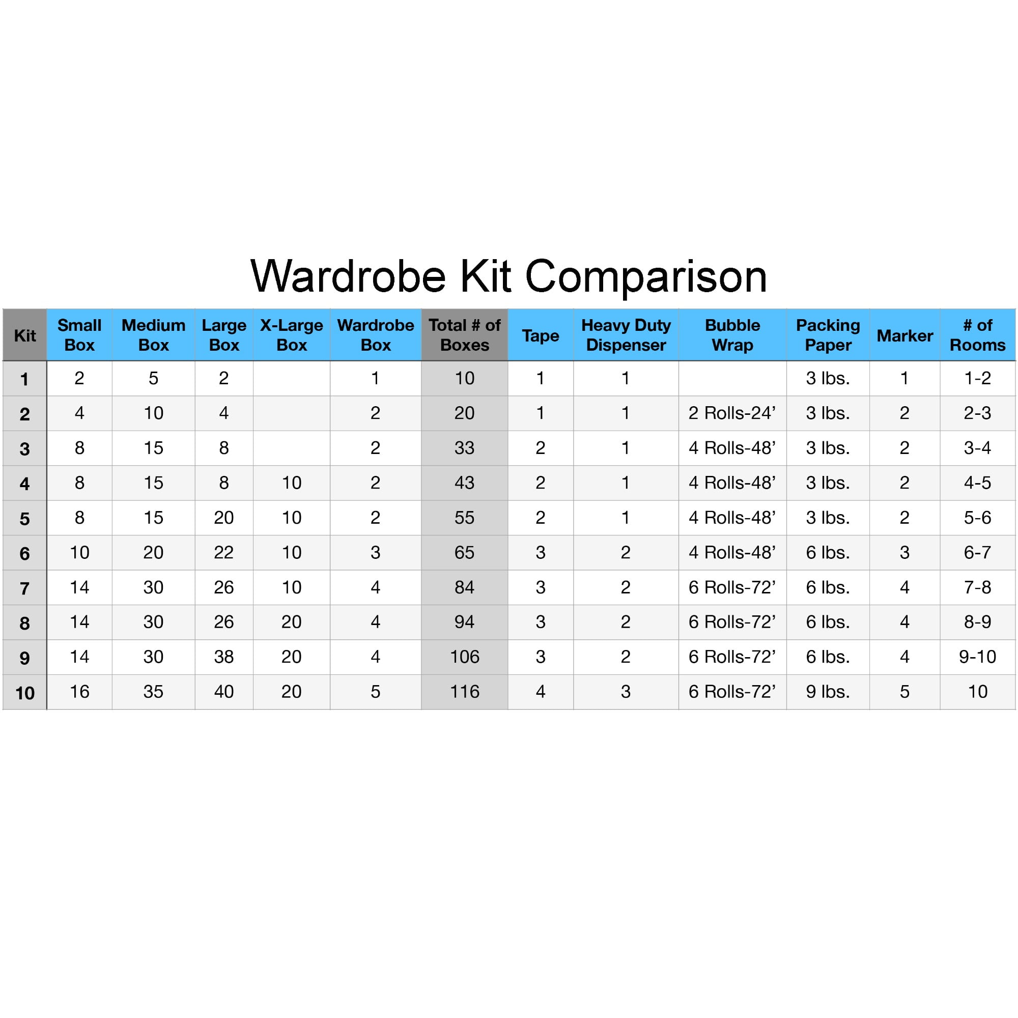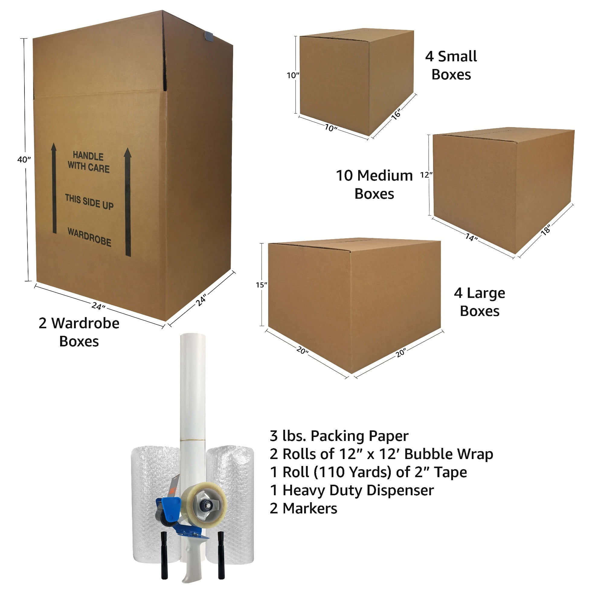 Kit Content: 18 Boxes, 2 Wardrobes, Supplies, & 61.75 cu.ft. space 10 Medium moving boxes 18 x 14 x 12″ 4 Small moving boxes 16 x 10 x 10″ 4 Large moving boxes 20 x 20 x 15″ 2 Wardrobe Boxes 24 x 24 x 40″ * Metal bars shipped in the bottom of the box 2″ x 110 yards of packing tape 1 Heavy Duty Tape Dispenser 12″ x 24′ roll of Bubble Cushion 3 lbs of Wrapping paper 2 Markers