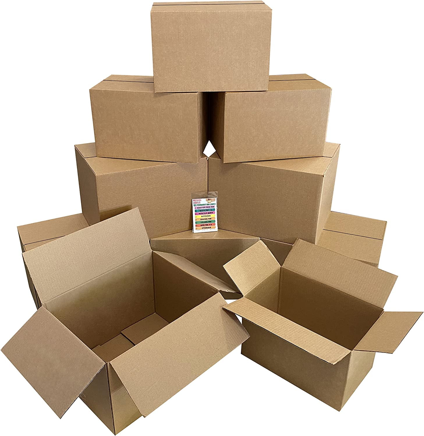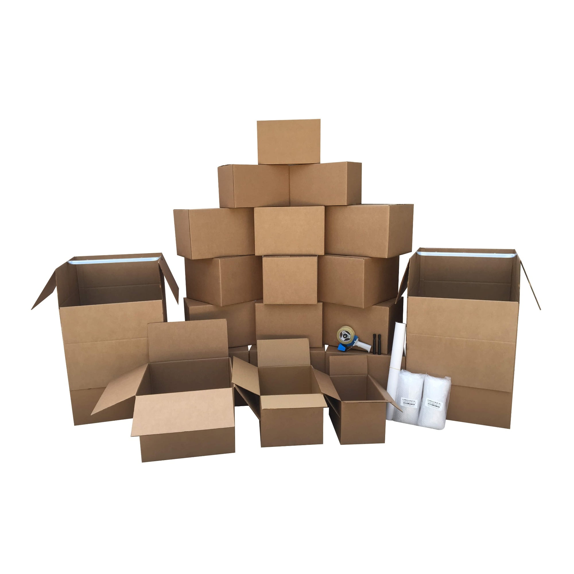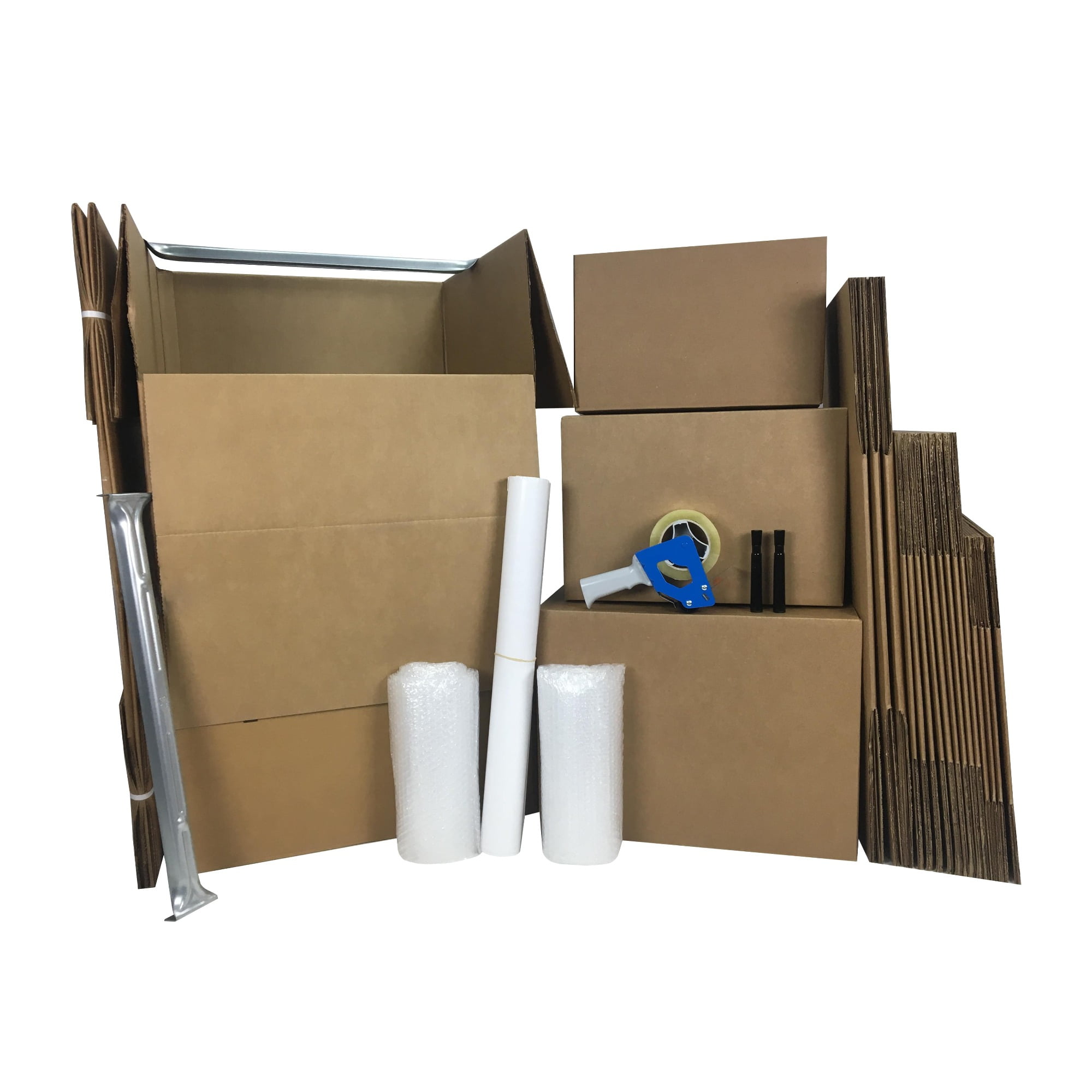 Mixed size boxes moving kit including wardrobe box Label box contents to identify room destinations 32 ECT moving boxes with 200 lbs edge crush test Includes packing materials to wrap fragile items Home delivery saves time with organizing your move