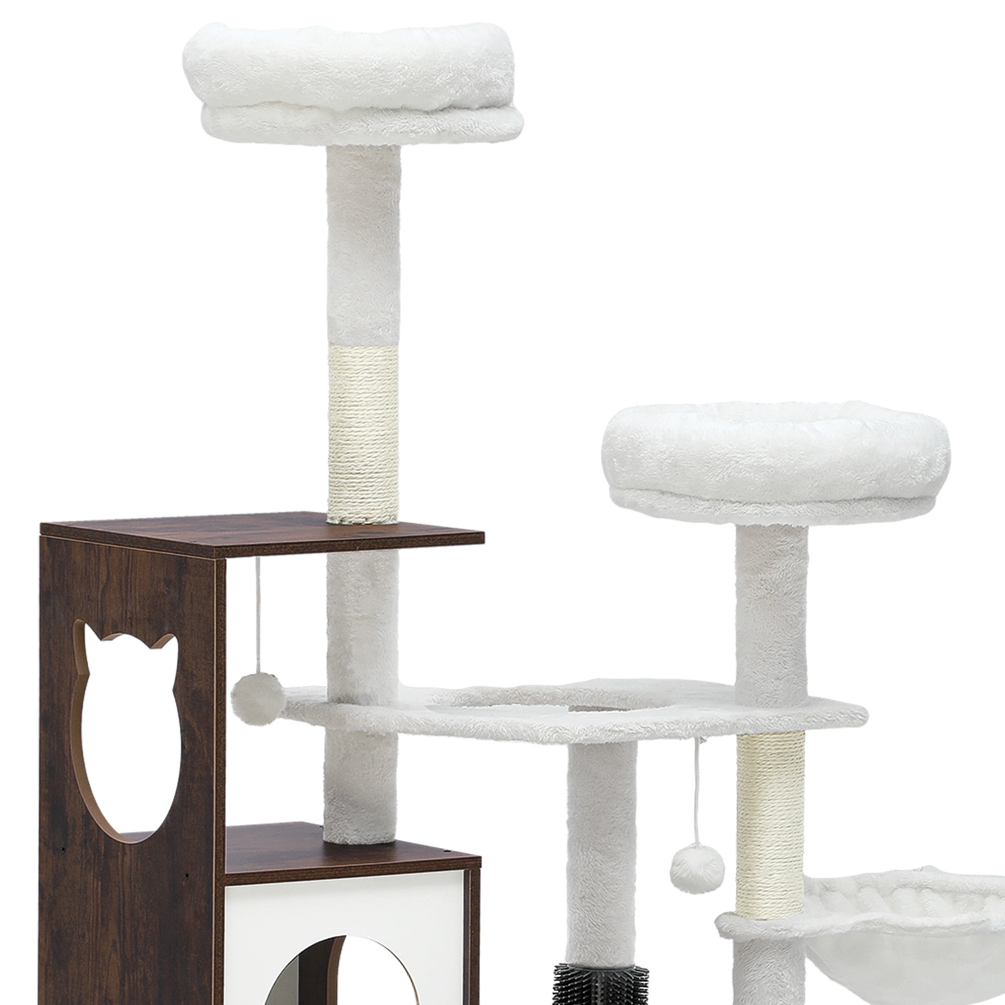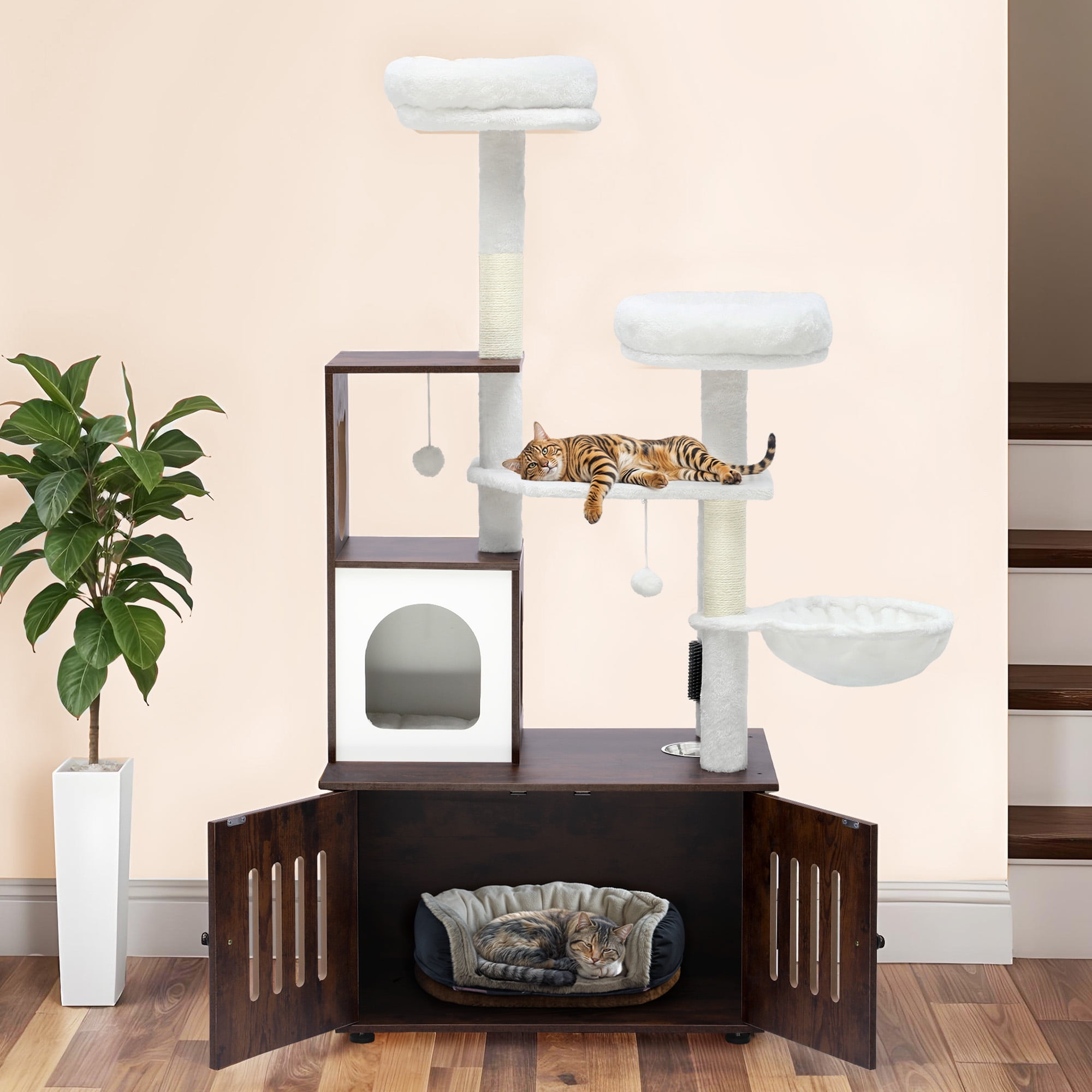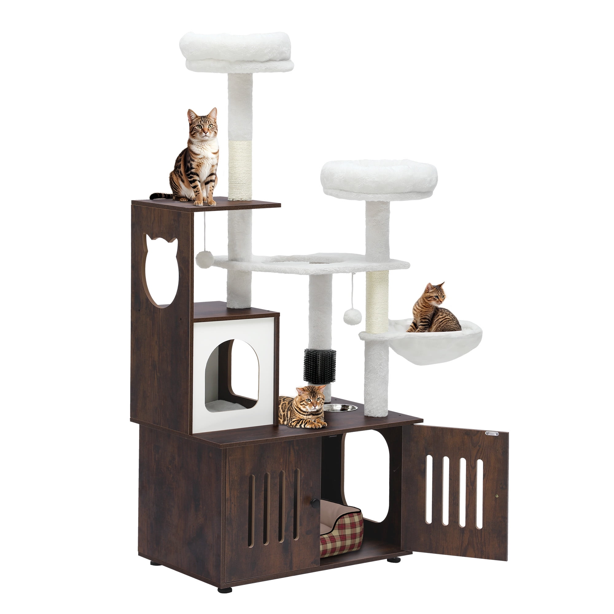 Uforic 2-in-1 Cat Tree with Litter Box Enclosure,59″ Modern Cat Condo with Scratching Posts & Hammocks, Rustic Brown
