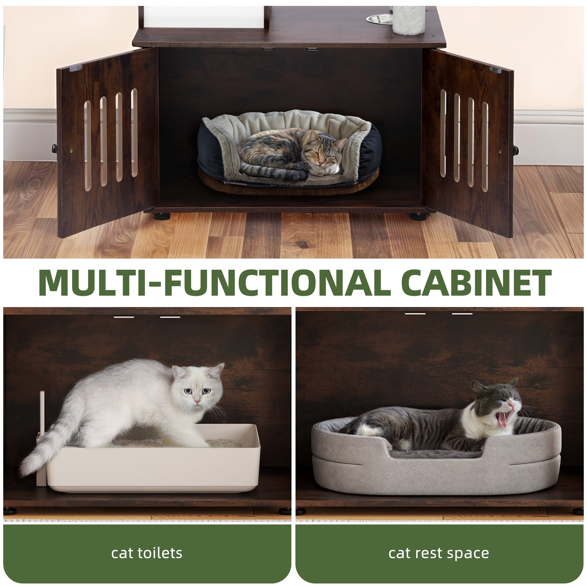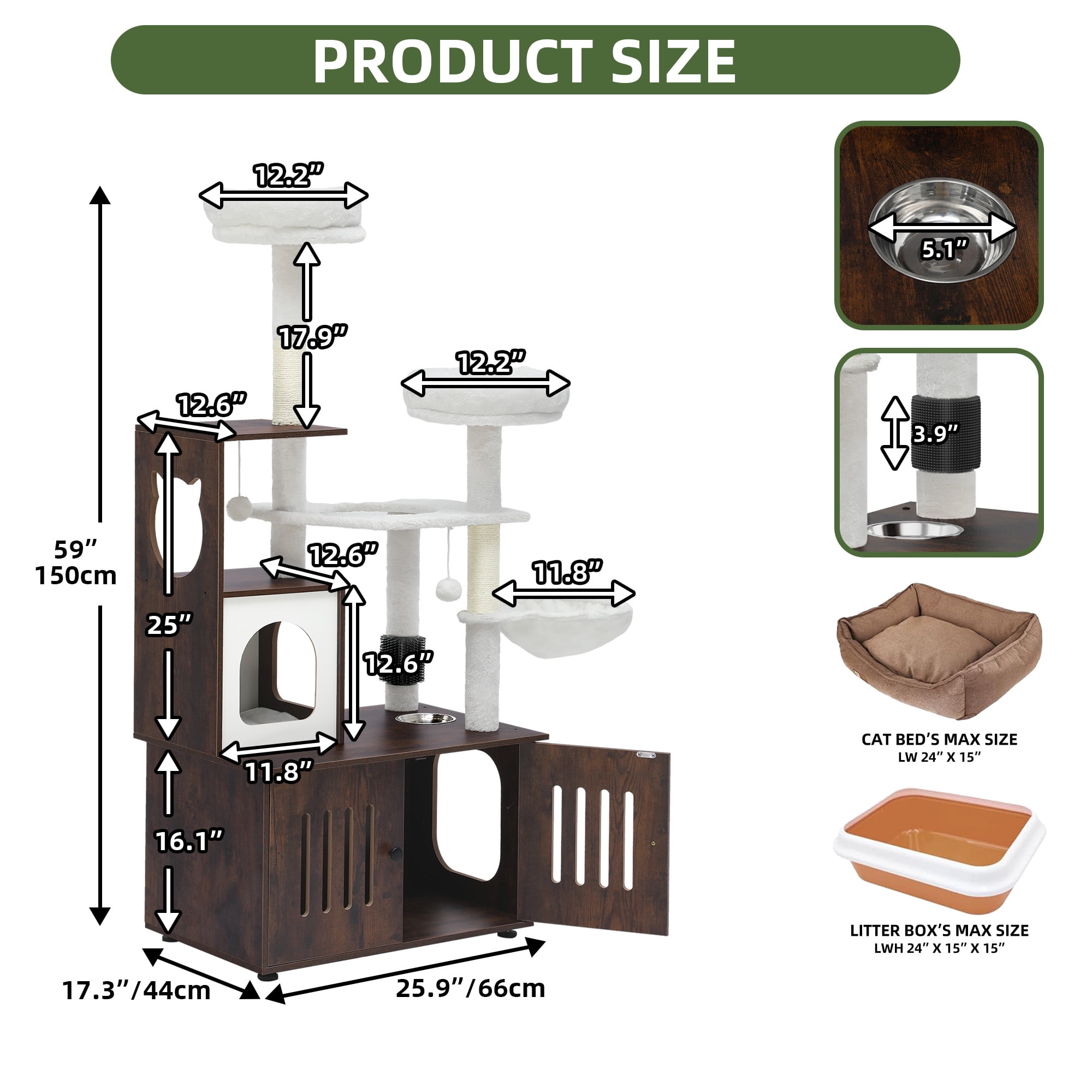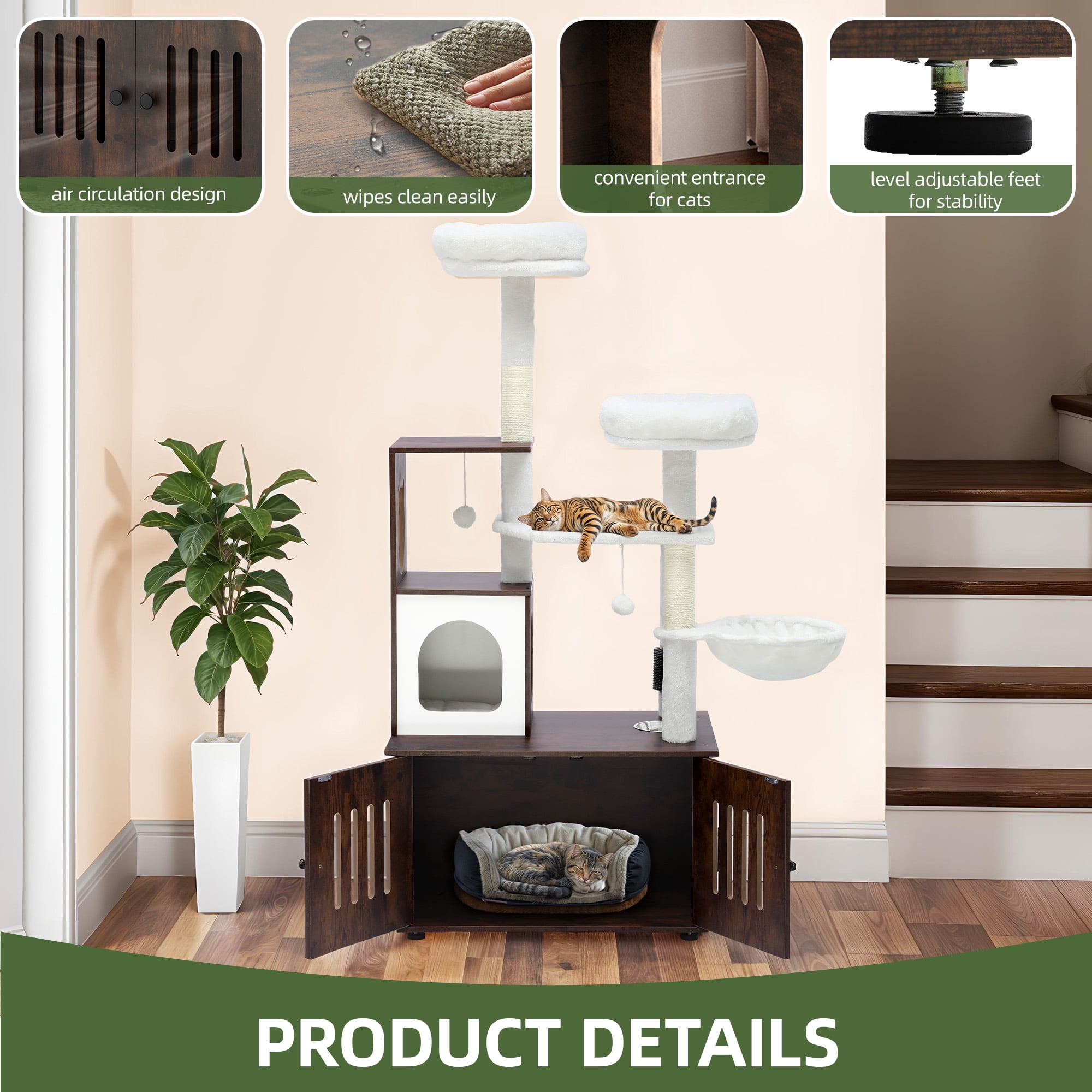 Product Description: Experience smart design with this elegant 2-in-1 cat tree and litter box enclosure. Its rustic-meets-modern aesthetic seamlessly blends into any room, from a cozy apartment to a spacious home. Beyond its good looks, it’s incredibly functional, offering multi-level play, a comfortable feline retreat, a discreet litter storage solution, and an integrated feeding station. Constructed from robust engineered wood and luxurious velvet, it’s a sophisticated upgrade for any cat-loving household. High Light: -2-in-1 Cat Furniture -Private Space -Stable & Safe -Easy to clean & maintain Specifications: Size: 59″ Color: Rustic Brown Material: Engineered Wood Product Dimensions: 25.9″L x 17.3″W x 59″H Item Weight: 41.23 pounds Special Feature: Adjustable, Climbing