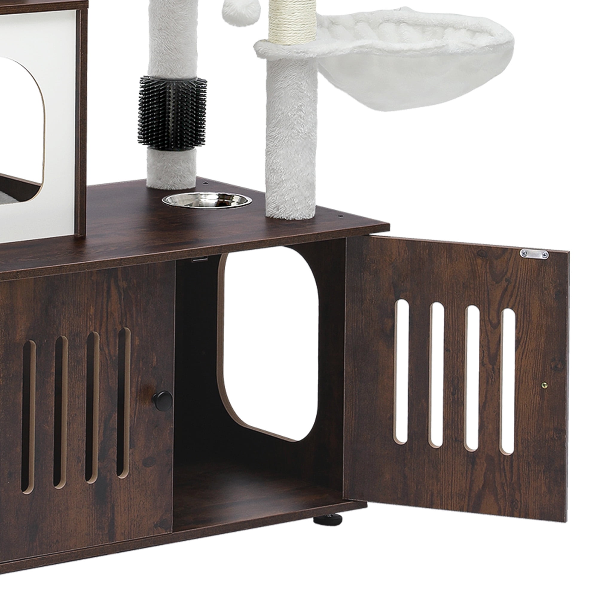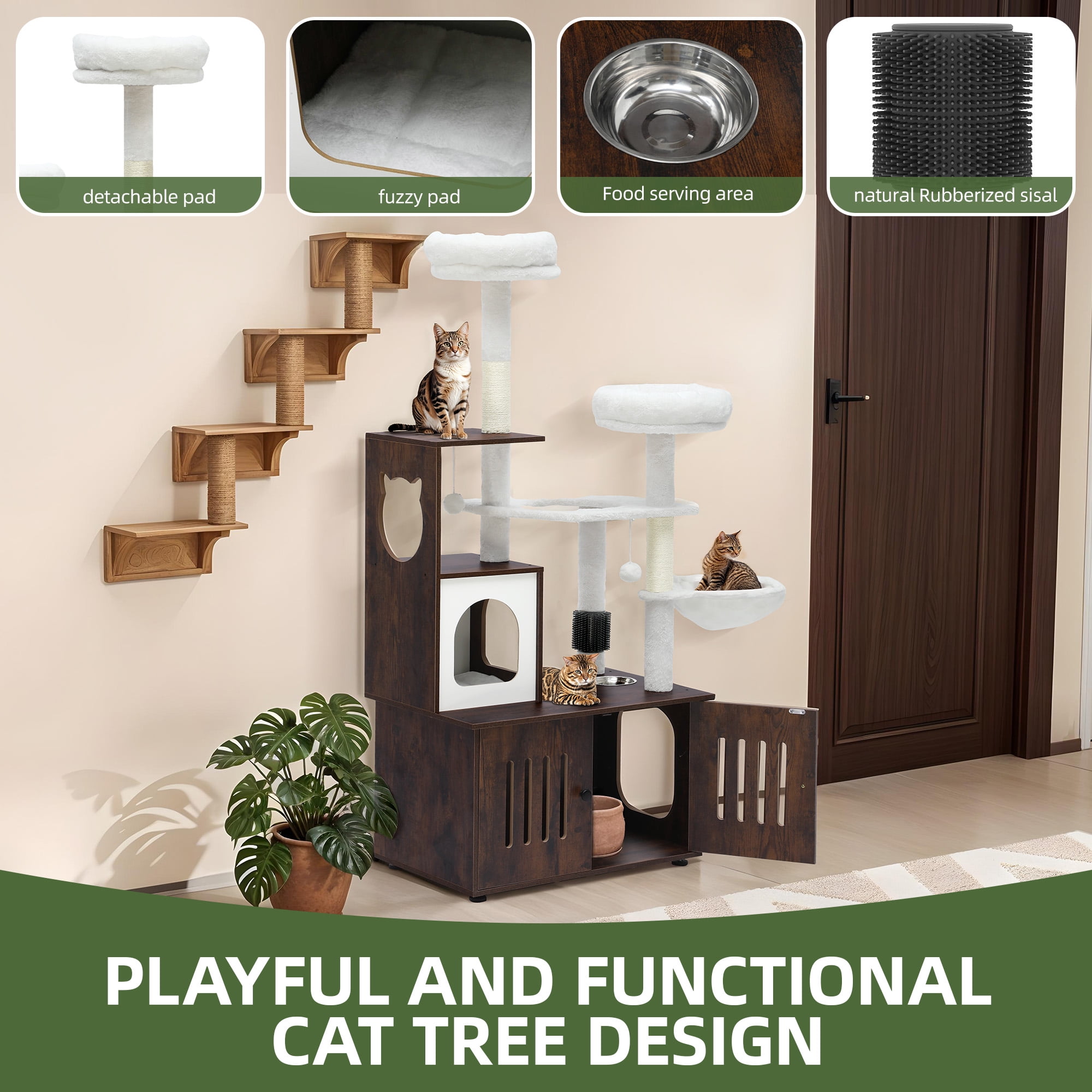 Versatile Litter Box Encloser: A smart fusion of litter box enclosure, play zone, and cat house, ideal for modern homes. The side entry offers privacy and easy access, while vents provide airflow and optimal light. Easy-peasy Setup: With labeled parts, easy-to-follow instructions, and intuitive assembly, you’ll have this 2-in-1 cat condo ready in no time, so your cat can climb, nap, and play the same day it comes. Mealtime Made Simple: No need for extra dishes, this unit includes a stainless steel food bowl. Plus, a tip-resistant kit ensures added security, making it a safe hub for even the most energetic cats. Adventure-Ready Design: Equipped with 2 plush cotton-filled nests, an iron frame perch, 2 sisal columns, 4 velvet posts, 2 hanging balls, and a silicone scratching column, ideal for climbing, lounging, and scratching. Stable & Scratchproof Build: Built from sturdy engineered wood, this cat condo features adjustable feet that ensure a steady setup while guarding your floors against scratches, suitable for playful jumpers or heavier feline companions.
