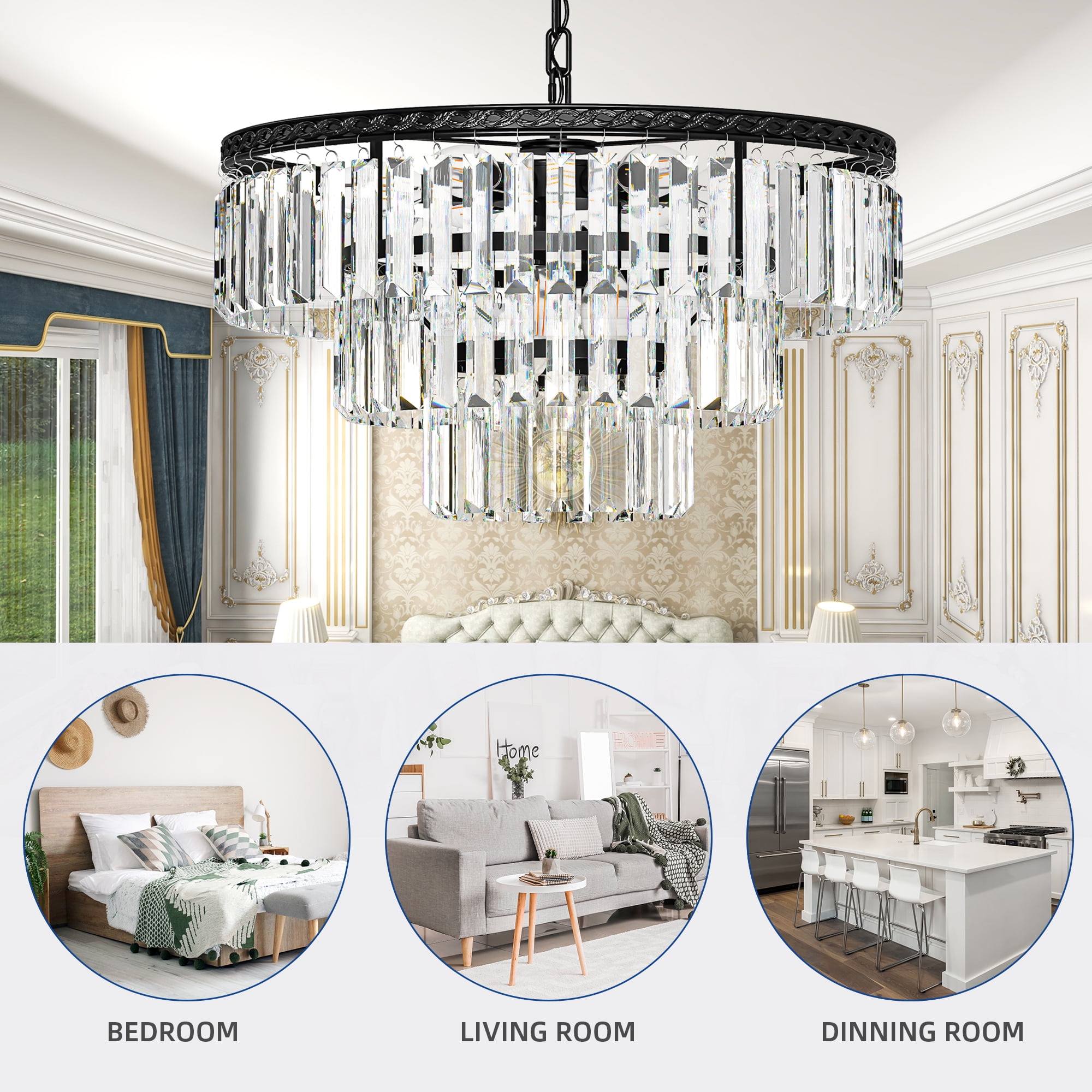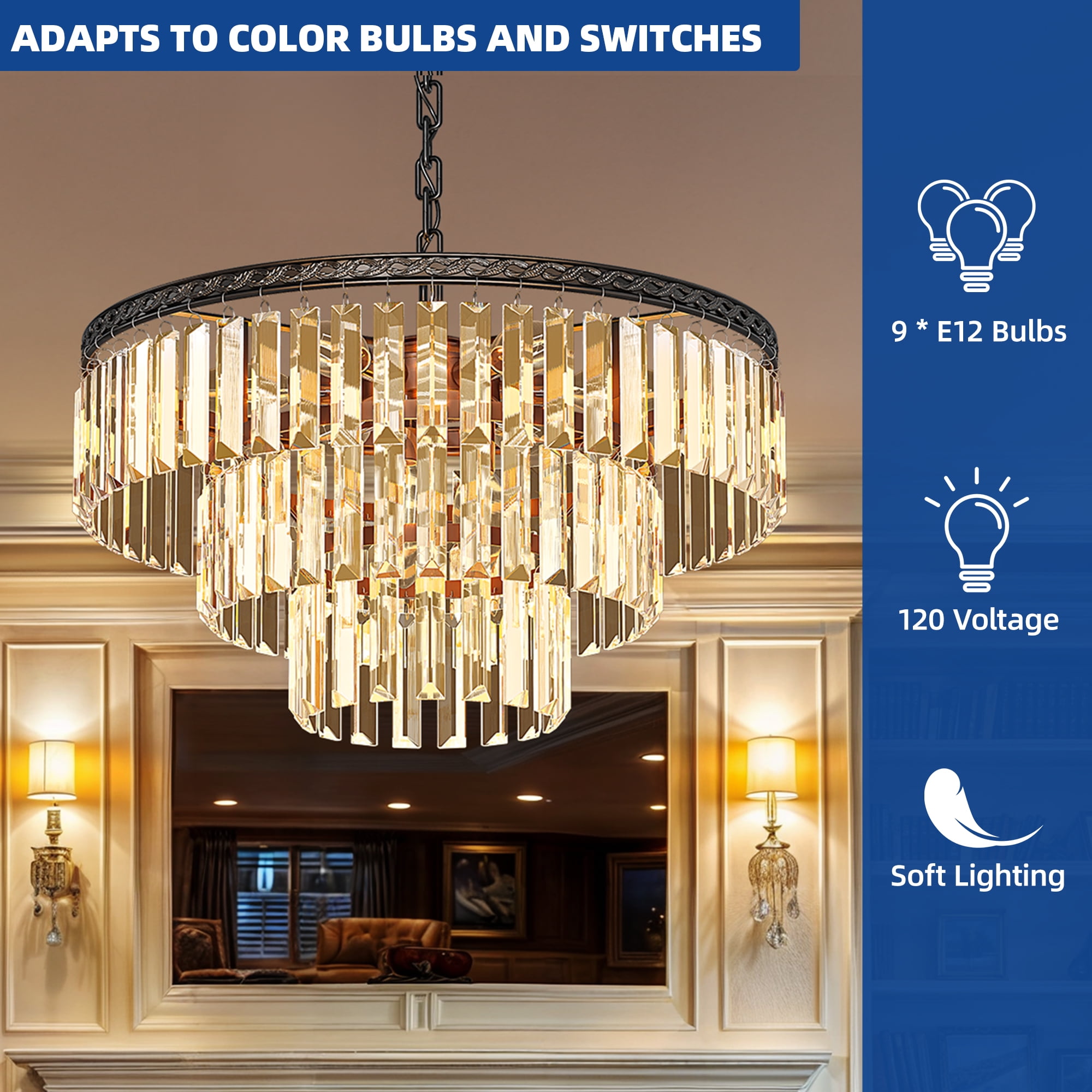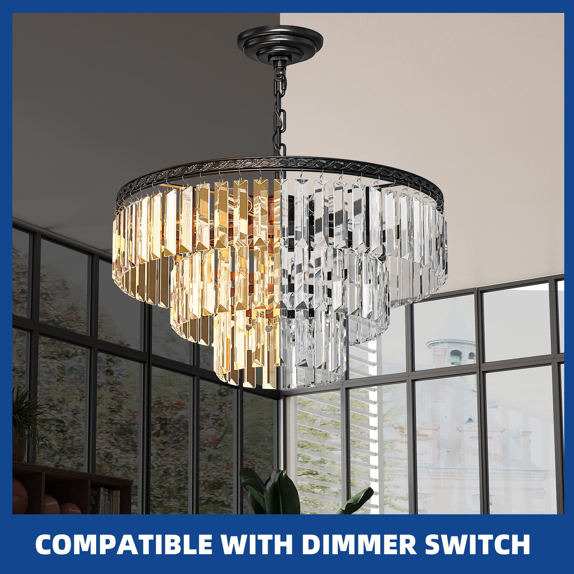 Uforic 20″ Black Crystal Chandeliers, 9-Light Ceiling Fixture, 3-Tier K9 Crystal Pendant Light for Dining Room, Kitchen Island, and Living Room
