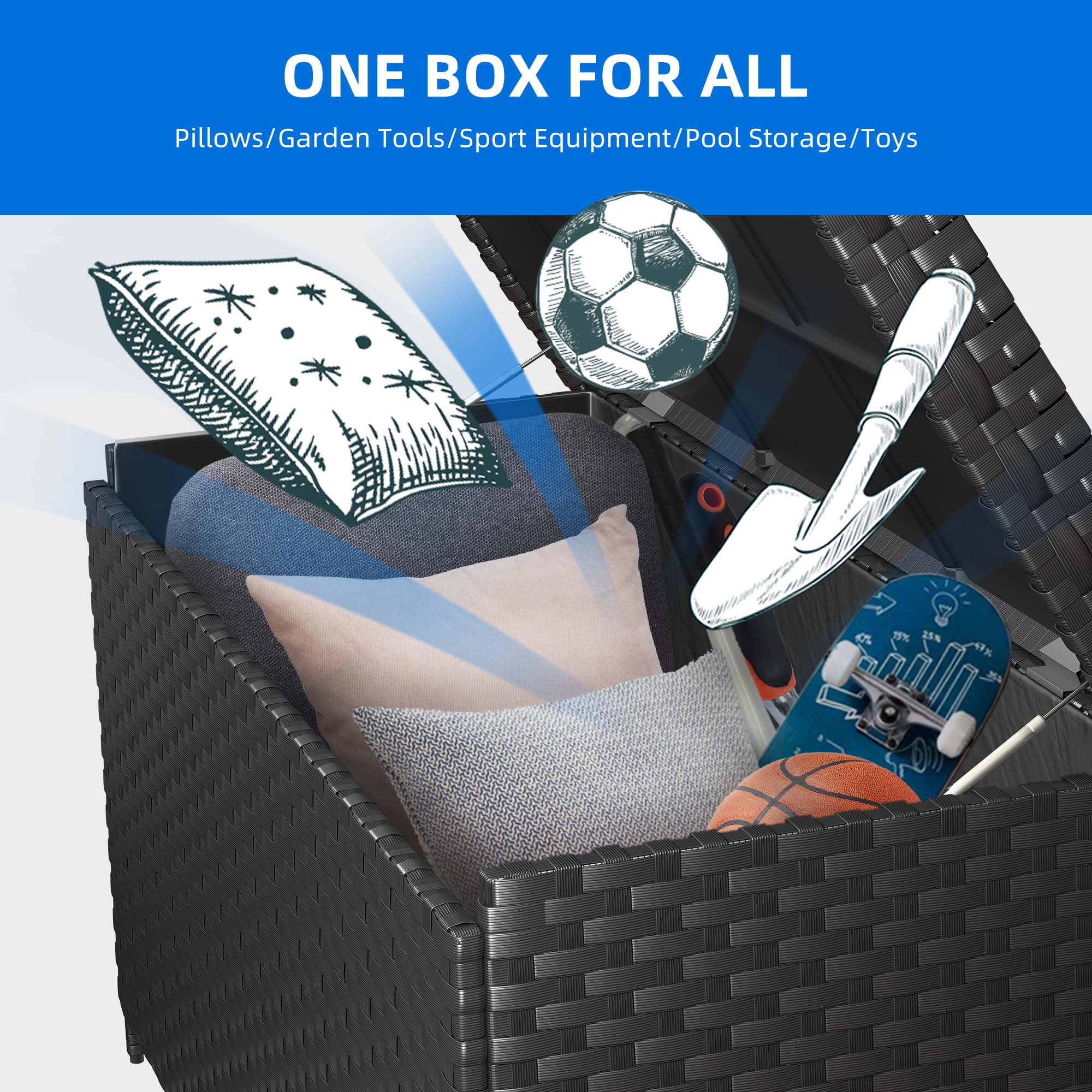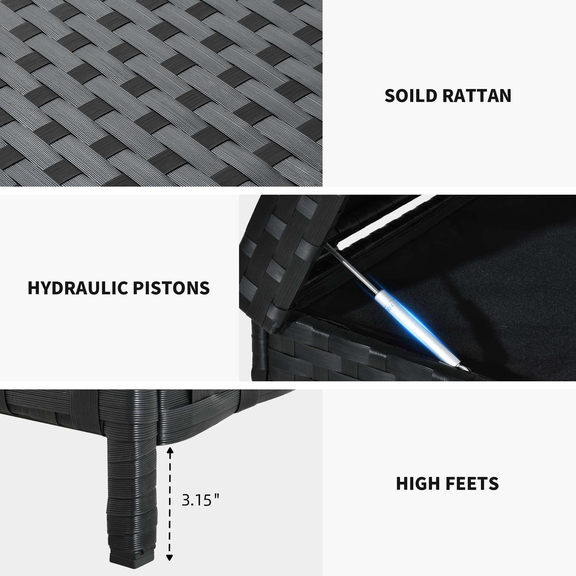 Weather-Resistant Durability: Crafted with high-quality PE rattan, this deck box is built to withstand harsh weather conditions, ensuring year-round durability for all your outdoor storage needs. Spacious Storage Capacity: With a generous 230-gallon capacity, this deck box offers ample space to store a variety of outdoor items, providing a practical solution for keeping your outdoor space organized and clutter-free. Multi-Functional Lid Design: The lid of the deck box doubles as a convenient tabletop, perfect for hosting outdoor gatherings, enjoying meals, or engaging in games and activities, adding versatility to your outdoor space. Versatile Storage Solution: From garden tools and sports equipment to cushions and pool toys, this deck box offers plenty of room to store all your outdoor essentials, ensuring easy access and organization for a tidy patio or outdoor area. Easy Assembly and Convenience: Designed for hassle-free setup, this deck box comes with all necessary hardware and instructions for easy assembly, allowing you to enjoy its benefits quickly and effortlessly.