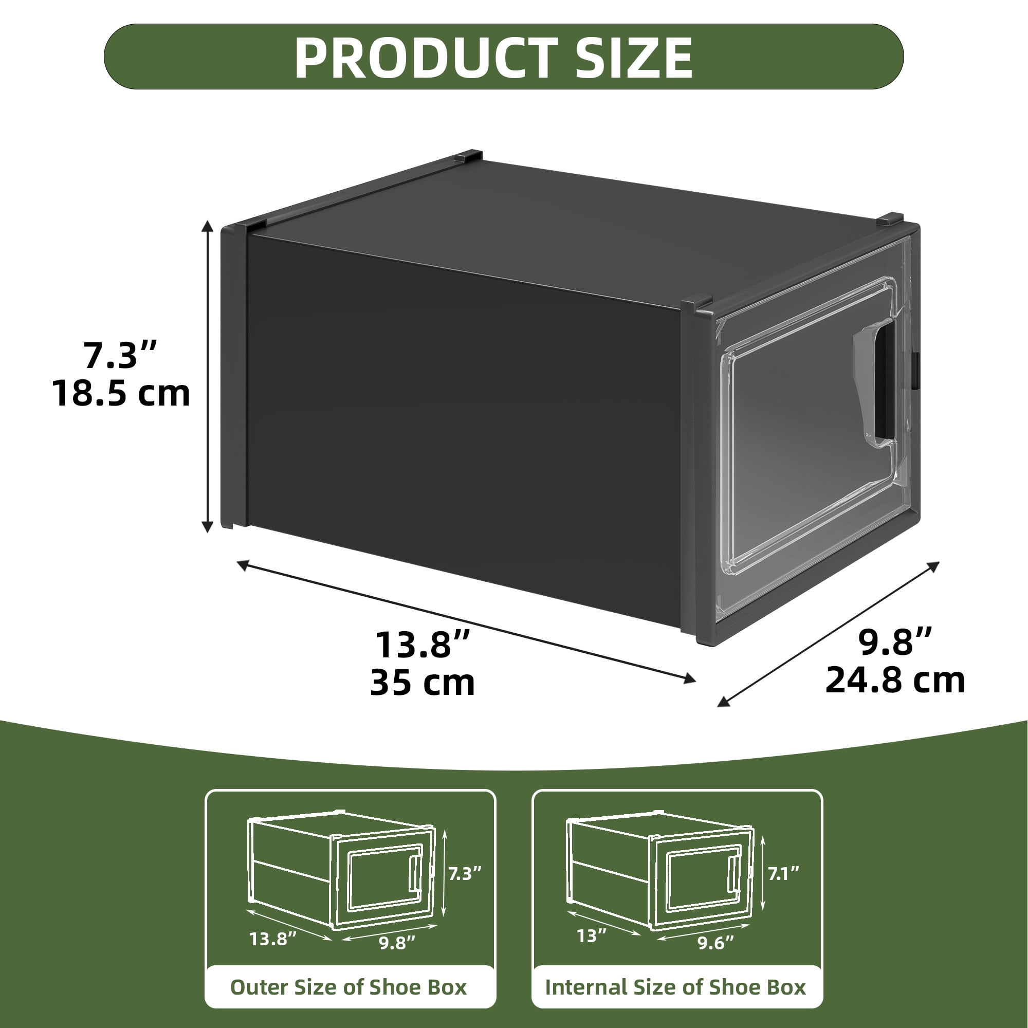 Large Capacity – Each shoe box fits shoes up to US Men’s Size 13 or US Women’s Size 14 Stackable & Space-Saving – Easily stack these boxes to maximize storage space in your closet or entryway Breathable & Ventilated – Built-in air holes promote air circulation and prevent odor buildup Durable & Sturdy Material – Made from high-quality PP and PS plastic for long-lasting use. Easy to Access – Clear flip-front doors let you grab your shoes without unstacking the boxes. Multipurpose Storage – Use them for storing shoes, clothing, accessories, or small household items. Quick & Easy Assembly – No tools required—simply snap the parts together.