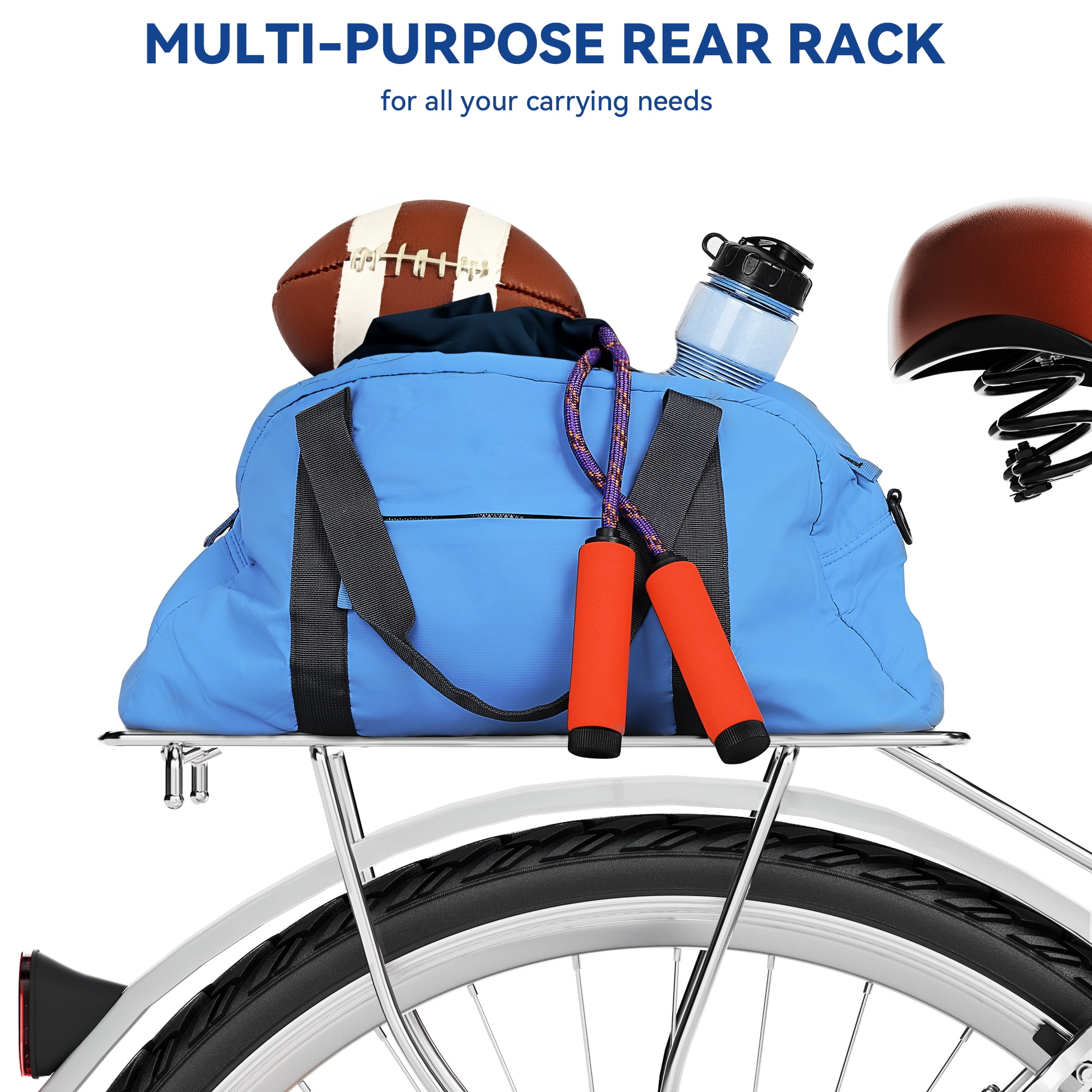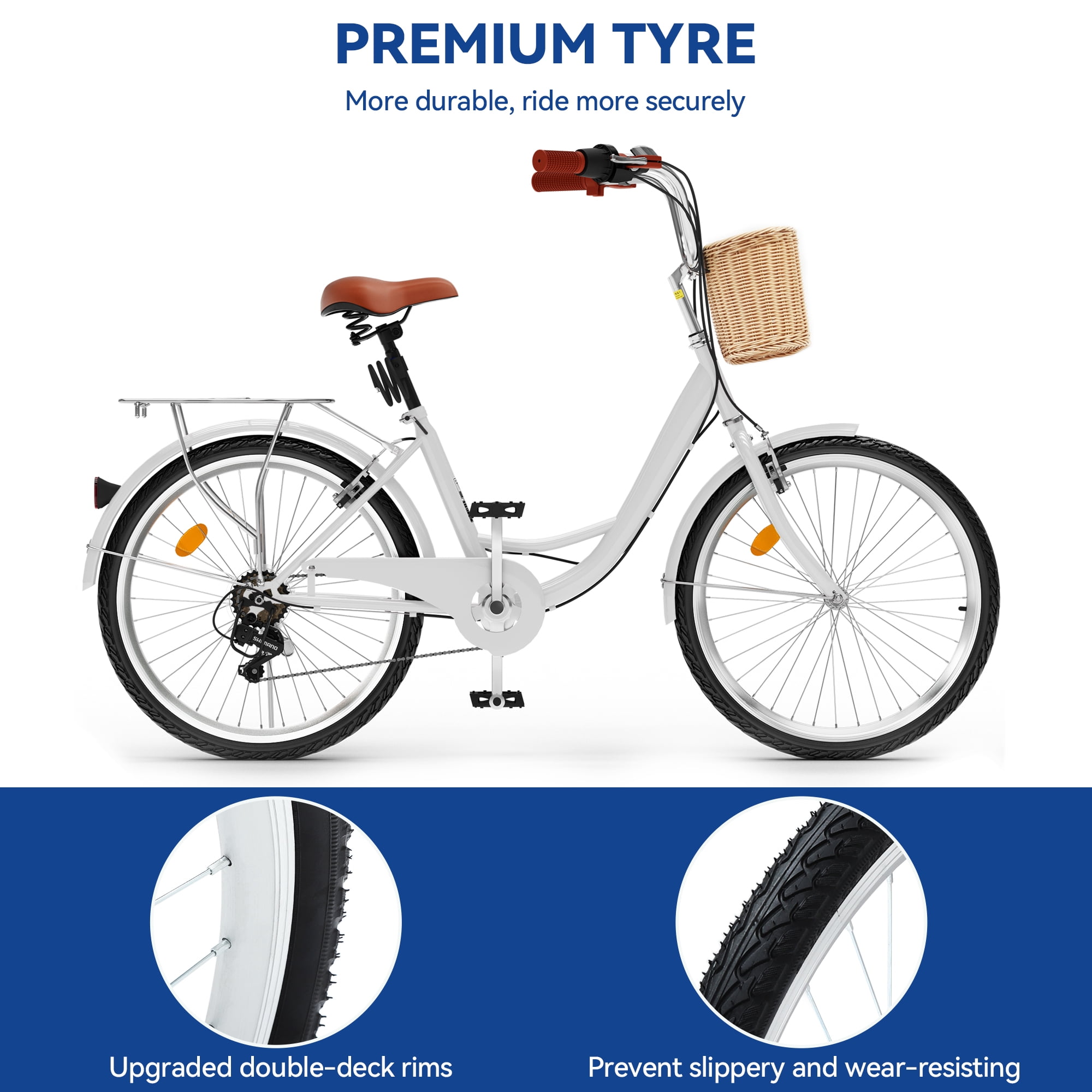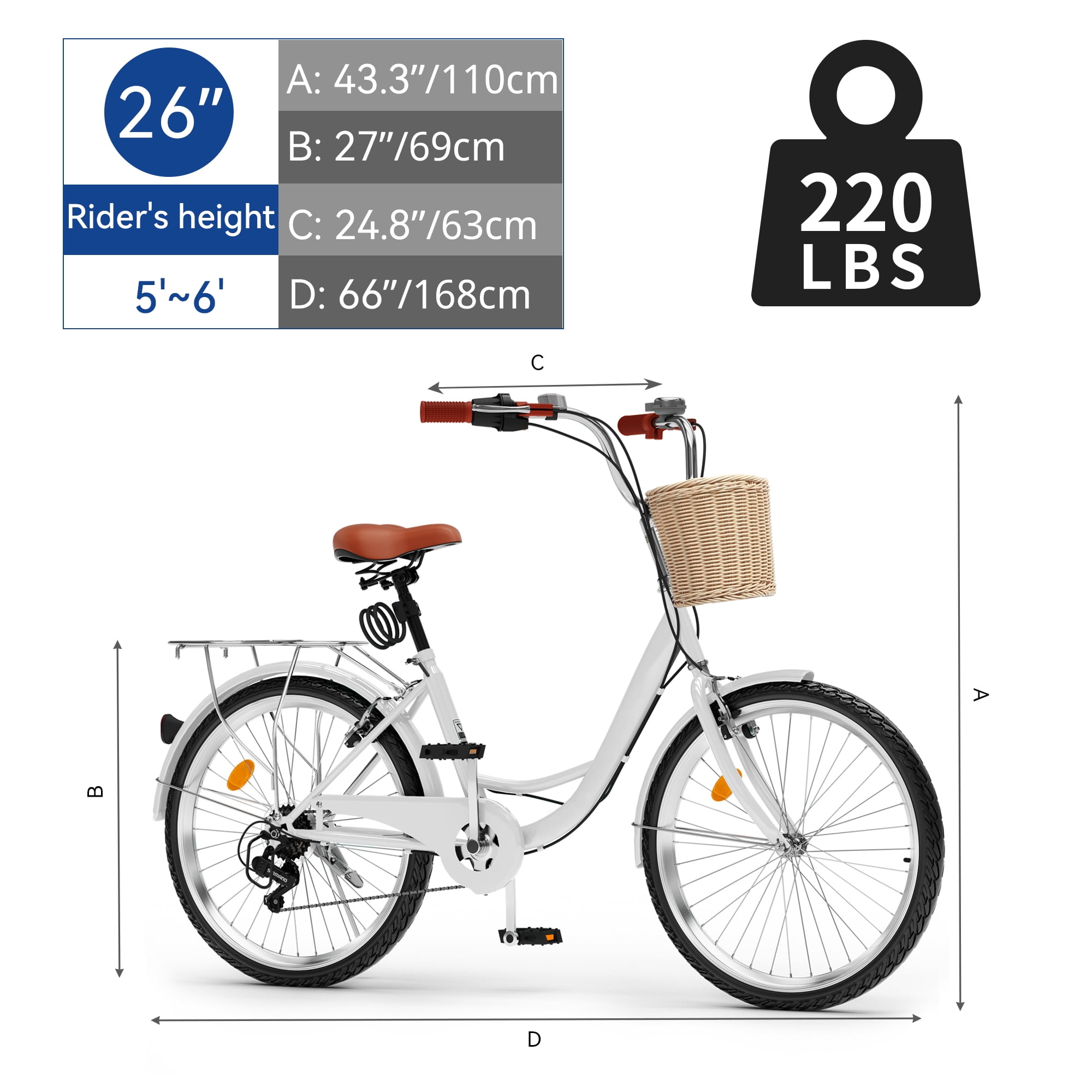 DESCRIPTION Experience the perfect blend of style, comfort, and versatility with the White 26-Inch Cruiser Bicycle. Designed for smooth and enjoyable rides, this 7-speed cruiser is ideal for leisure cruising, commuting, and casual weekend adventures. Specifications: Color: White Frame Material: Steel Speed Options: 7-Speed Wheel Size: 26 inches Brakes: V-Brakes Basket: Wicker-style front basket included Handlebar Grips & Saddle: Brown leather-style material Packaging: 7-layer corrugated cardboard box Assembly: Fully assembled, minor adjustments may be required