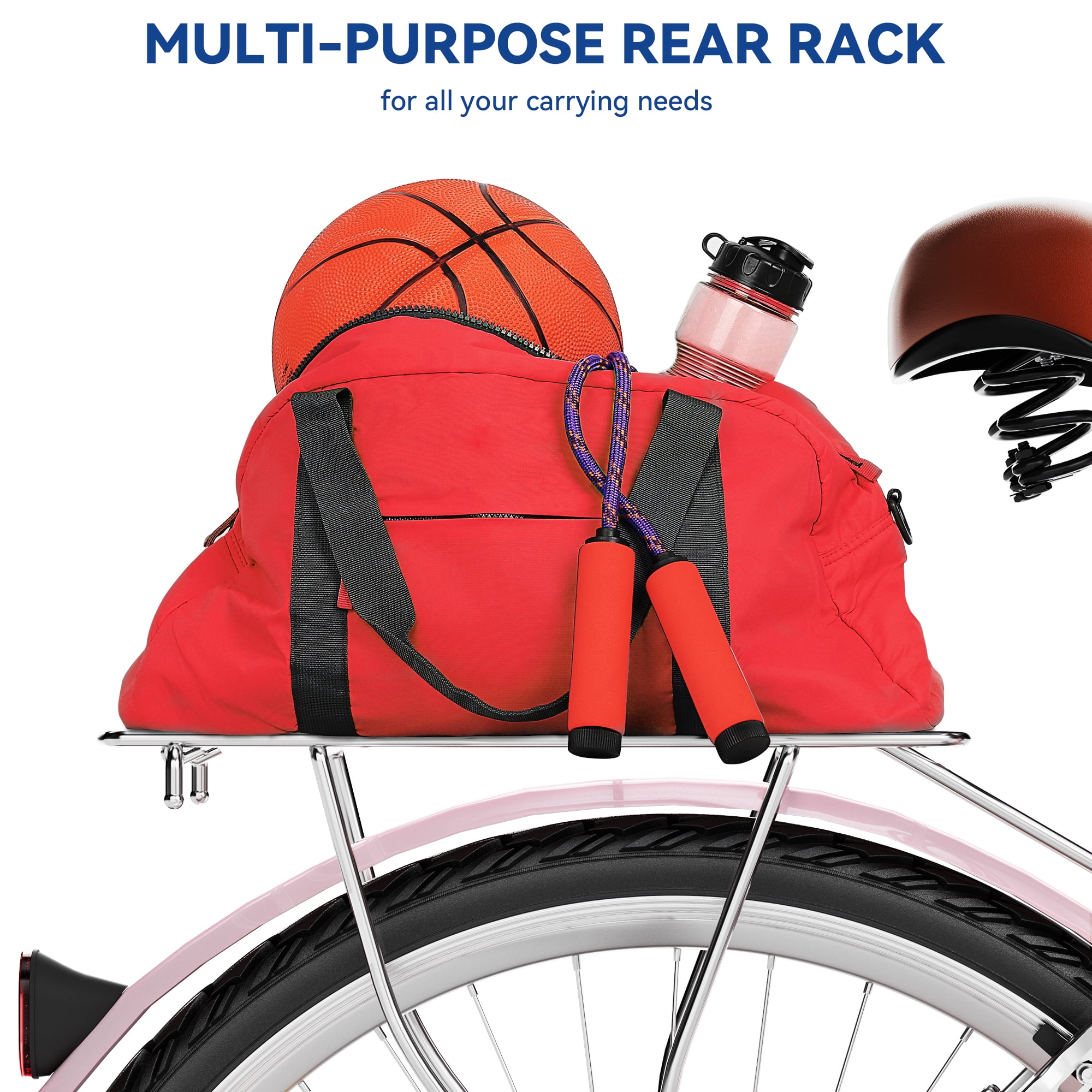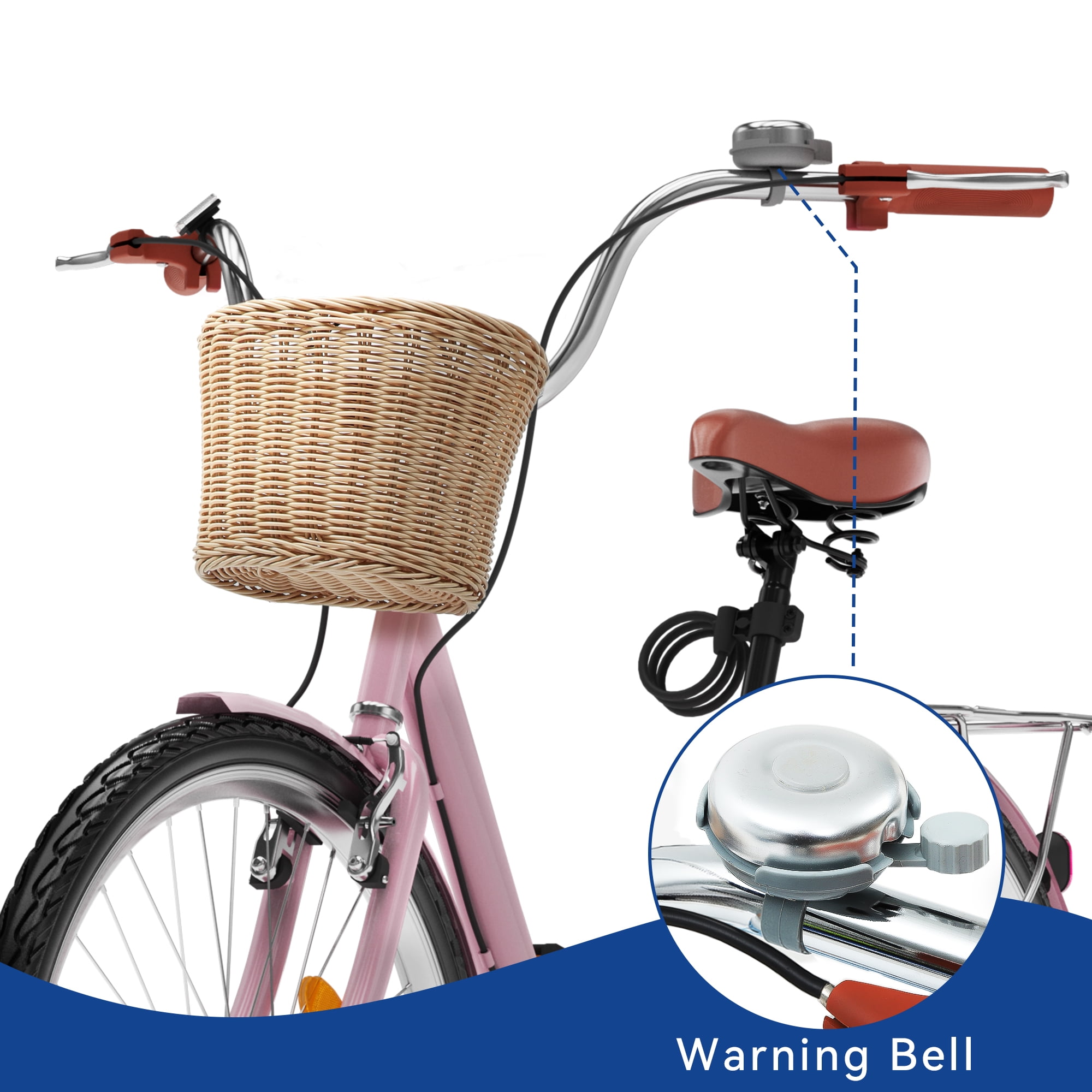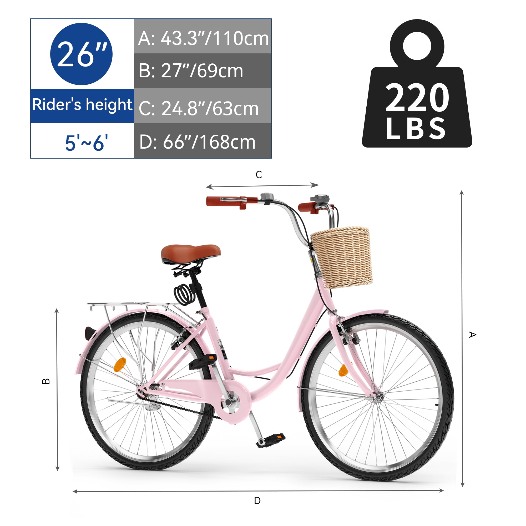 DESCRIPTION Enjoy a smooth and stylish ride with this 26-inch cruiser bicycle, designed for comfort and effortless riding. Featuring a durable steel frame, elegant light pink finish, and a classic imitation rattan basket, this bike is perfect for leisurely rides around town, at the beach, or through the park. Specifications: Color: Light Pink Frame Material: Steel Wheel Size: 26 inches Gears: Single-Speed Brakes: V-Brakes Handlebar & Seat Color: Brown Front Basket: Imitation Rattan Packaging: 7-Layer Corrugated Box, BC Strength 200 Lbf/in² Assembly: Fully Assembled, Includes Tools