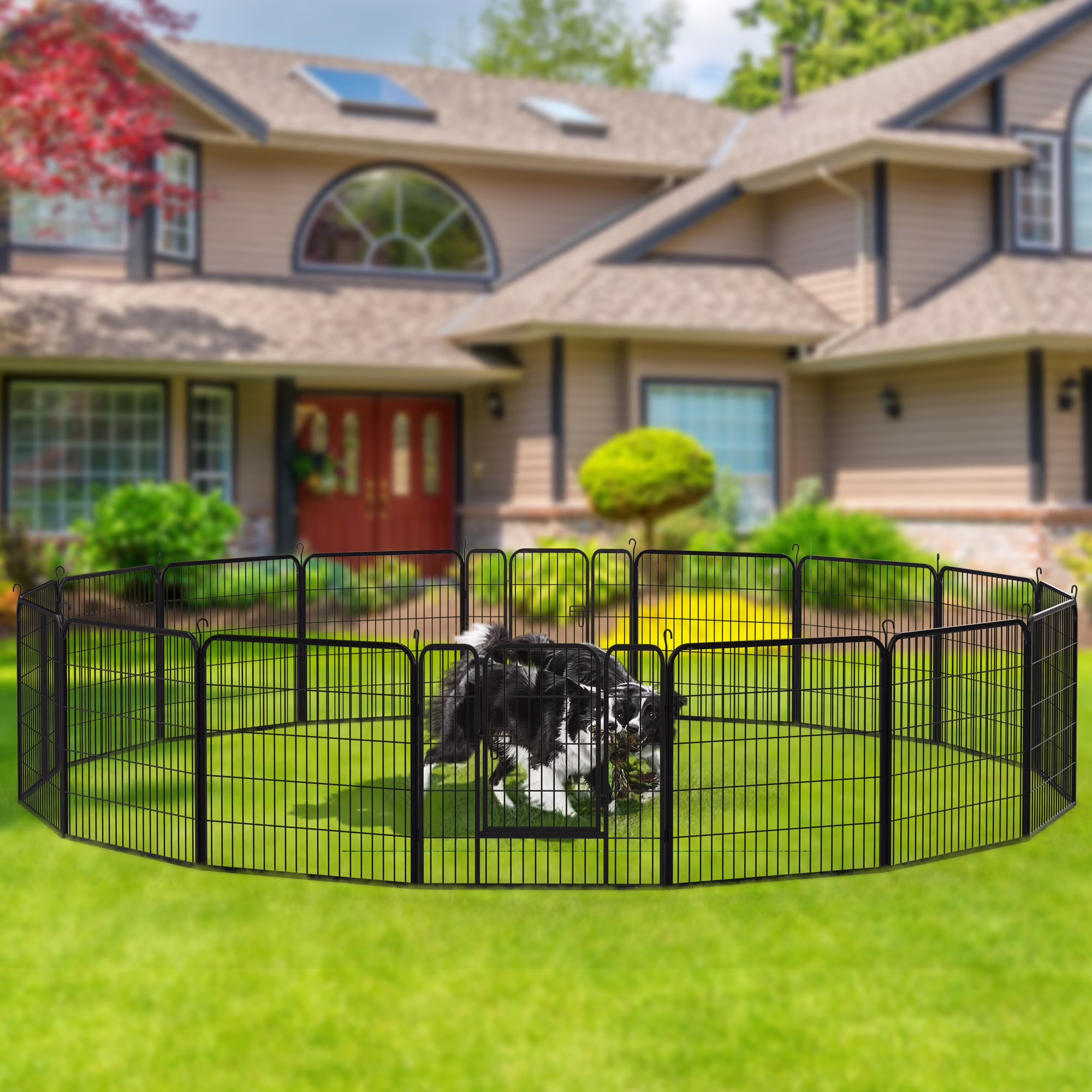 2-in-1 Dog Crate with Divider-The detachable partition design of this dog crate allows you to create two independent spaces or a single large dog cage, accommodating the needs of multiple medium-sized dogs or even more small breeds. Sturdy and Pet-Safe Construction-Crafted from high-quality P2 grade MDF board and 0.7-inch thick steel pipes, this dog crate offers a comfortable, durable, and pet-safe . Effortless Mobility and Cleaning-With 360-degree rotatable locking wheels and pull-out plastic trays, the sturdy steel pipe structure and anti-bite structure design ensure pet-safe durability and long service life,more comfortable, durable and easier to clean. Ample Space for Medium Dogs-The spacious interior of 17″W × 25.5″D × 22.8″H per compartment, along with the 2-inch rail spacing, makes this 37.5″W dog cage ideal for medium-sized canines. Convenient Feeding Features-Equipped with two 360-degree rotatable stainless steel bowls, this multifunctional dog cage makes it easy to feed your pet without opening the front door.