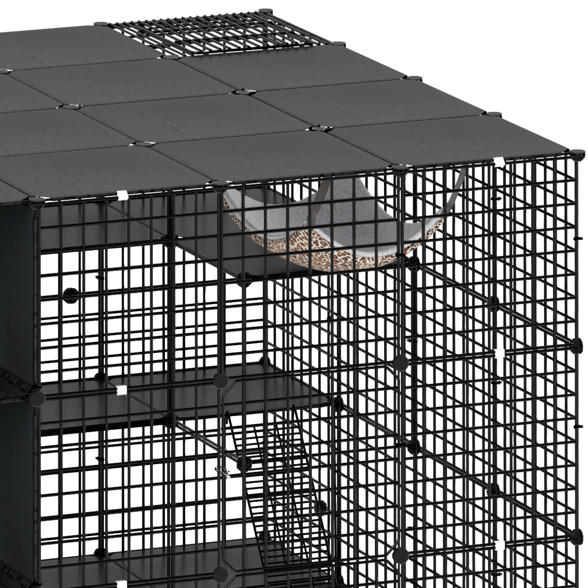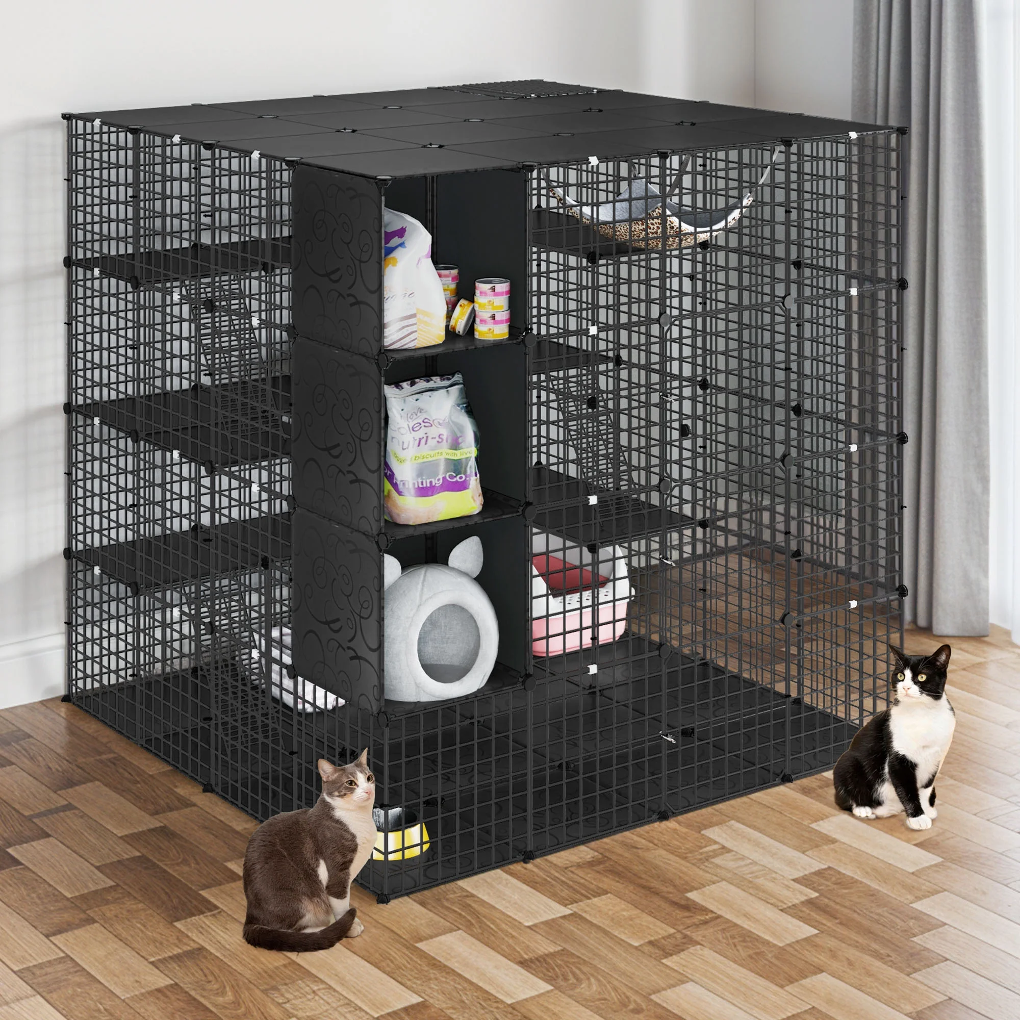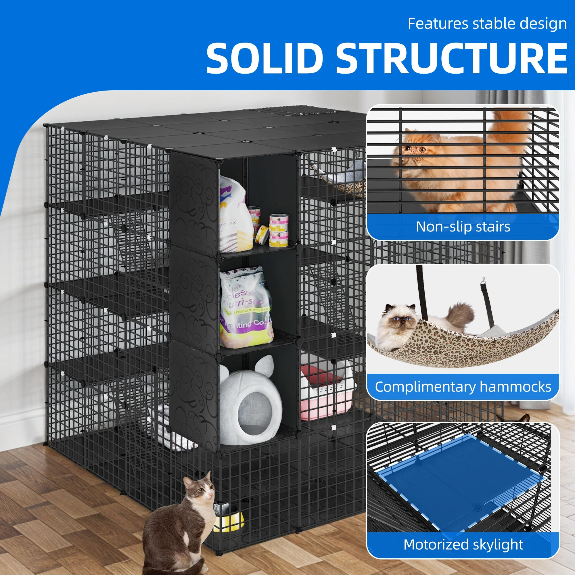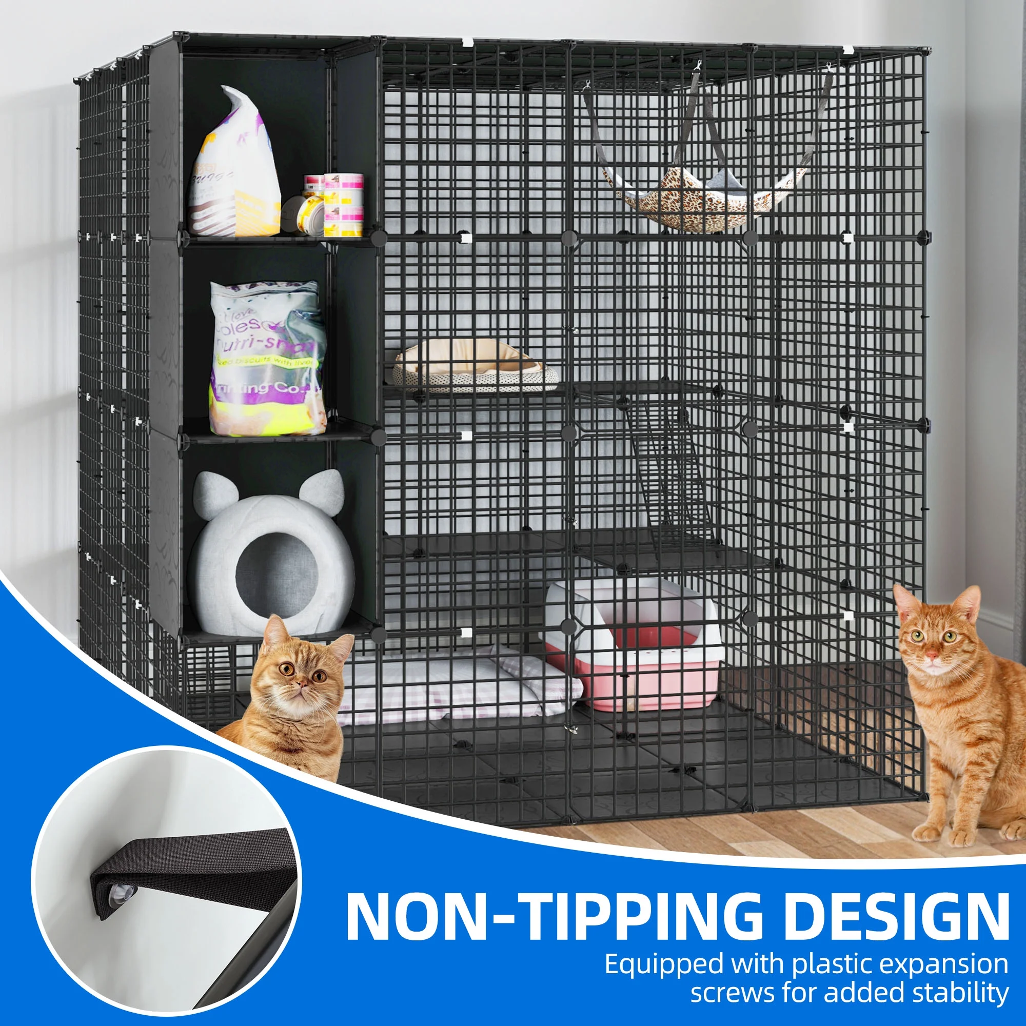 Rock-solid Construction: Made with tough iron mesh and secured with 115 clips, non-slip pads, locks, and wall anchors. This fortress stands strong, no tipping, shaking, or sneaky escapes. Your pets stay secure, and you stay without stress. Fast & Fun Assembly: Create a personalized cat home with 56 wire mesh and 60 embossed panels. Assemble in just 10–30 minutes with included clips and hooks. Tailor the shape to suit your space and pet’s needs. Room to Roam & Explore: With a spacious 55″ x 55″ x 55″ layout, this cage comfortably fits 1 to 4 cats or small animals. Three front doors and a skylight make access a breeze, for feeding, cleaning, or a surprise cuddle session. A Dream Villa for Pets: More than just a cat cage, it’s a luxury play zone, cozy bed, and secure retreat in one. Suitable for use indoors, outdoors, or in RVs. Great for cats, rabbits, ferrets, and even curious pet pigs or squirrels. Comfort Meets Clean Living: Keep your pet’s space spotless with detachable floor mats that resist messes and moisture. A plush hammock adds a fun lounging spot, while the top skylight invites interactive moments between you and your furry companions.