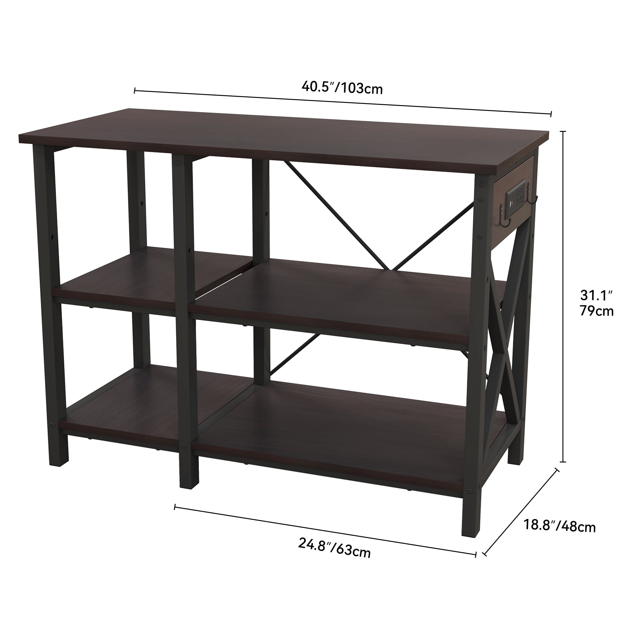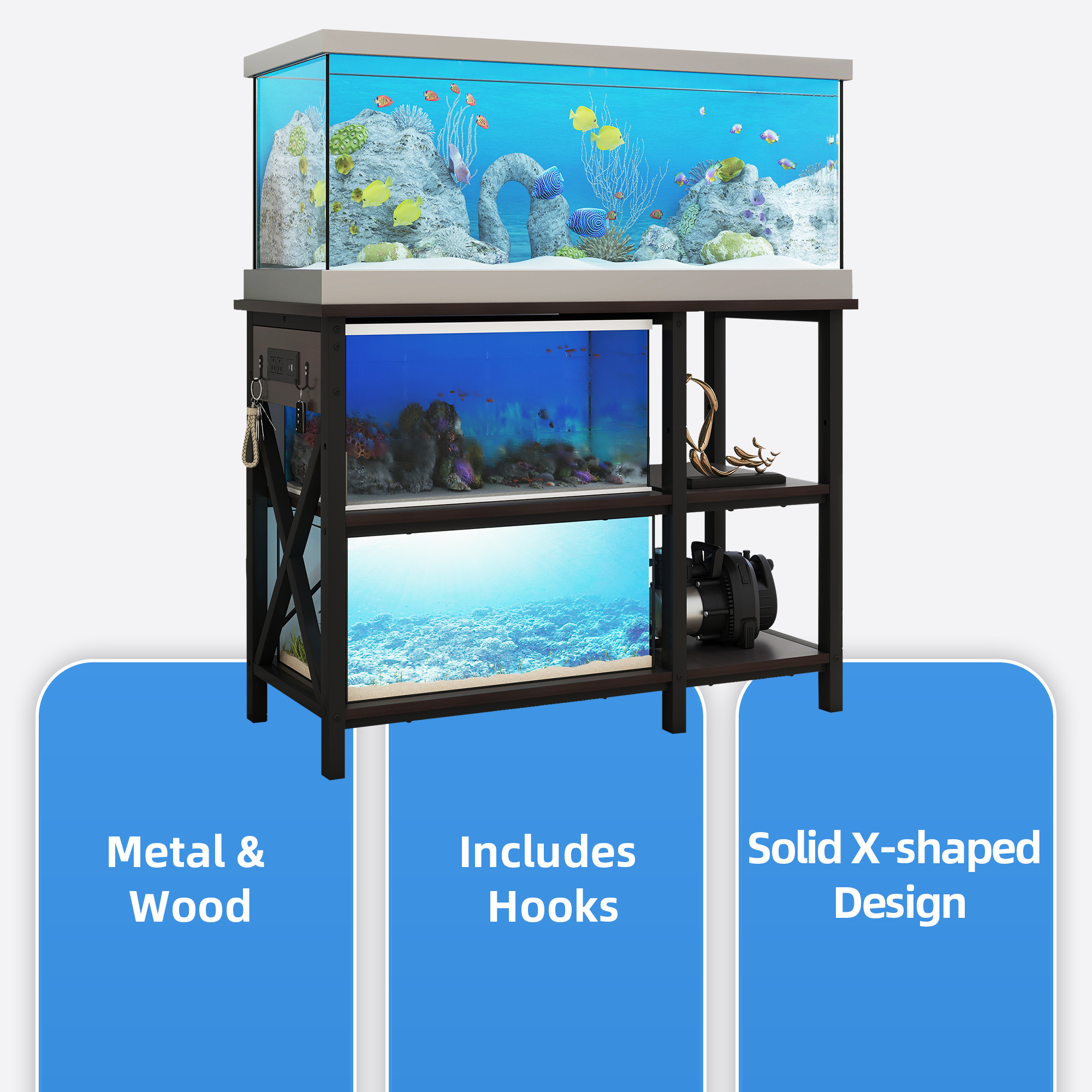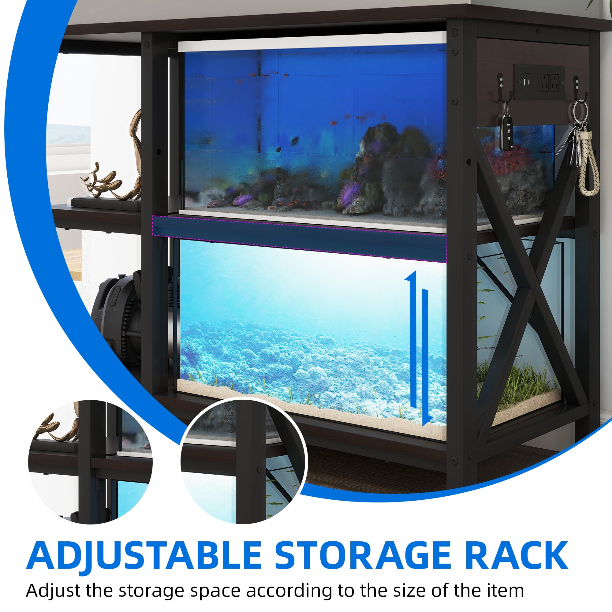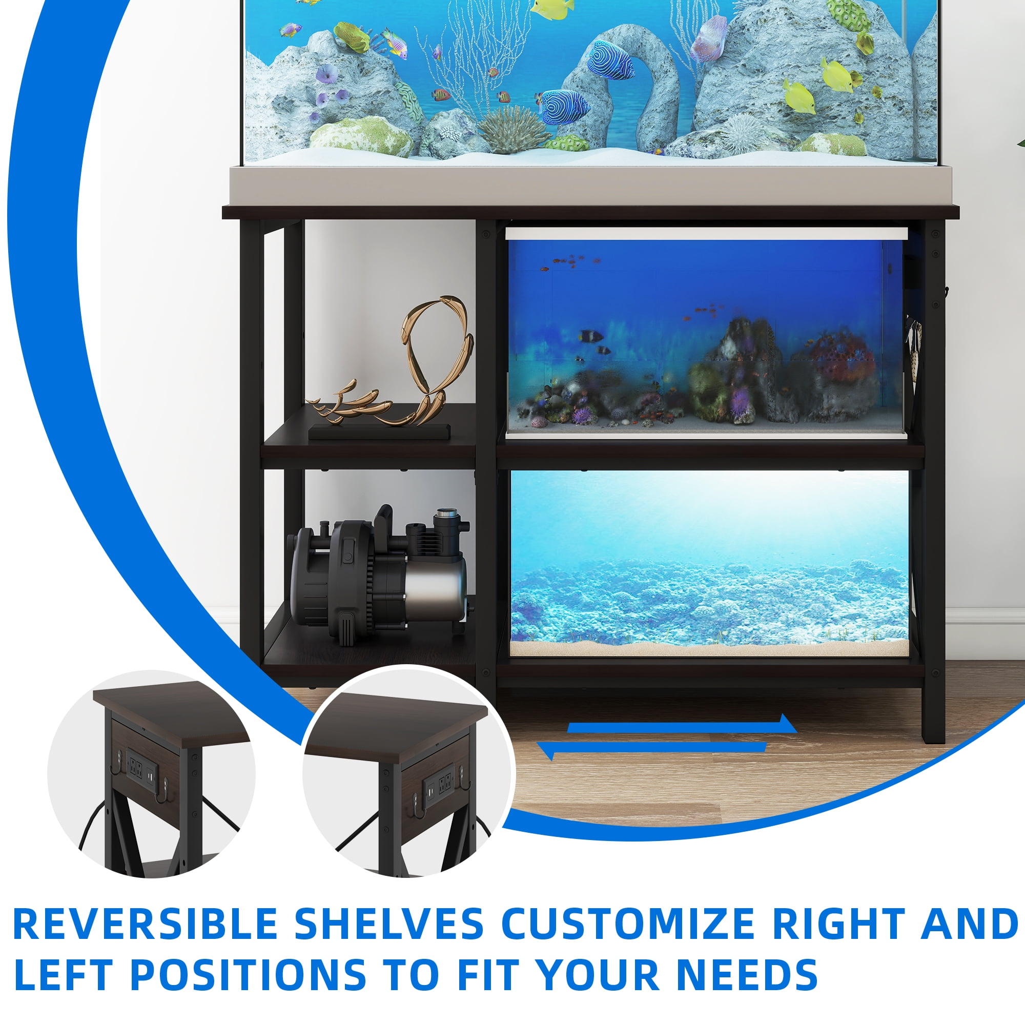 Energy-Efficient Power Management-The 4-in-1 power outlet on this multifunctional aquarium stand allows you to conveniently power and charge your devices, while maintaining optimal control over your aquatic or reptile habitat’s electrical needs. Customizable Placement for Accessibility-The dual-side setup option on this 40-gallon tank stand enables you to position the shelves and outlets in a way that suits your specific needs, optimizing power cord placement and ensuring accessibility for both left-handed and right-handed users. Robust and Spacious Design-Crafted with a durable iron frame and engineered wood, this 50-gallon fish tank stand offers exceptional stability, capable of supporting weights up to 700 lbs, while providing ample room for a thriving aquatic environment. Versatile Storage Solutions-The Uforic 3-tier adjustable storage shelves on this fish tank stand provide ample space for organizing a wide range of aquarium accessories, from canister filters to substrates, decorations, fish food, and more, ensuring a clutter-free and efficient setup. Versatile Size Accommodations with Bonus Tank-The 40.55”L x 18.9”W x 31.1”H fish tank table can accommodate 40-50 gallon tanks, and the second level even holds a small 10-gallon fish tank, allowing you to create a cohesive and visually appealing setup that seamlessly blends into various living spaces.