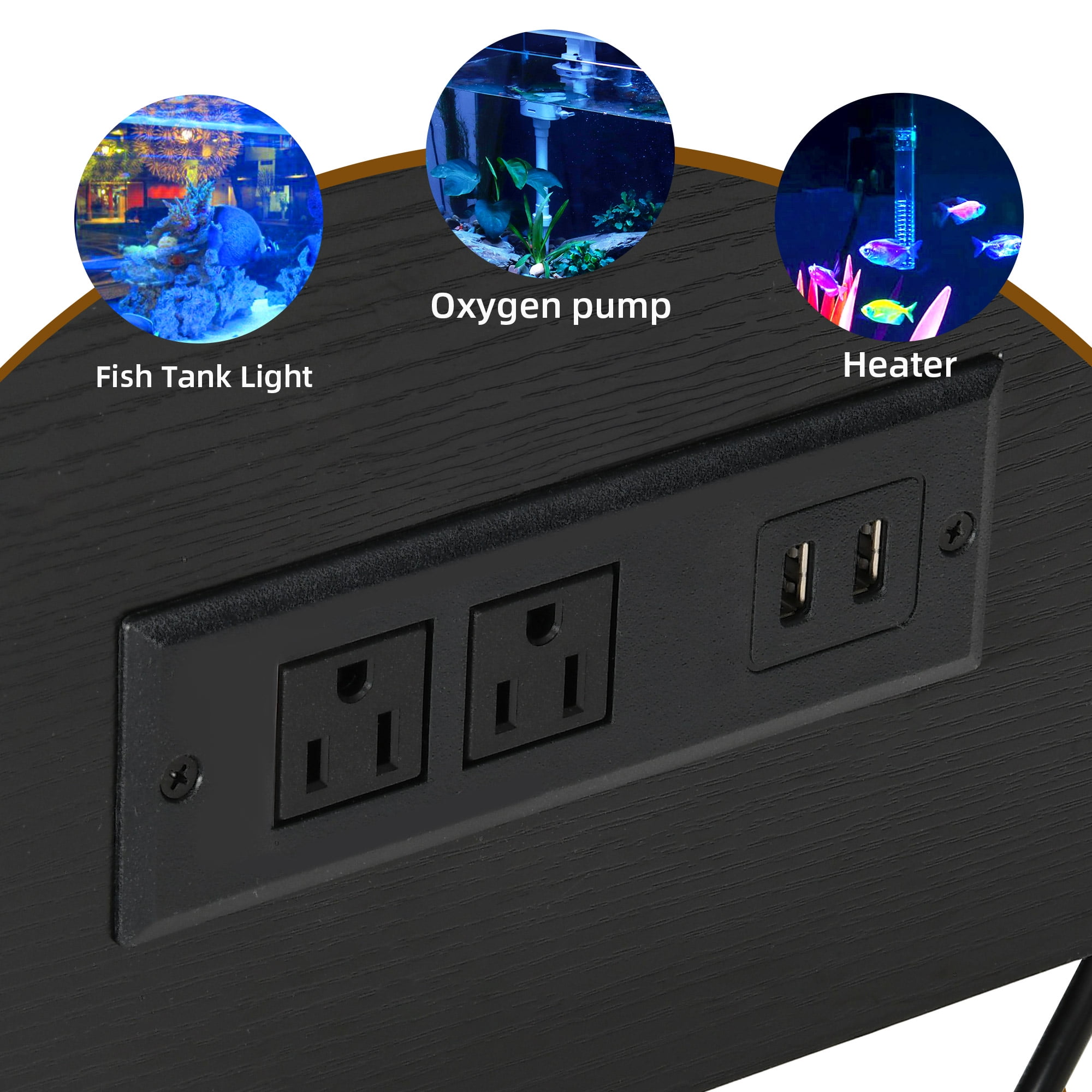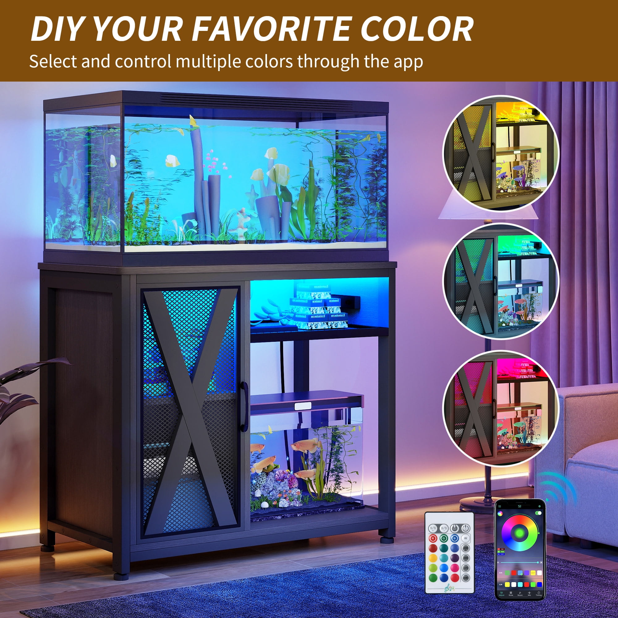 Durable and Safe Construction: Built with thickened table legs, this fish tank stand can support up to 680 lbs, providing outstanding stability and reliability. Anti-tip devices ensure added safety, while moisture-resistant material guarantees long-lasting durability. Practical Power Outlets: This stand includes integrated power outlets, making it easy to connect electronic devices like lights, heaters, and oxygen pumps without the need for extra tools, simplifying your aquarium setup. Efficient Dual-Tank Design: Featuring a 2-in-1 design, the stand accommodates both a 40-50 gallon fish tank on top and a 5-10 gallon aquarium on the bottom, saving space and maximizing functionality for your aquatic setup. Organized Storage Solutions: With an adjustable shelf and built-in cabinet, you can neatly store fish food, cleaning tools, and other accessories, helping to maintain an efficient and organized space for your aquarium needs. Illuminating RGB LED Lights: The stand comes with RGB LED lights, adding customizable lighting to both the cabinet and the area above the smaller tank. Set the perfect ambiance for your aquarium and enhance its visual appeal.