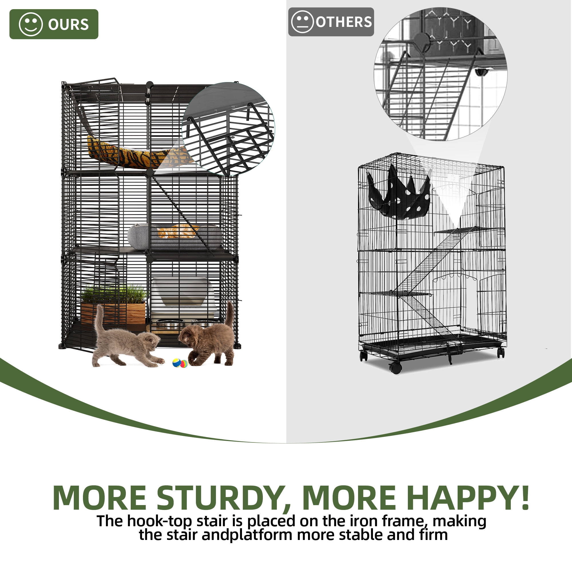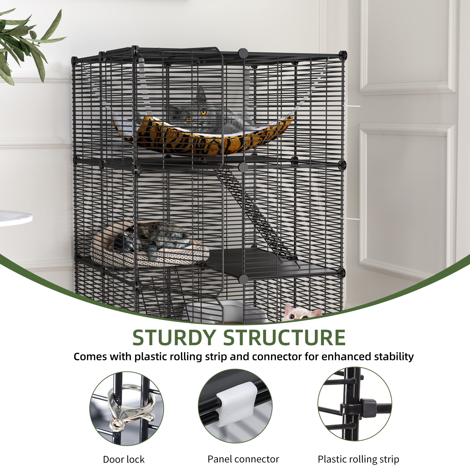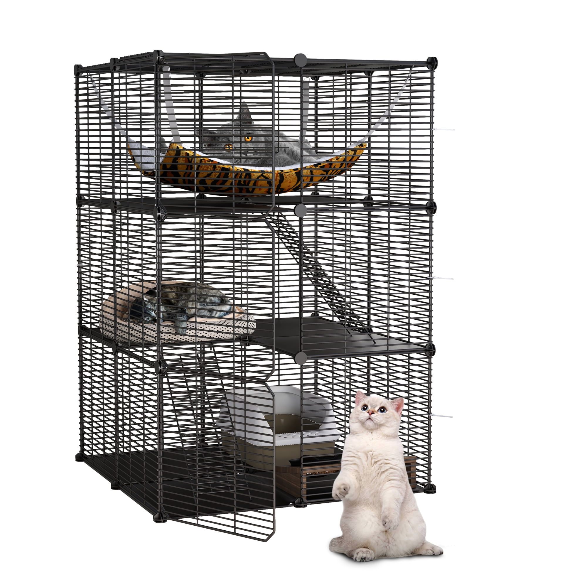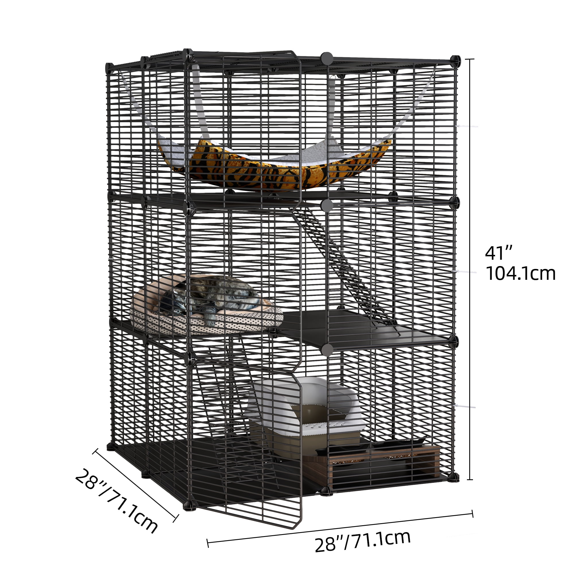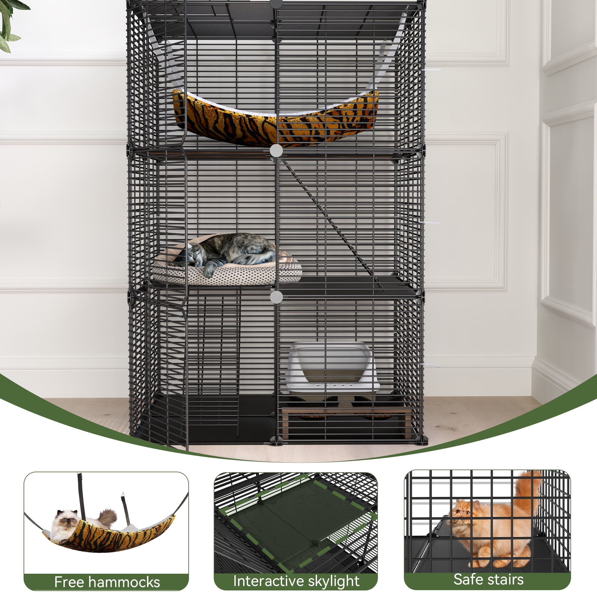 Sturdy and Safe: The solid accessories of this cat cage ensure the safety and comfort of your furry friends. The smooth and sturdy platforms won’t hurt your cat’s tender paws, while the hook-top stairs can be securely positioned on the iron frame, creating additional spots for exploration. Spacious and Convenient: With dimensions of (28 x 28 x 41) inches, this cat enclosure offers ample space for 1-2 cats to play and rest comfortably. It features three front doors and a top skylight for easy cleaning, entering, feeding, and convenient interactions with your pets. The detachable black floor mats ensure cleanliness, and the sturdy black iron frames provide stability and prevent scattering or tilting. Large Hammock: Enjoy the added amusement of the plush hammock included in this versatile cat home. It’s not only perfect for cats but also suitable for other small animals like guinea pigs, ferrets, rabbits, and chinchillas. Provide a cozy space for relaxation and play. Versatile Indoor and Outdoor Use: This cat playpen is suitable for both indoor and outdoor environments. Whether in your bedroom, living room, cat yard, or during travel in RVs, it provides a versatile space for your pets to enjoy. With easy assembly, you can quickly set up the kennel and provide enrichment for your small animal pets. Customizable Design: Create your own cat apartment or cat cage with the flexible assembly of this cat enclosure. Tailor-make it according to your aesthetic preferences, shape, or size needs. It provides a safe haven for your kittens, ensuring their comfort and security.