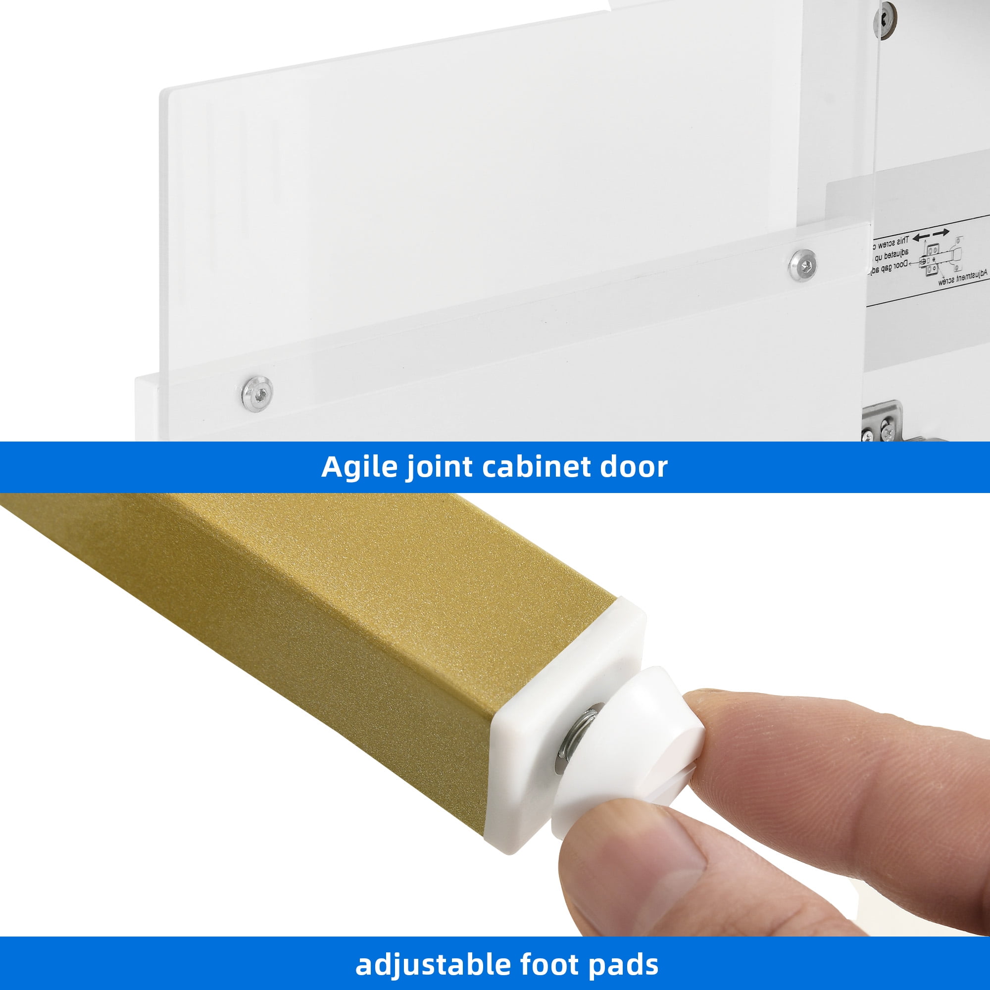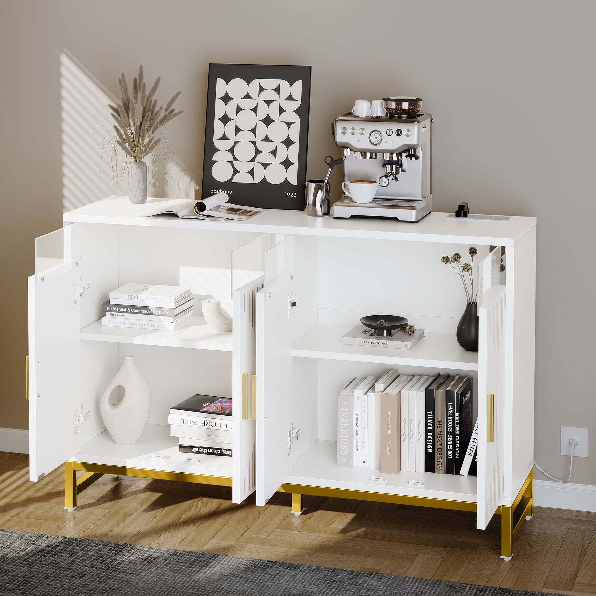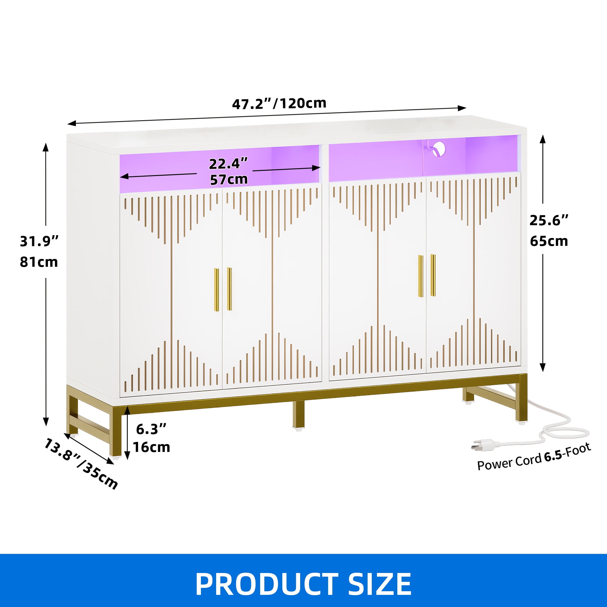 Stylish Grace: Elevate your decor with our 47″ wood buffet cabinet, featuring a sleek white finish and gold metal handles and legs. Line-carved doors with acrylic accents infuse sophistication and style into any space. Radiant LED Lighting: Light up your space with a built-in LED strip, managed by remote or app. Easily adjust the ambiance for a soothing retreat or lively gathering, tailoring the lighting to suit any mood. Efficient Charging: Easily power up your devices with 2 AC outlets and 2 USB ports. This large buffet cabinet offers practical storage and tech solutions, making it simple to stay connected and well-organized. Ample Storage Space: Are you struggling with changing storage needs? This cabinet is your solution! With 2 roomy compartments and adjustable shelves, it’s ideal for utensils, dishes, and more. Everything has its place with ease. Built to Endure: Crafted from robust engineered wood, our cabinet ensures years of dependable use. Designed with a non-tipping buckle and an additional center support leg for enhanced stability, it ensures secure placement and peace of mind.