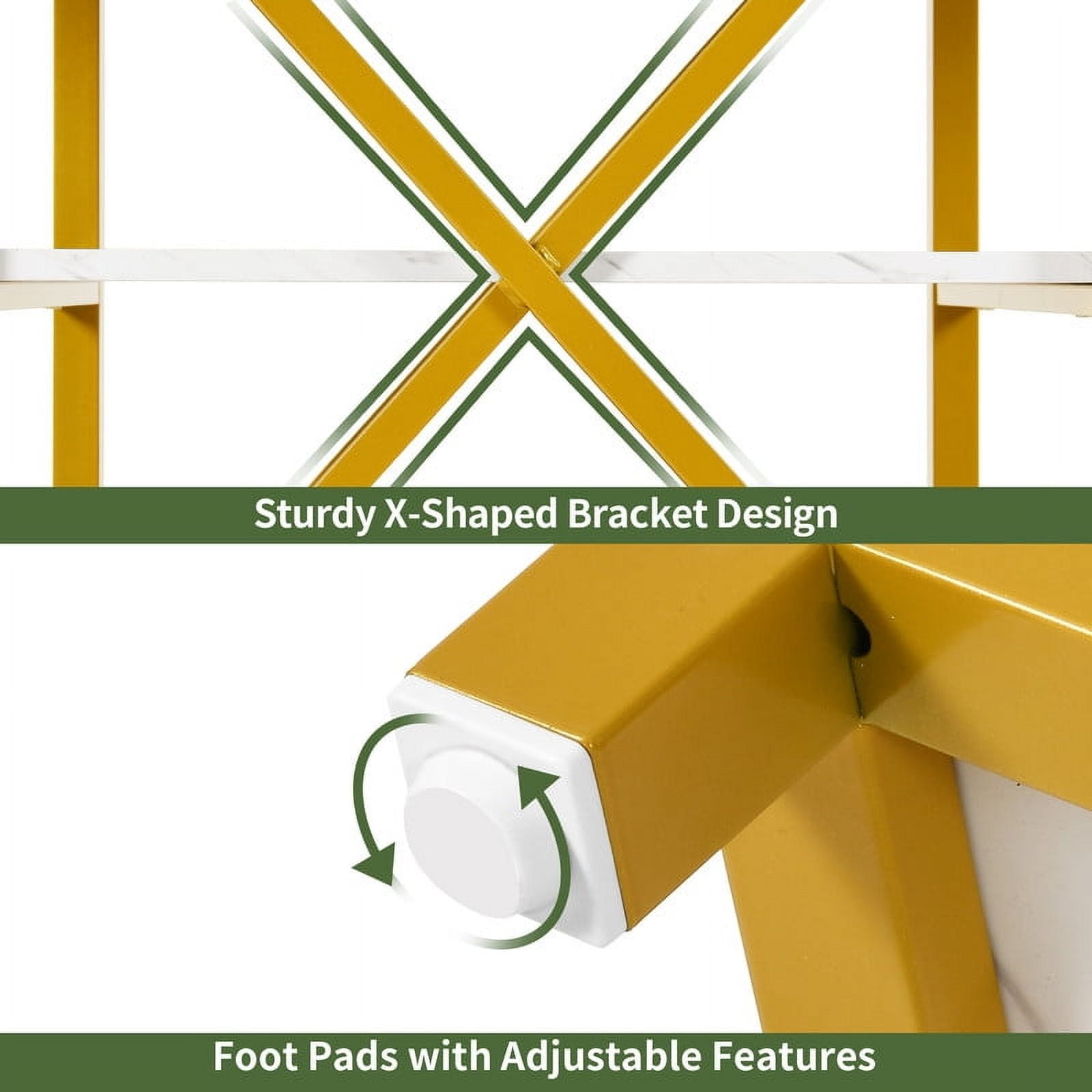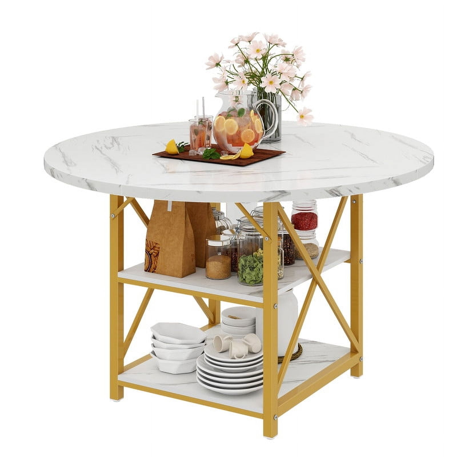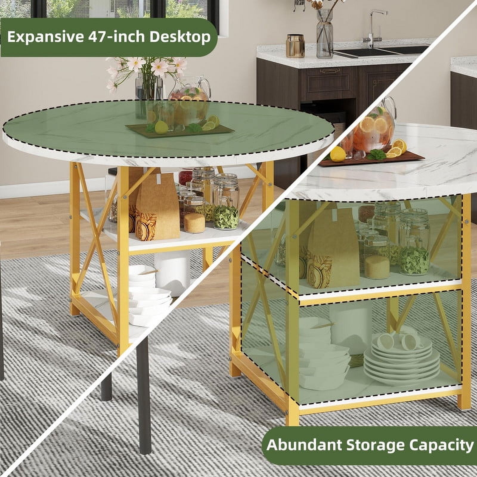Heart of the Home: Our round dining table is the centerpiece of every meal. Ideal for family dinners, brunches, and casual get-togethers, its spacious design fosters warmth and invites memorable moments, making every gathering special and enjoyable. Generous & Practical: Our dining table features a roomy surface that comfortably seats up to 4 people. With 2 open storage areas, it keeps cups, small plates, and snacks within easy reach, making dining and organization a breeze. Chic & Robust: Our round dining table, with its white marble top and golden iron frame, merges lasting strength with upscale design. Enjoy a blend of modern sophistication and practical functionality in your dining space. Dependable & Scratch-Guard: Our dining table includes an X-shaped bracket for steadfast stability and adjustable foot pads that guard against floor scratches. Enjoy a secure and stylish dining setup. Smooth Installation: Featuring clear and concise instructions, our round dining table makes assembly a breeze. Enjoy a rapid setup and start relishing meals at your modern, stylish dining table.