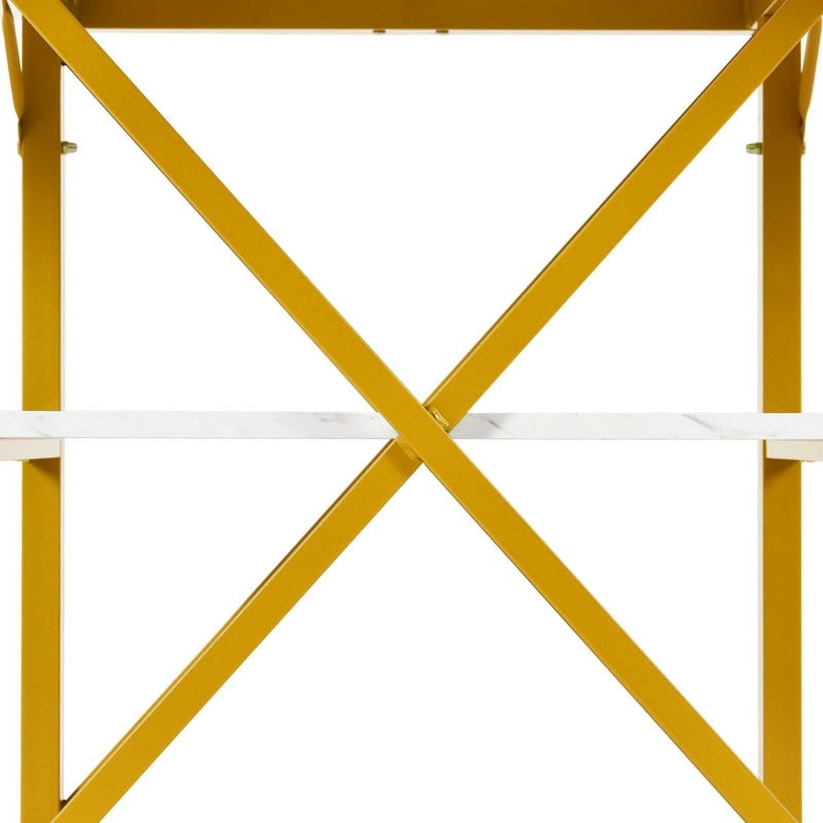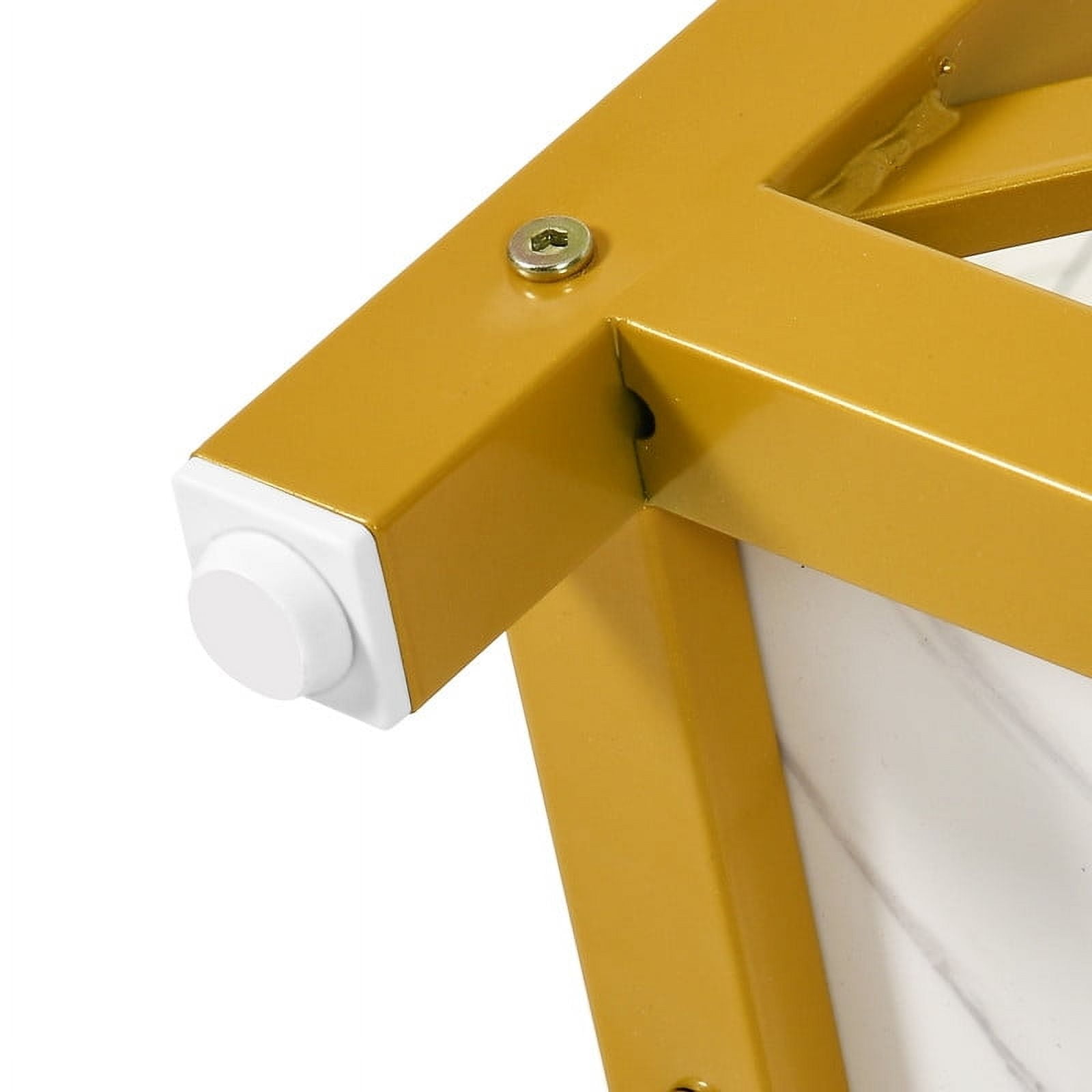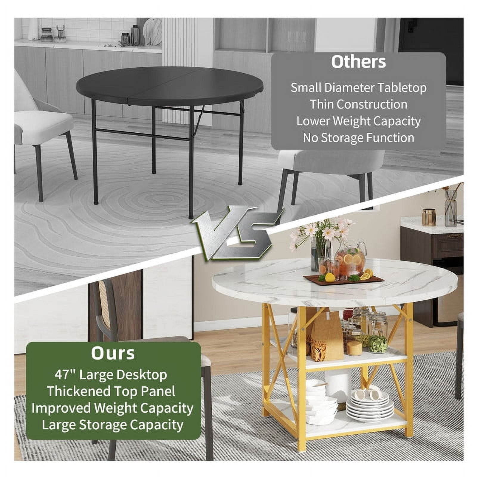 Heart of the Home: Our round dining table is the centerpiece of every meal. Ideal for family dinners, brunches, and casual get-togethers, its spacious design fosters warmth and invites memorable moments, making every gathering special and enjoyable. Generous & Practical: Our dining table features a roomy surface that comfortably seats up to 4 people. With 2 open storage areas, it keeps cups, small plates, and snacks within easy reach, making dining and organization a breeze. Chic & Robust: Our round dining table, with its white marble top and golden iron frame, merges lasting strength with upscale design. Enjoy a blend of modern sophistication and practical functionality in your dining space. Dependable & Scratch-Guard: Our dining table includes an X-shaped bracket for steadfast stability and adjustable foot pads that guard against floor scratches. Enjoy a secure and stylish dining setup. Smooth Installation: Featuring clear and concise instructions, our round dining table makes assembly a breeze. Enjoy a rapid setup and start relishing meals at your modern, stylish dining table.