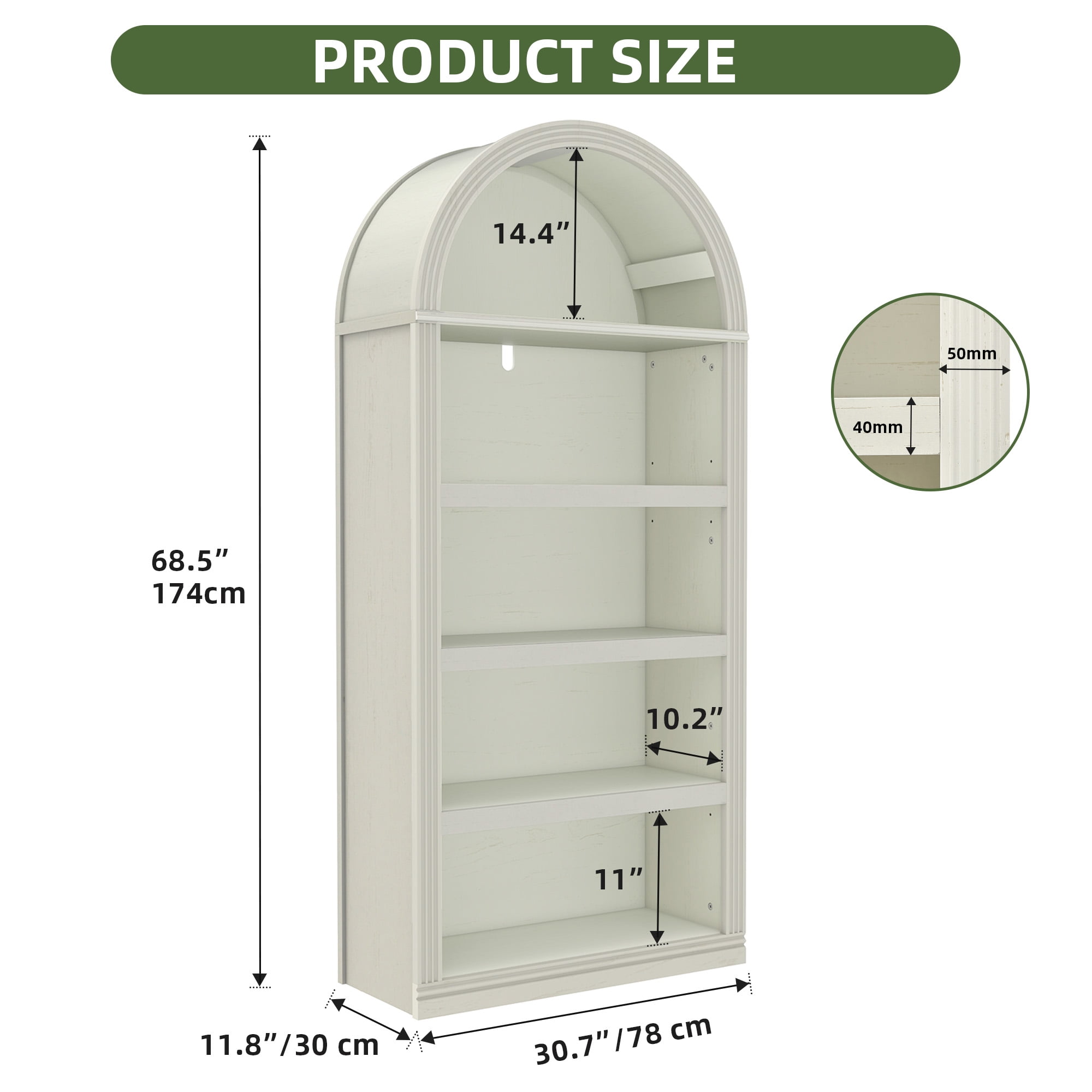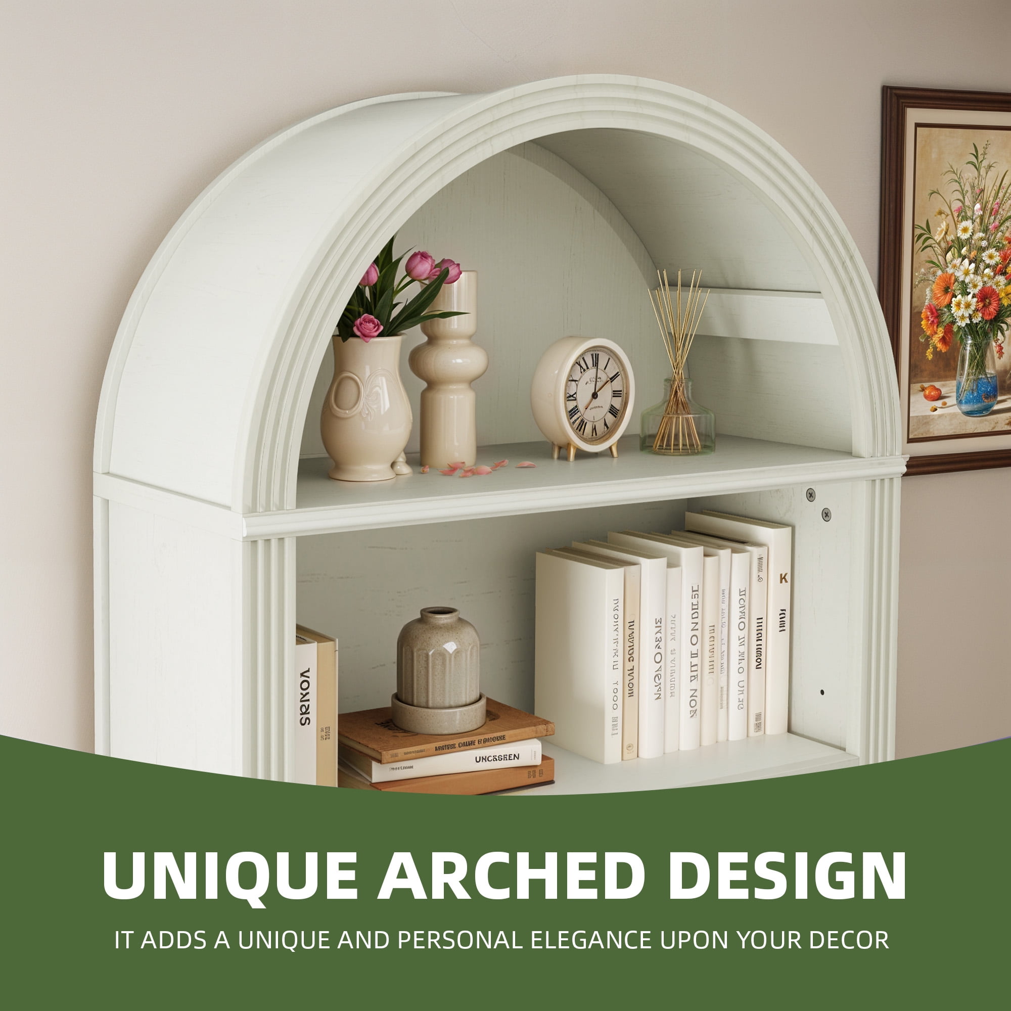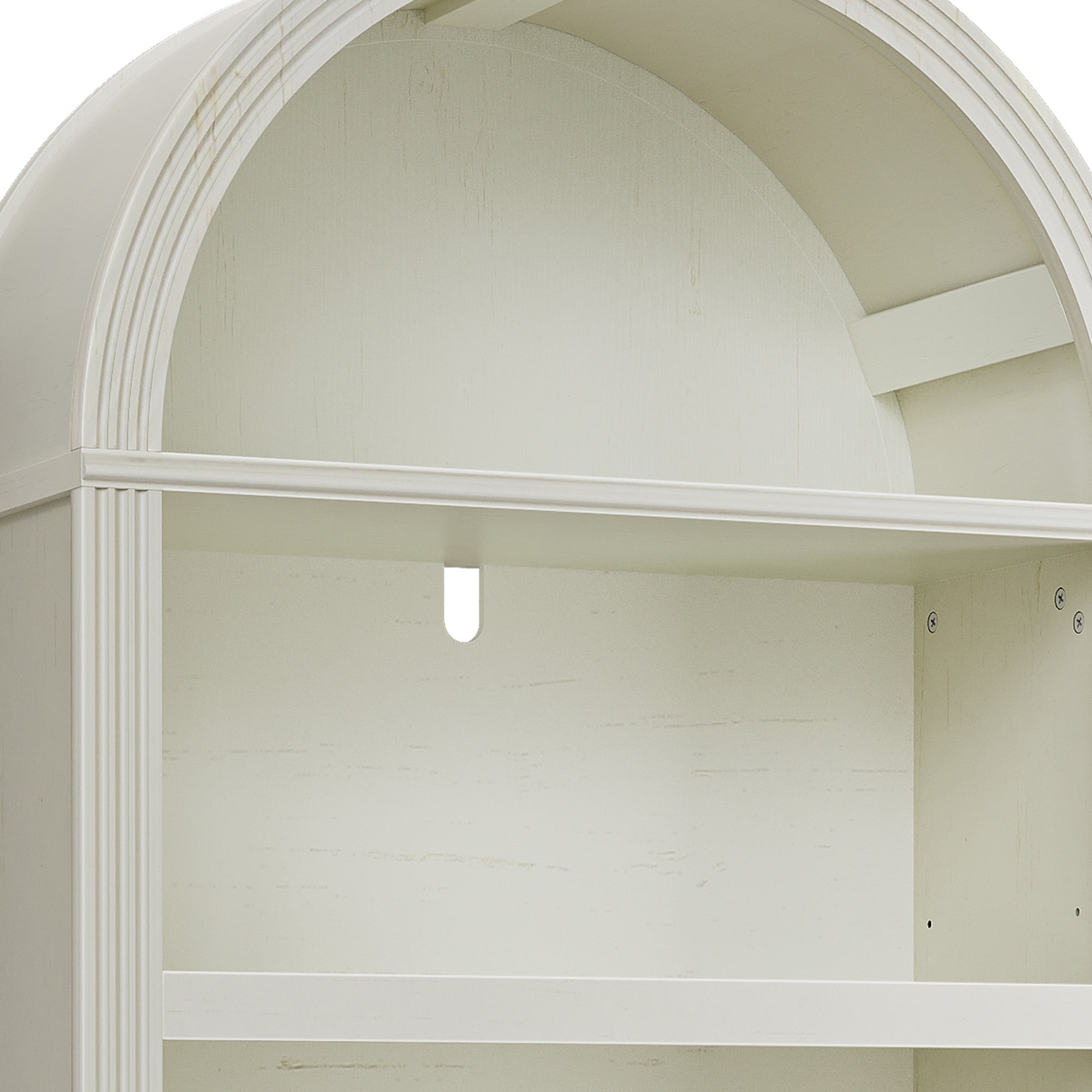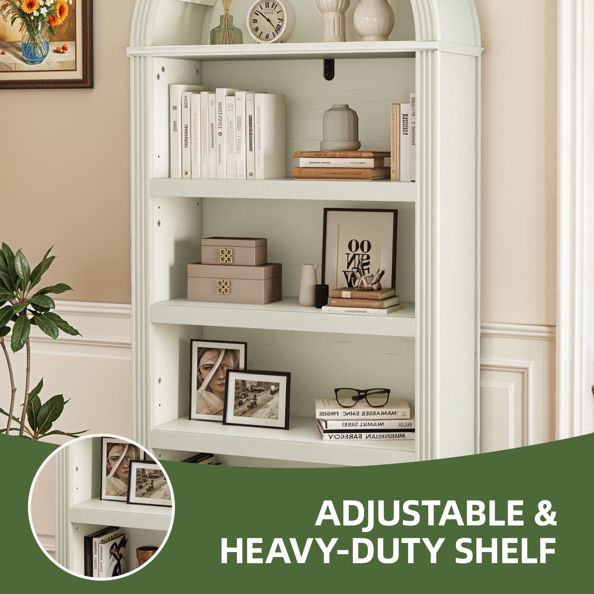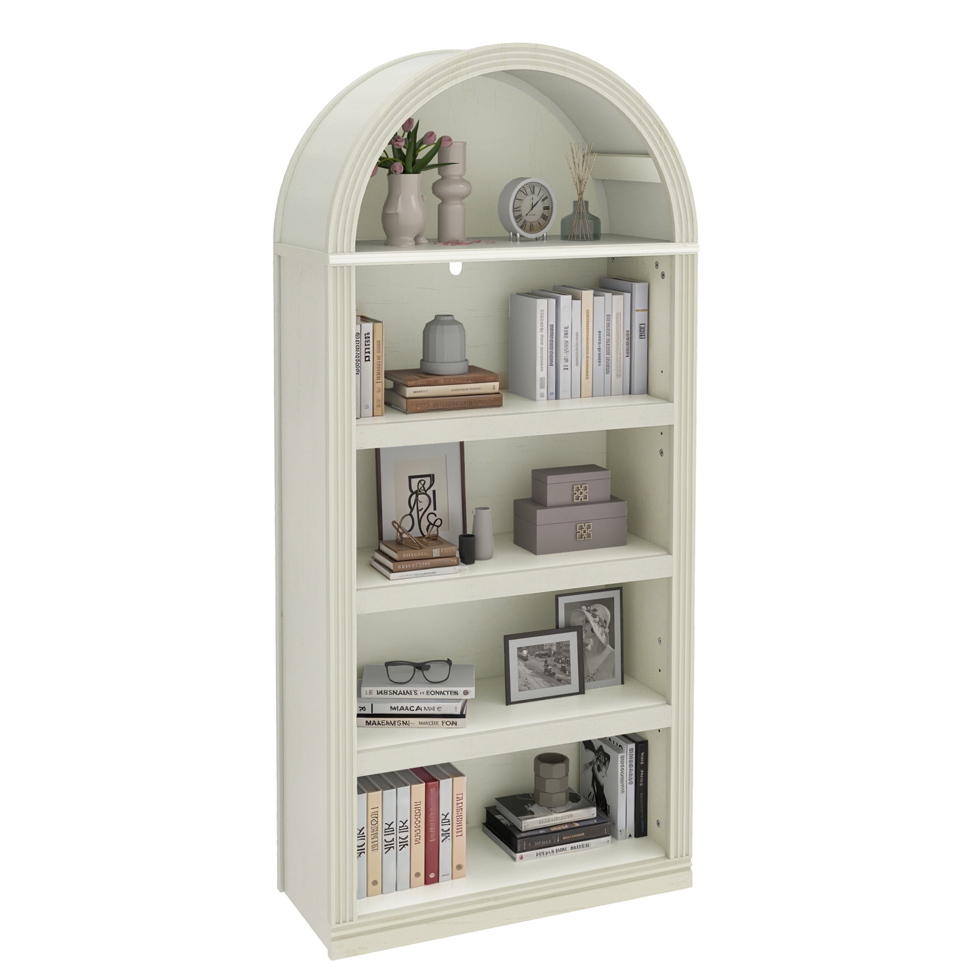 Elegant Arched Design: A gracefully curved top and fluted panels offer timeless charm. Finished in antique white, this bookcase blends classic craftsmanship with modern and vintage decor, adding character and sophistication to your space. Stable & Easy to Assemble: Comes with pre-installed leveling feet for floor protection and a non-tipping kit for added stability. With clear instructions and included hardware, assembling this elegant bookshelf is quick and effortless. Spacious & Adjustable Storage: Featuring five open shelves, this tall bookshelf provides ample space for your essentials. The adjustable top and bottom shelves offer three height levels, allowing you to tailor storage for a personalized display. Versatile for Any Space: More than just a bookshelf, this arched bookcase serves as a display shelf, storage rack, or elegant accent piece. Its modern minimalist finish seamlessly blends into living rooms, offices, bedrooms, or study spaces. Sturdy Construction: Built with robust MDF, and a reinforced base, this bookshelf is designed for durability. The fully edged laminate finish enhances longevity while ensuring resistant to wear and tear.