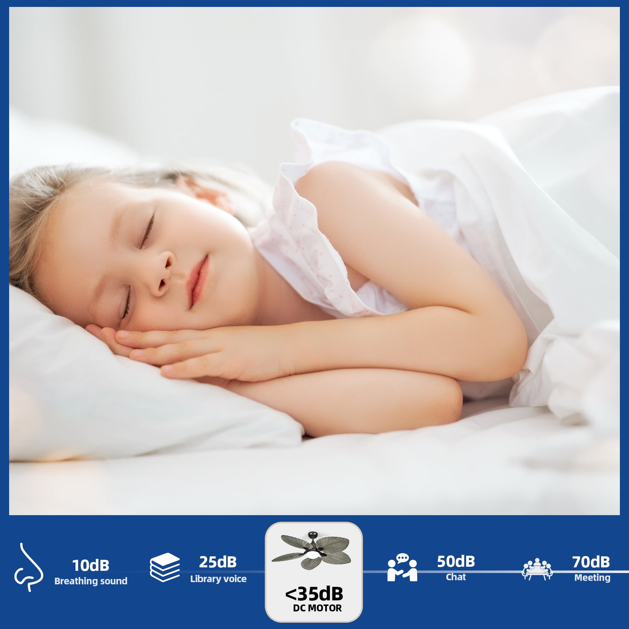 Whisper-Quiet DC Motor: Equipped with a highly efficient DC motor that operates quietly at noise levels below 35 decibels. This motor is more energy-efficient compared to traditional AC motors, ensuring a peaceful and comfortable environment. Reversible Function: Easily switch between forward and reverse modes to suit summer and winter conditions. This helps regulate room temperature, conserve energy, and extend the lifespan of the fan. Six speed settings and a natural wind mode allow for customized airflow, from powerful cooling to gentle breezes. Stylish Tropical Design: Features a baked black body with 5 faux wood grain palm leaf ABS blades and a glass lampshade, bringing a unique tropical island vibe to your space. ETL and FCC certified for safety. Versatile Remote Control: The multi-functional remote control includes 5 timer settings (1, 2, 4, 8, and 12 hours) for automatic shut-off. It also features a sleep mode that cycles through 1-3 wind speeds to provide optimal comfort during sleep. Adjustable LED Light: The integrated LED light fixture offers 18W brightness (1500lm) with three adjustable color temperatures (3000K, 4500K, and 6000K). The memory function retains your last-used setting, eliminating the need for constant readjustment.