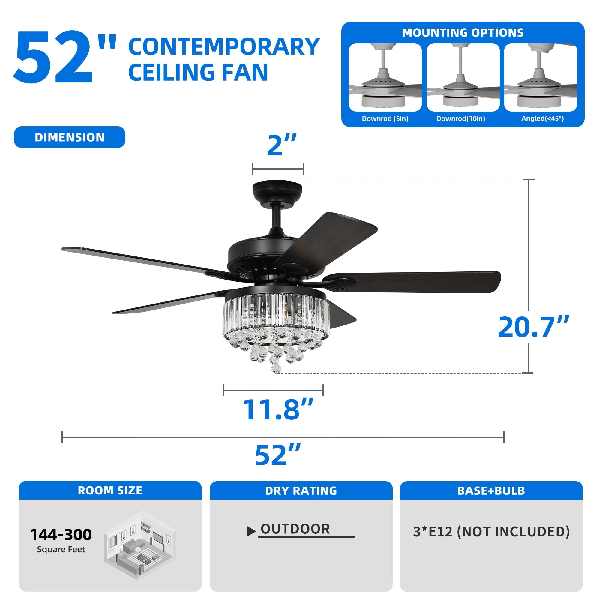 Add a touch of elegance to your space with the Chandelier Ceiling Fan with Remote. This 52 Inch Crystal Fan Light combines the functionality of a ceiling fan with the beauty of a chandelier, perfect for indoor settings. With 3 speed settings, you can easily adjust the airflow to suit your comfort. The silent, reversible motor allows for year-round use, while the dual-sided blades offer versatility in style. The included timer and balance kit ensure convenience and stability, making this fan a sophisticated choice for any room. Specifications: Color: Black Room Type: Porch, Patio, Bedroom, Livingroom, Dining Room,Kitchen Mounting Type: Downrod Mount Controller Type: Remote Control Dimensions: 52″ L x 52″ W x 20.7″ H Numbers of Blades: 5 Blade Material: wood Fan by Space: 144-300 square feet Fan Wattage: 65W Bulb Type: E12 x 3 (Not Included) Battery Type: 12V 23A (Not Included) Package Includes: 1 x Ceiling Fan 1 x Remote Control (Battery Not Included) 1 x Instructions Manual