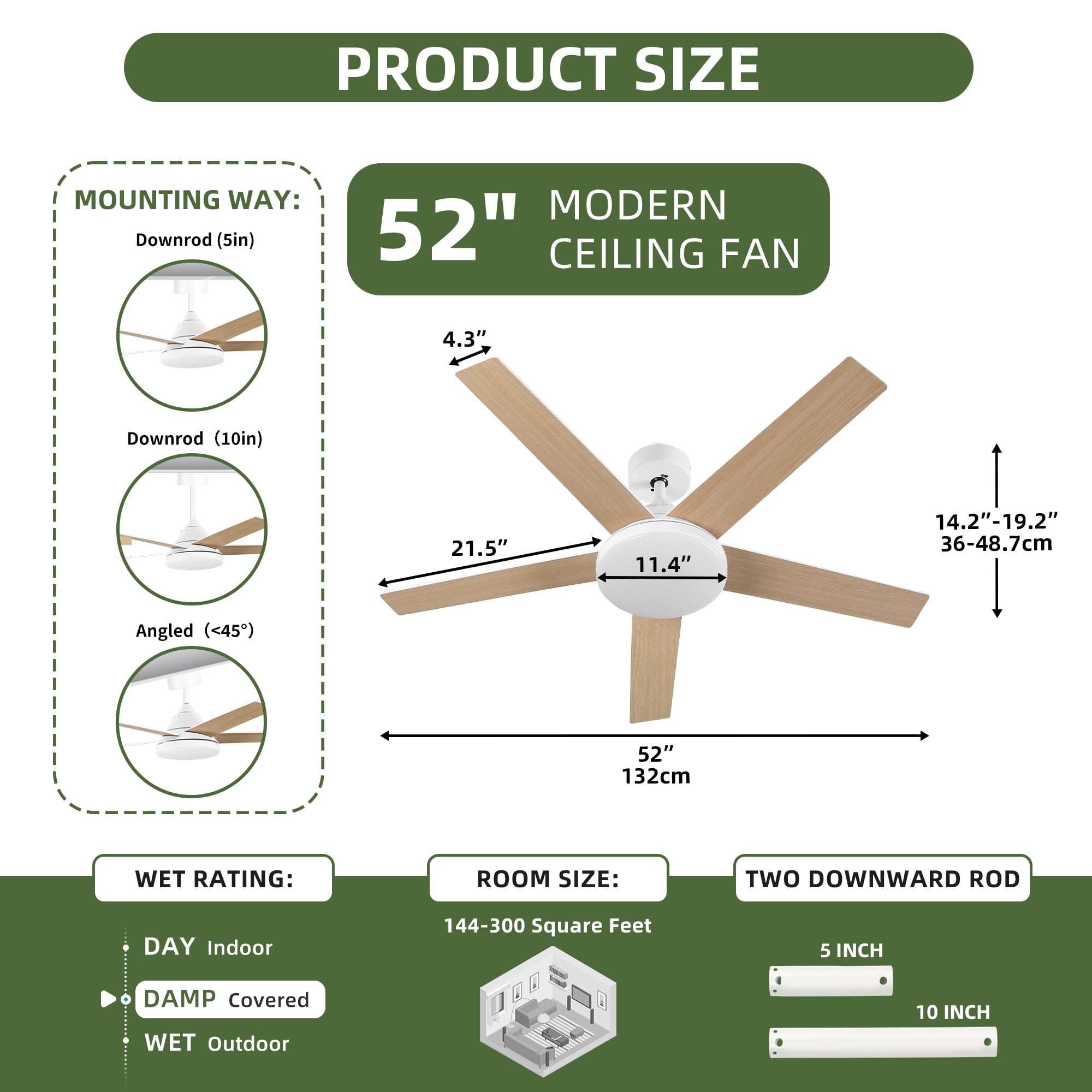 Uforic 52″ Downrod Ceiling Fans with Light and Remote Control,5 Blades Outdoor Ceiling Fan – White