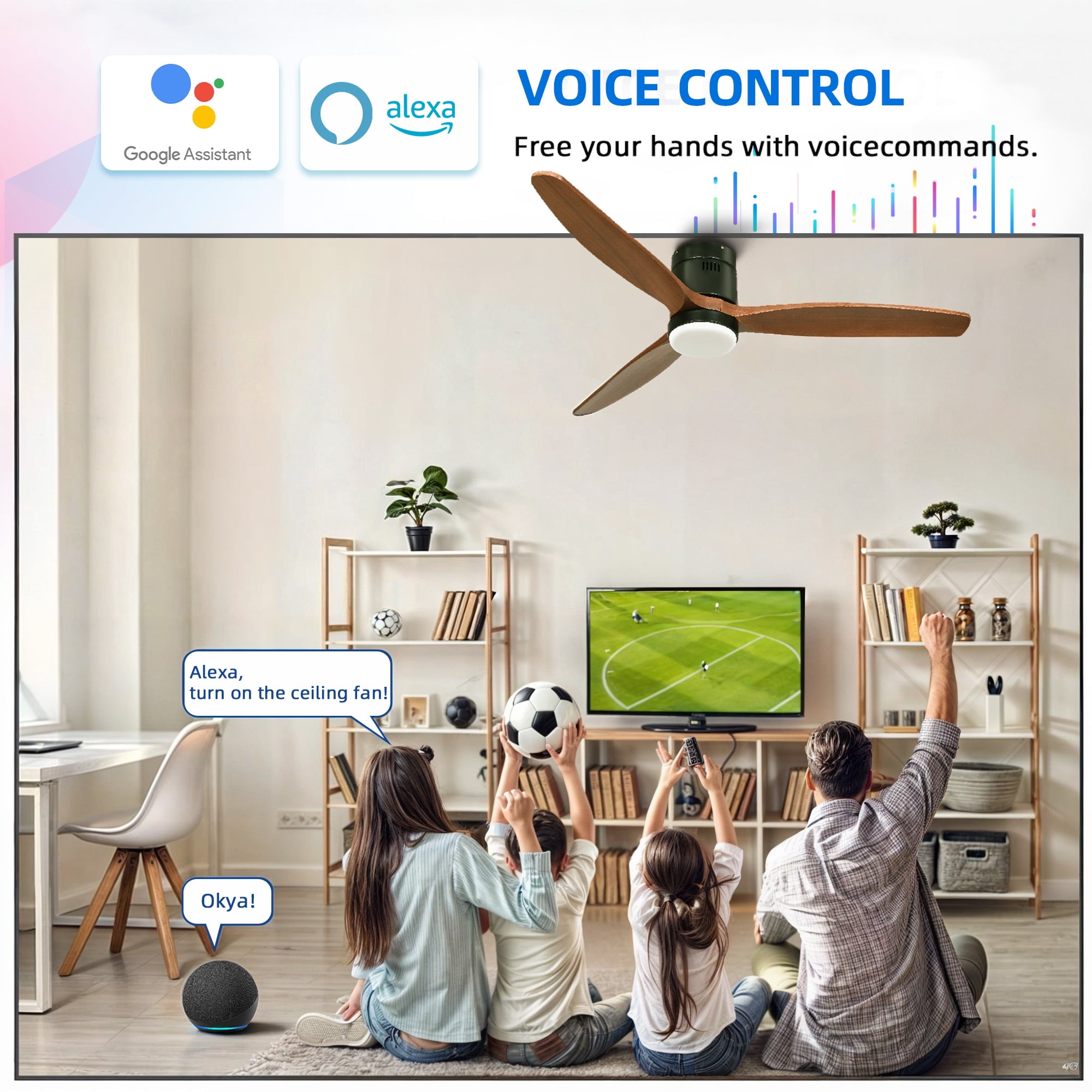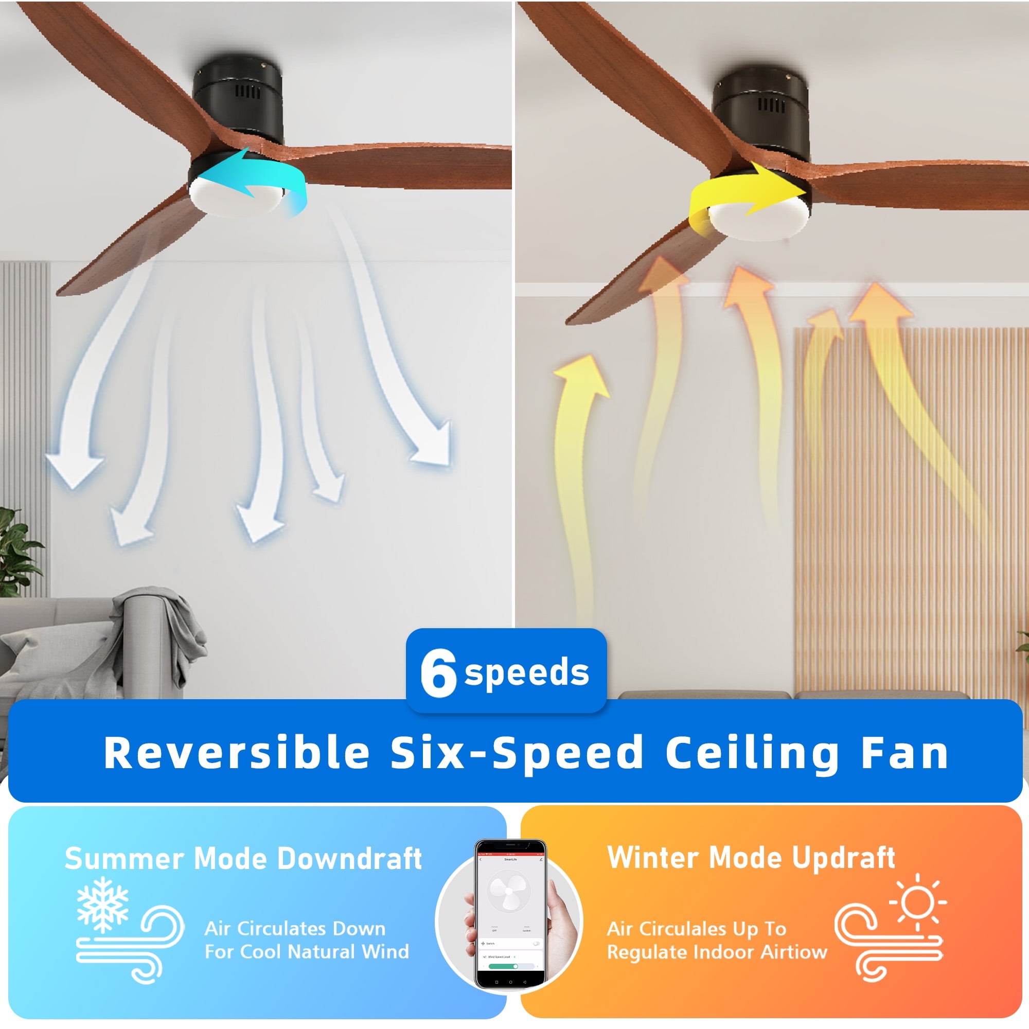 Reversible Airflow for Year-Round Comfort: The reversible airflow feature allows you to change the rotation direction of the fan. This ensures even distribution of cool air in the summer and warm air in the winter, promoting natural airflow throughout your home. Easily switch directions using the “reversible function” on the remote. Smart Control Options:This 52-inch ceiling fan with light and remote control offers versatile control options. You can manage it via the mobile app, even without WiFi,and it also works seamlessly with Alexa and Google Assistant. Simply say, “Alexa, turn on the ceiling fan” or “Set the light to 75%,” for hands-free convenience. Color Changing & Memory Function:The integrated LED light offers three color options: 3000K warm, 4500K natural, and 6000K cool white lights. The memory function recalls your last setting when you turn the fan on again, ensuring your preferred lighting atmosphere is always ready. The acrylic lampshade provides excellent transparency and non-yellowing characteristics for lasting clarity. Easy Assembly with Detailed Instructions:Installation is hassle-free with pre-install wire clips, detailed instructions, a balance kit, and all necessary accessories included. This large ceiling fan is designed for flush mount only, making it easy to install and perfect for a variety of spaces. 6-Speed Quiet Motor & Handy Remote:The energy-efficient DC motor offers six quiet speed settings, operating at under 35db to provide a peaceful ambiance. Save up to 50% on your electricity bills with this efficient design. The handy remote includes a 1/2/4/8-hour timer function for routine convenience and worry-free sleep, and comes with a wall-mount holder for easy access.