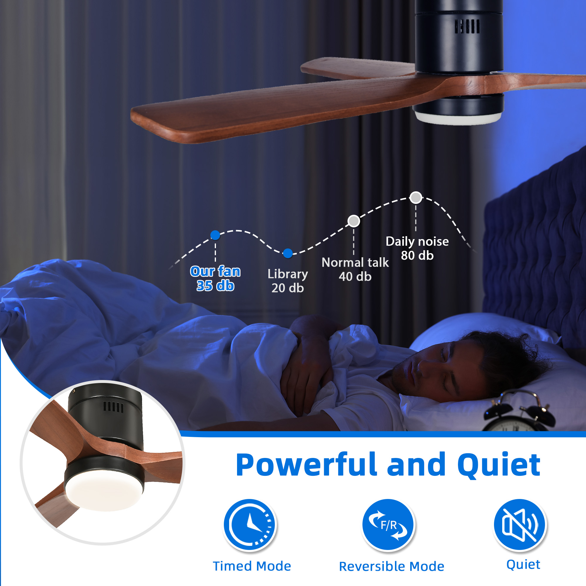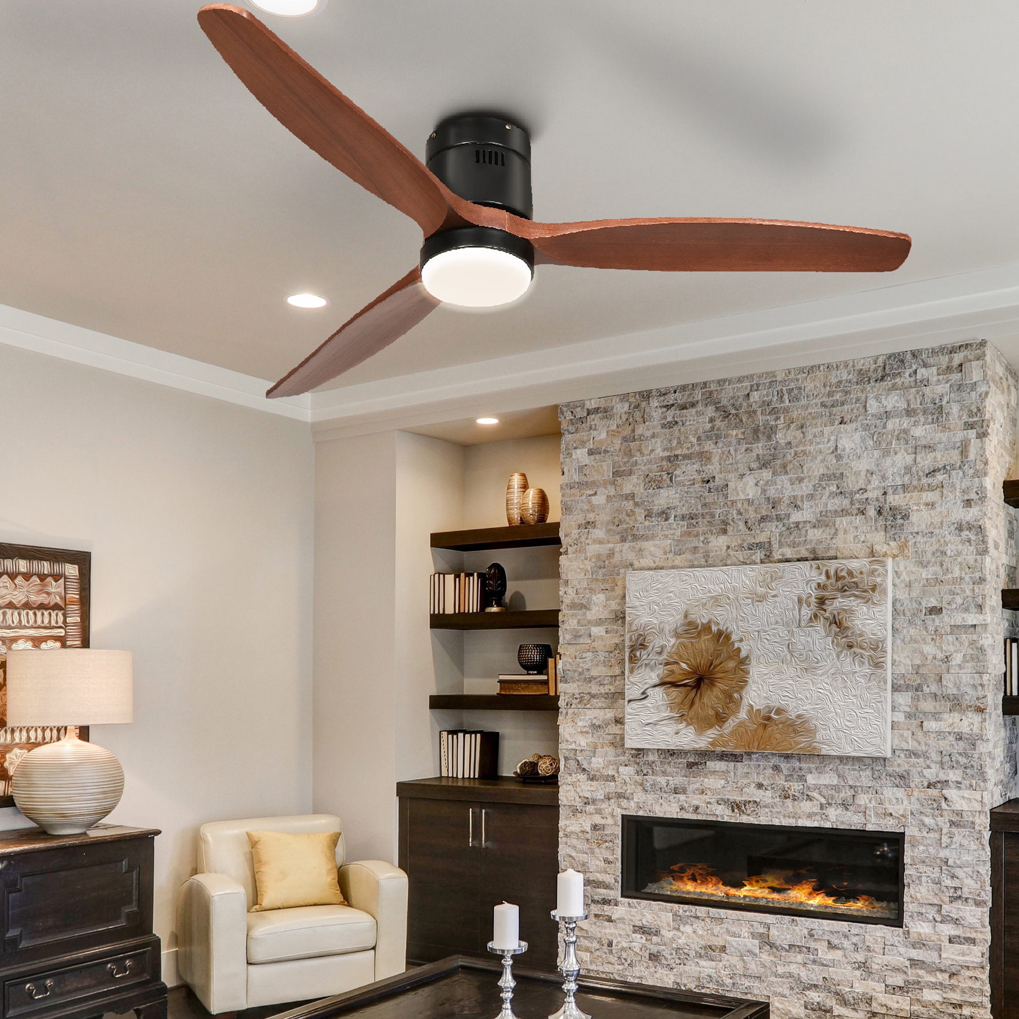 52″ Low Profile Ceiling Fan with Light and Remote, Smart Compatible with Alexa. Flush Mount design with Quiet DC Motor. Reversible Airflow for year-round comfort, suitable for both Indoor and Outdoor use. Specification: Color: Black & Walnut Material: Iron, Wood Motor: DC Fan blade: 3 blades Timing: 1H/2H/4H/8H Style: Farmhouse Ceiling Fans Room Type: Living Room, Bedroom, Kitchen, Office, Porch, Patio, etc. Products Included: 1 x 52-inch black ceiling fan 1 x Remote control (batteries not included) 1 x Instruction manual