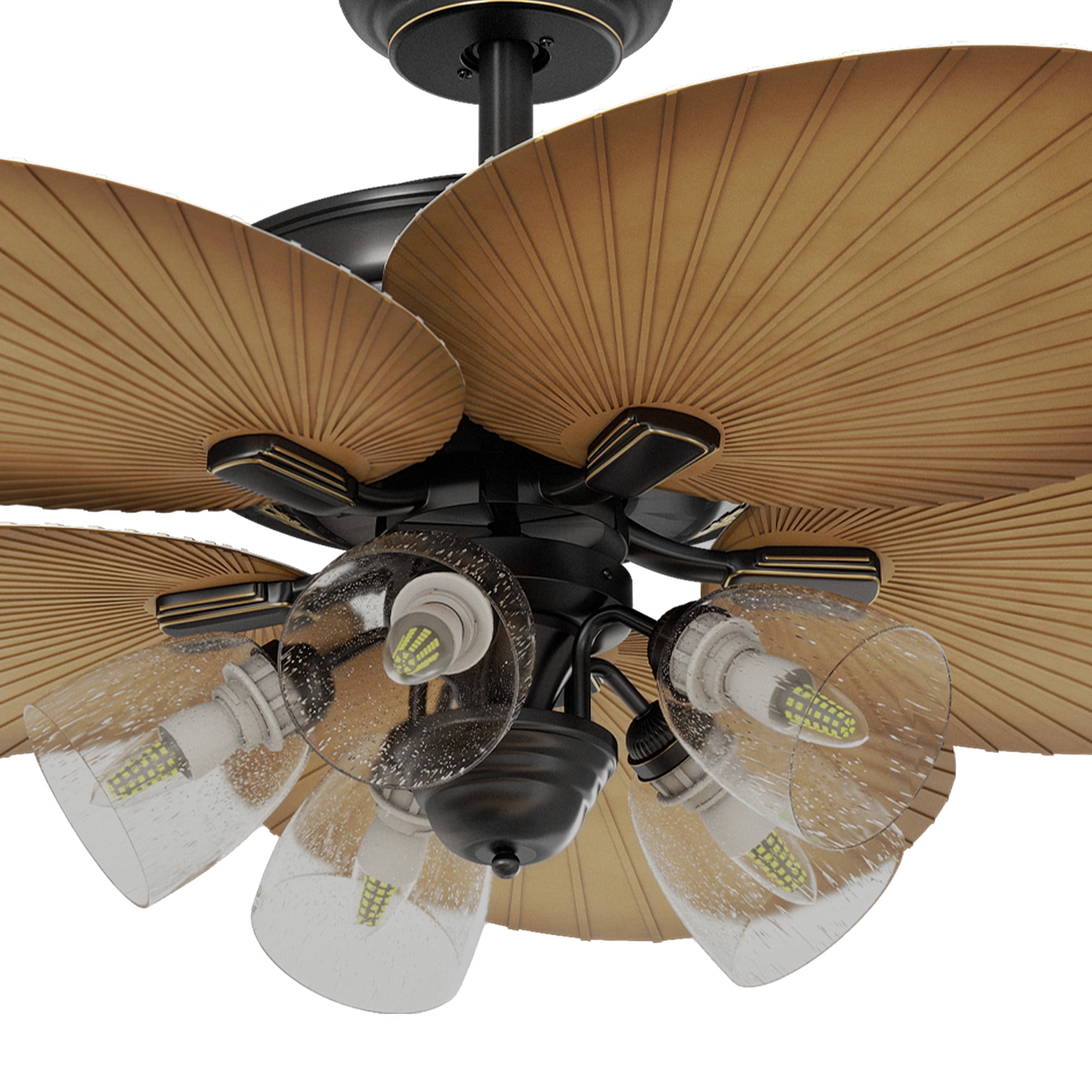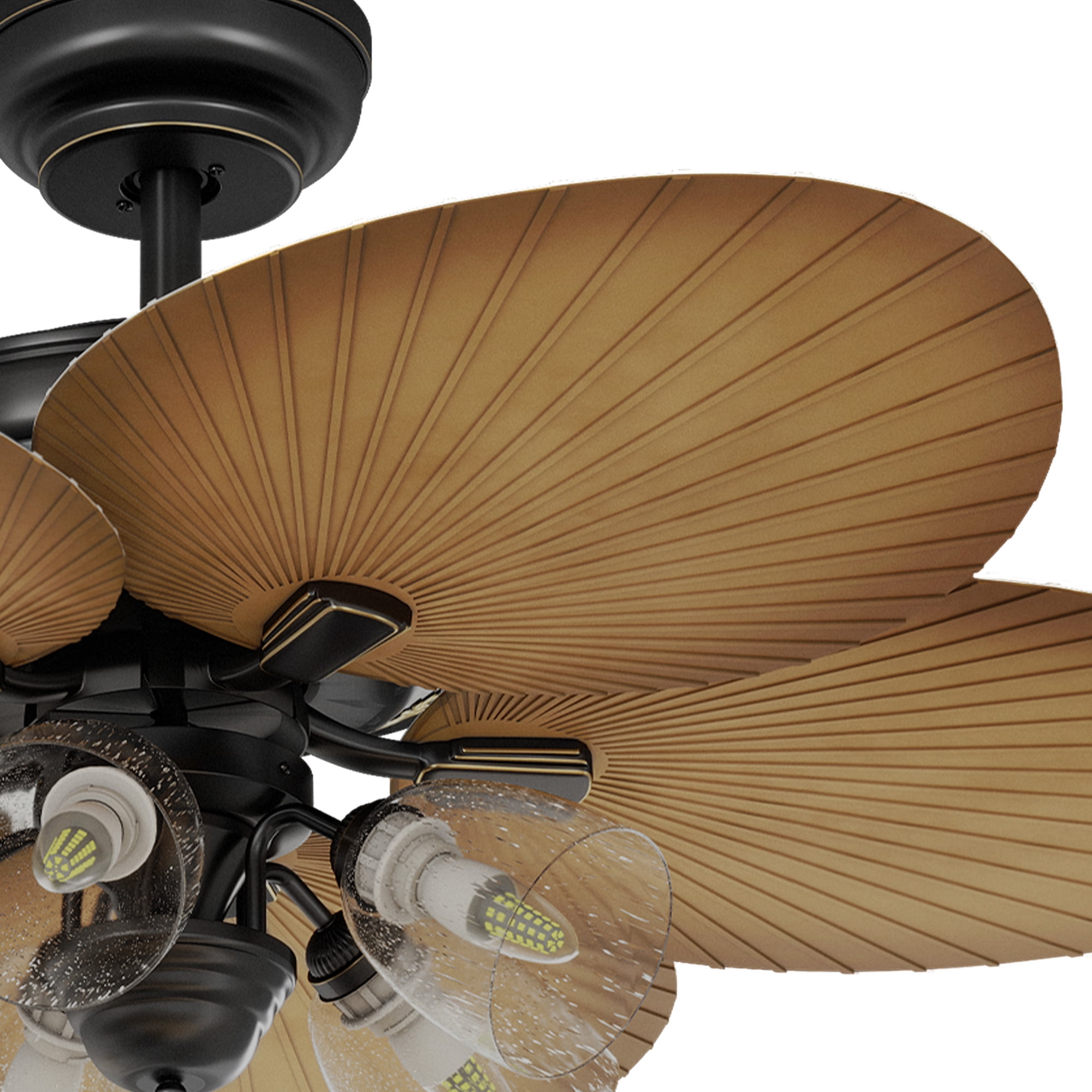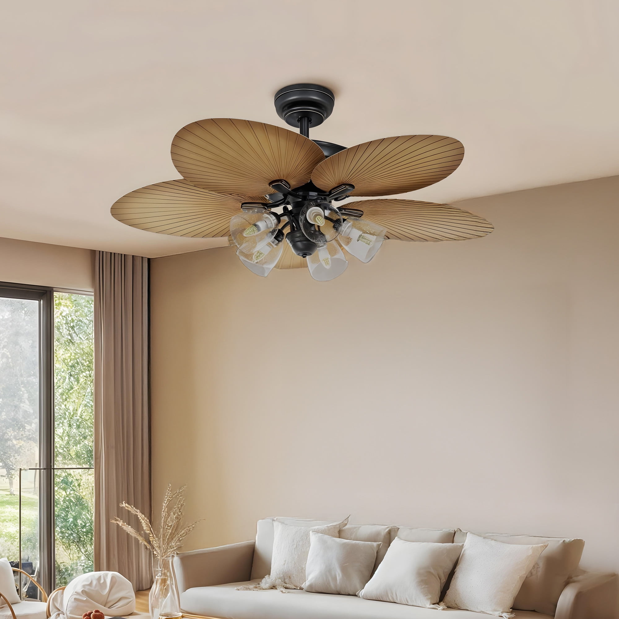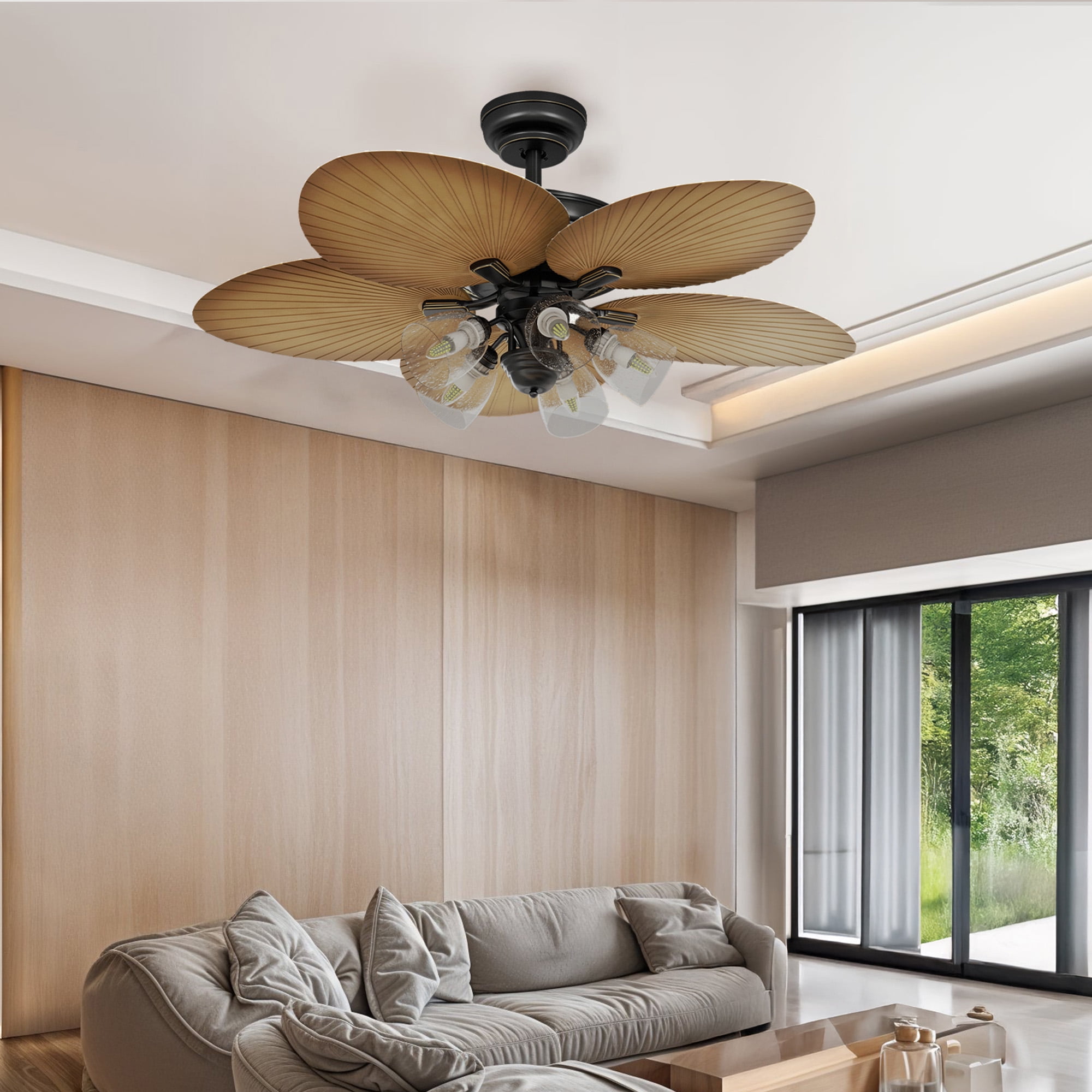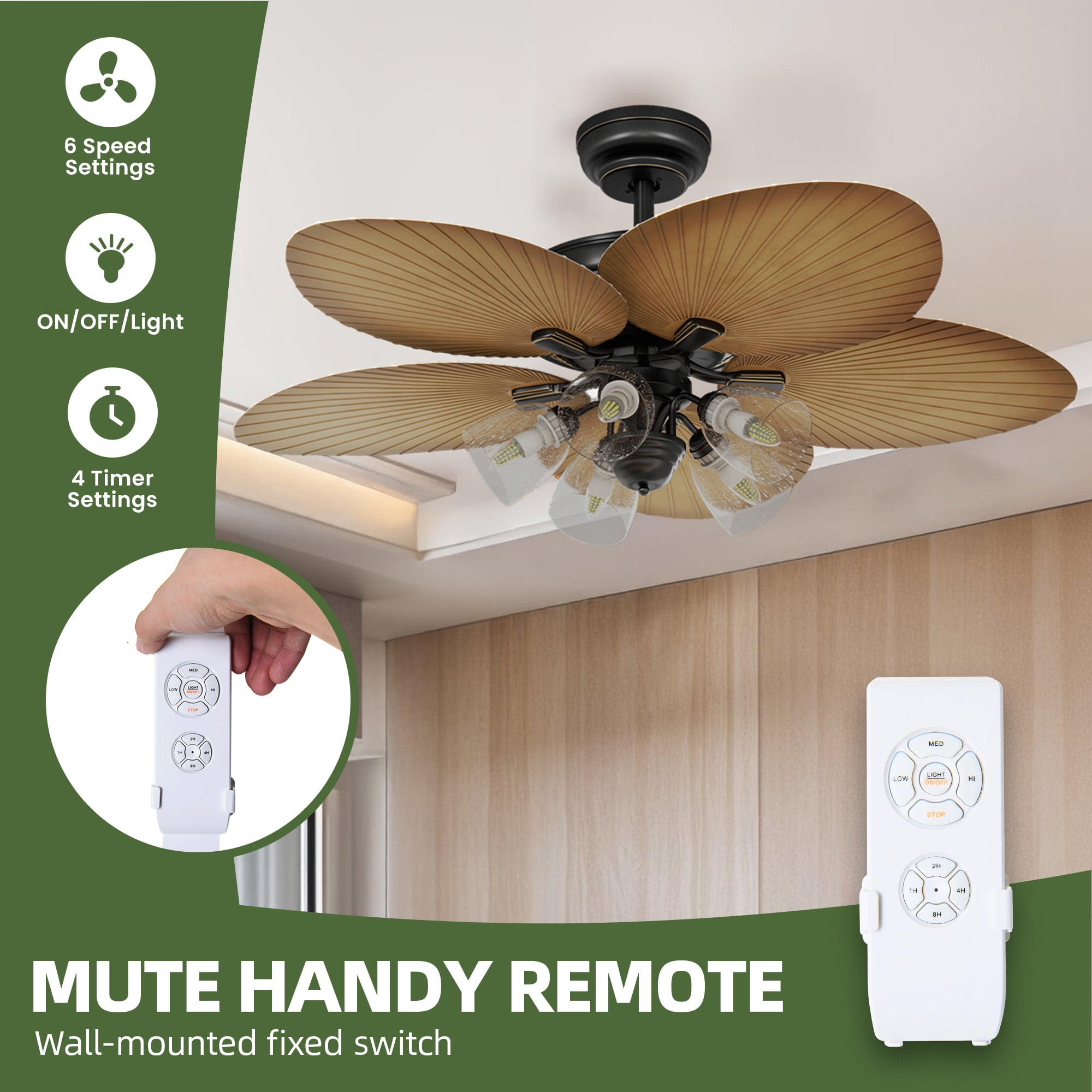Reversible & Timer Function:The direction of the fan can be reversed to keep you cool in summer and warm in winter. The 1/2/4/8H timer function helps maintain a regular daily routine for reading, working, or sleeping Easy Assembly:Comes with 5-inch and 10-inch downrods for flexible mounting options (downrod or angled mount up to 15°). Pre-install wire clips, instructions, a balance kit, and complete accessories are included for easy installation Tropical Style for Any Space:Certified by FCC, this 52-inch ceiling fan features 5 beautiful palm leaf blades and seeded glass shades, bringing a tropical feel to any indoor or outdoor space. Suitable for rooms up to 300 square feet, it measures 52 x 52 x 22 inches Handy Remote Control:The remote control allows you to adjust the light and speed without any annoying beeps. The remote can be hung on the wall using the included wall-mount holder, so you don’t have to search for it Whisper-Quiet Motor:The 3-speed motor runs silently at under 35db, even at the highest speed, making it quieter than other 50db fans. This allows you to enjoy a peaceful, comfortable ambiance