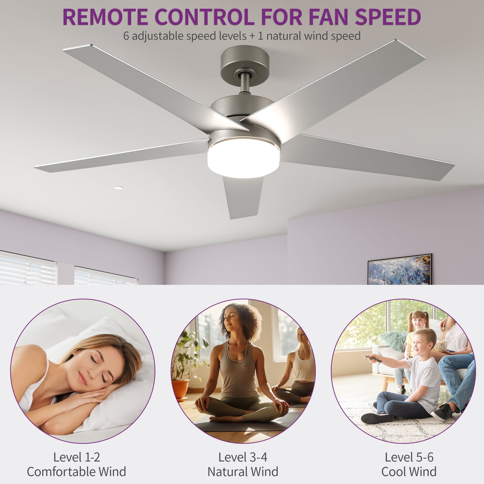 Transform your space with our stylish and versatile ceiling fan with light. With a chic contemporary design and five-blade construction, it effortlessly enhances any interior. Enjoy customizable comfort and smart timer functionality for added convenience. Illuminate your space with adjustable color temperatures and enjoy silent operation for a serene ambiance in any room. Easy installation ensures hassle-free setup for maximum enjoyment. Specifications Color: Silver Material: Iron Product Dimensions: 52 x 52 x 14 inches Item Weight: 14 pounds Power Source: DC Special Feature: Programmable Included Components: Remote Control