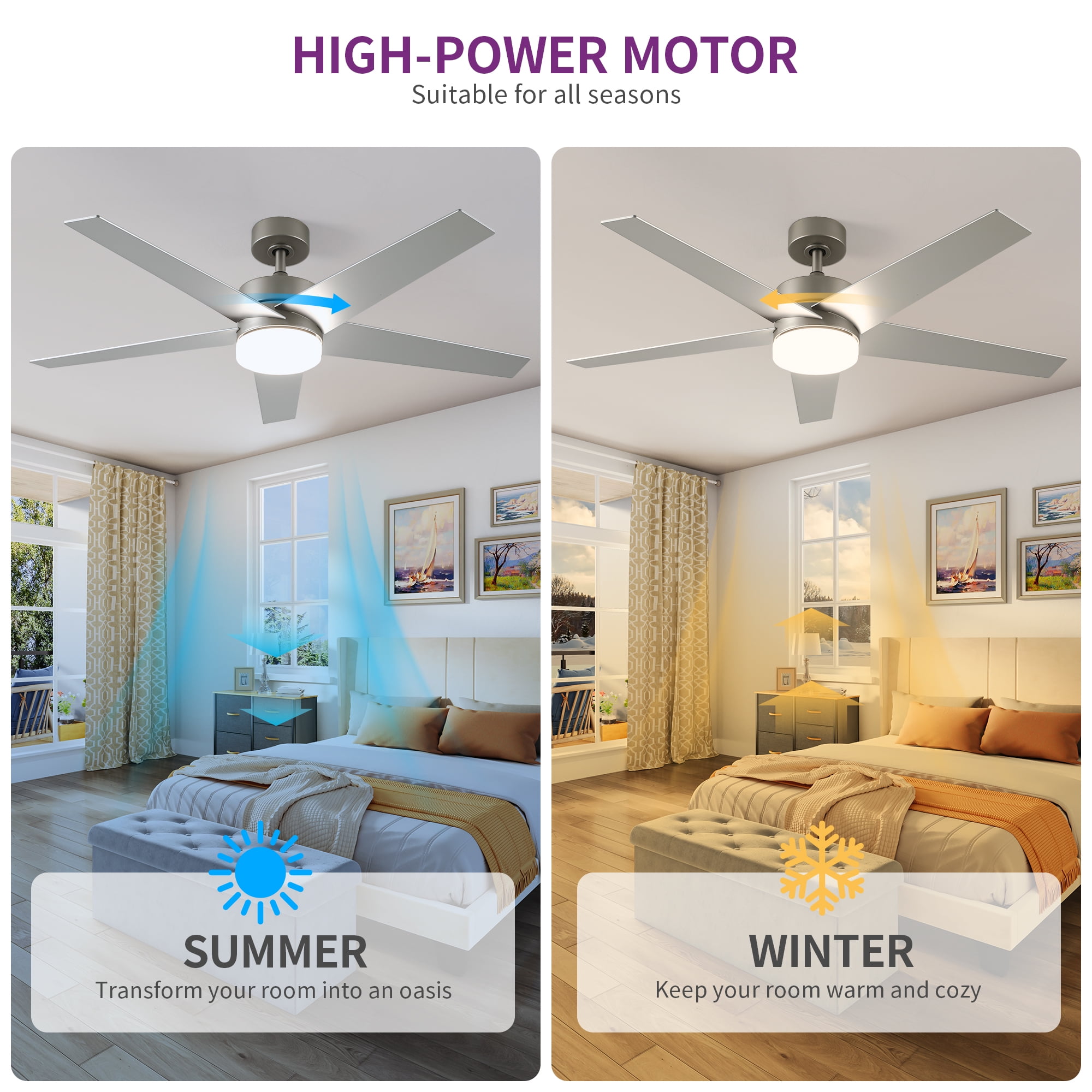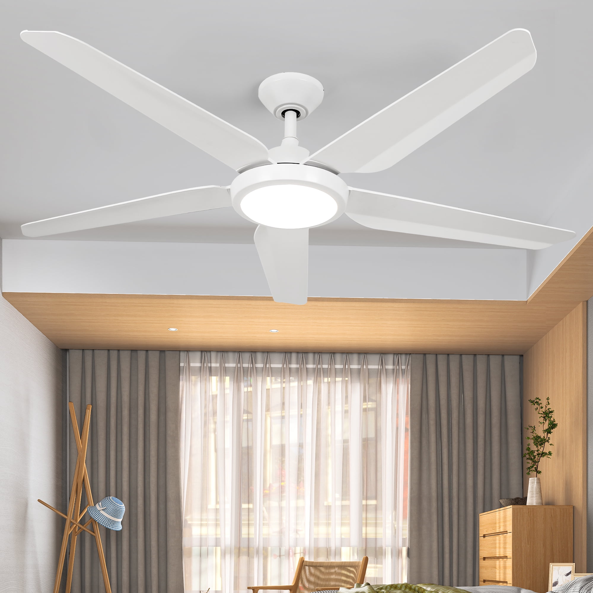 Stylish Ceiling Fan with Light: Enhance your decor with this stylish and versatile ceiling fan. Featuring a chic contemporary design and five-blade construction, it effortlessly complements any interior. With its powerful 35W DC motor, it provides the perfect lighting ambiance for any occasion, offering warm, cool, or focused illumination options. Smart Timer Functionality: Take advantage of four timer modes (1H, 2H, 4H, and 8H) for added convenience and energy efficiency. Program the fan to operate at specific times and enjoy automatic shut-off after a designated period. Effortless Installation, Silent Operation: Designed for hassle-free installation, this modern ceiling fan ensures a smooth setup process. Its sturdy construction and balanced fan blades guarantee quiet operation, providing a serene ambiance in your living room, bedroom, or office, free from distractions. Customizable Comfort: Enjoy paramount comfort with six adjustable fan speeds and a reversible motor for optimal airflow control. During hot summer days, select clockwise rotation for a refreshing breeze, while in winter, choose counterclockwise rotation for gentle warmth distribution. Versatile Lighting Options: Illuminate your space with the built-in 18W LED light source, offering adjustable color temperatures (3000K – warm white, 4500K – natural white, and 6000K – cool white) to suit various occasions and settings.
