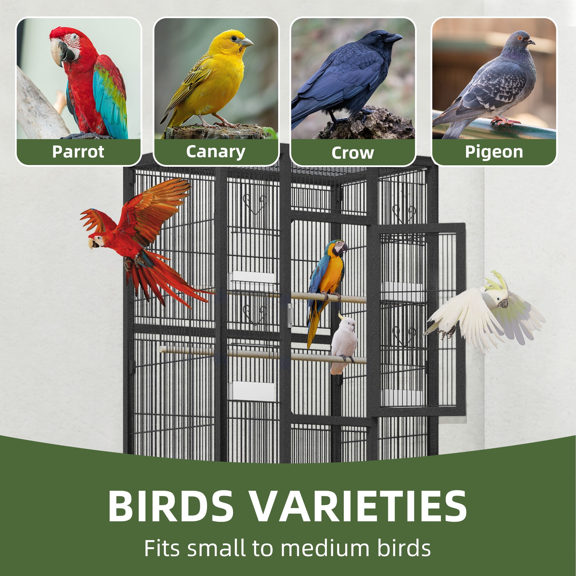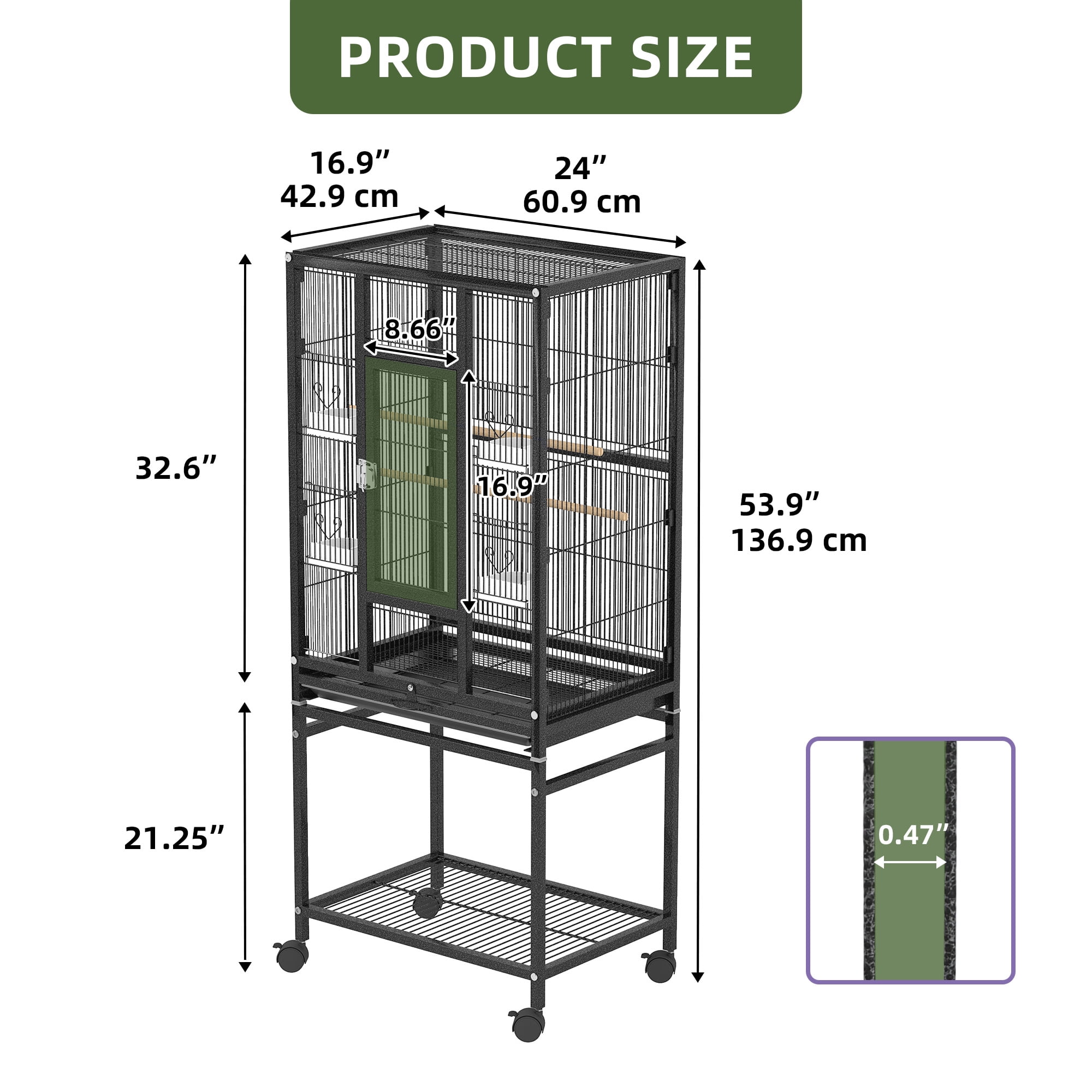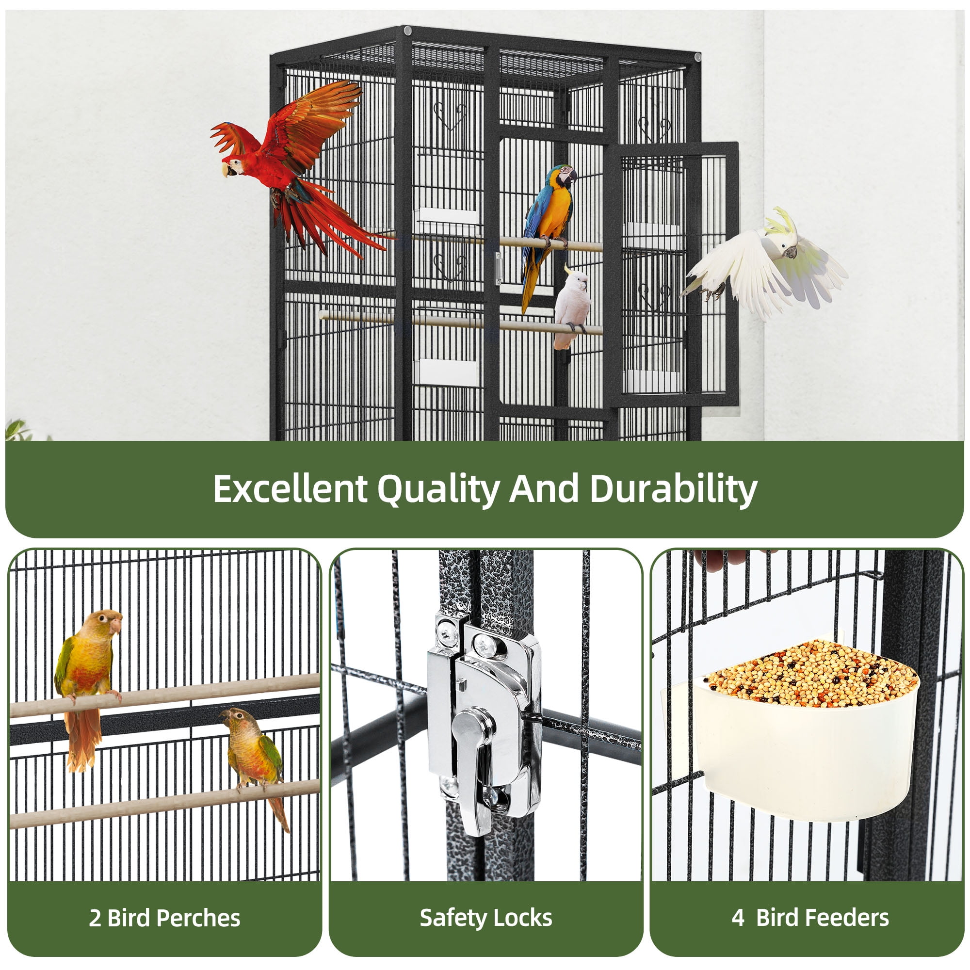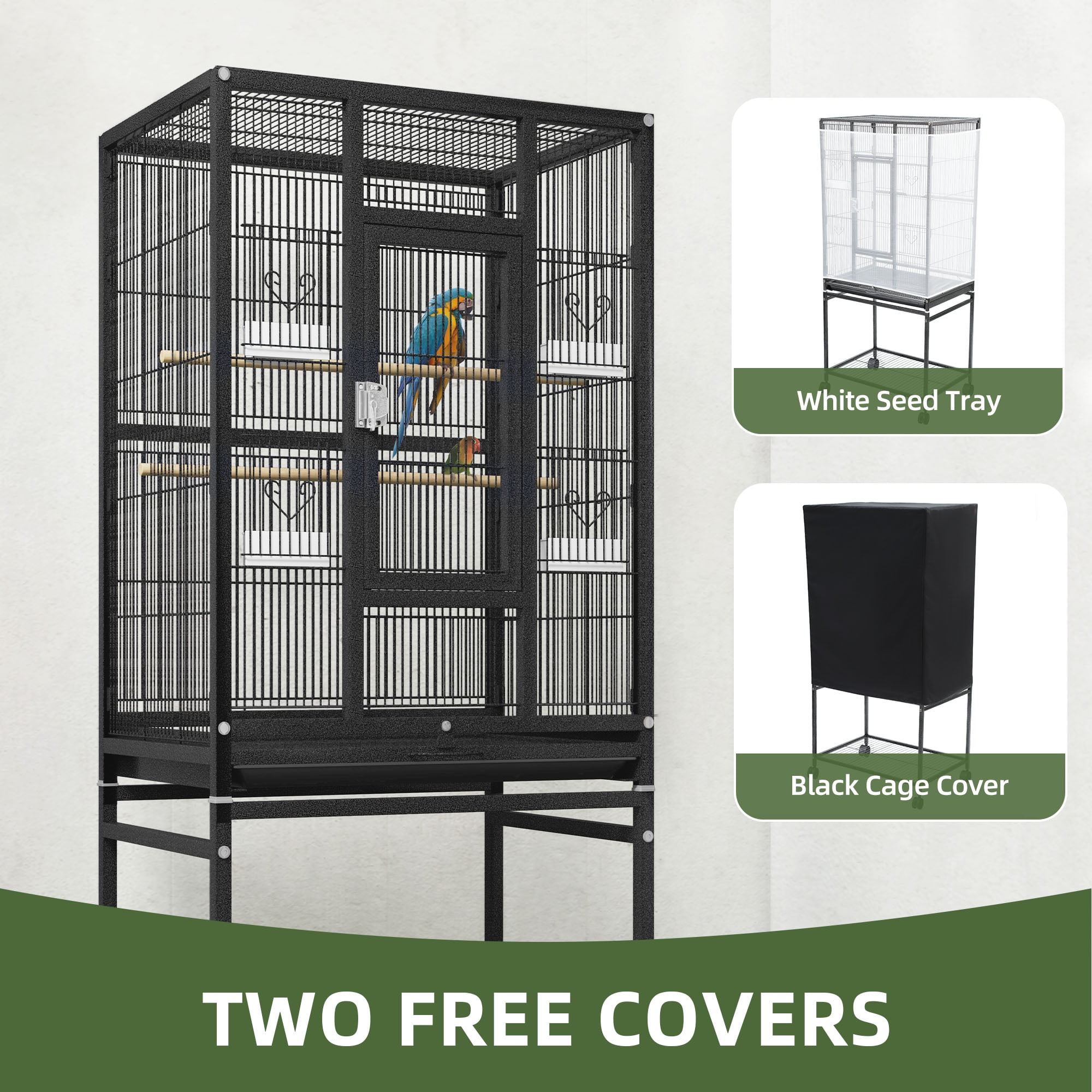 Spacious Accommodations:With dimensions of 24″x17″x53″ (LxWxH), this large bird cage can easily house 2-3 small to medium-sized birds, such as budgerigars, parakeets, parrots, cockatiels, and lovebirds. Effortless Cleaning:The wrought-iron wire construction and slide-out tray make it simple to clean up bird droppings and food waste, maintaining a healthy environment for your feathered friends. Convenient Mobility and Storage:Four 360-degree swivel wheels allow you to effortlessly relocate the bird cage, while the spacious storage rack provides ample space for pet supplies and accessories. Secure Door Lock:The glossy lock on the cage is specially designed to keep even the smartest parrots safely contained, offering a more secure solution than traditional latches. Comprehensive Cage Accessories:Included with the large bird cage are two extra covers: a white seed catcher to prevent mess, and a black cover that blocks 90% of sunlight and UV rays, providing your birds with a restful environment.