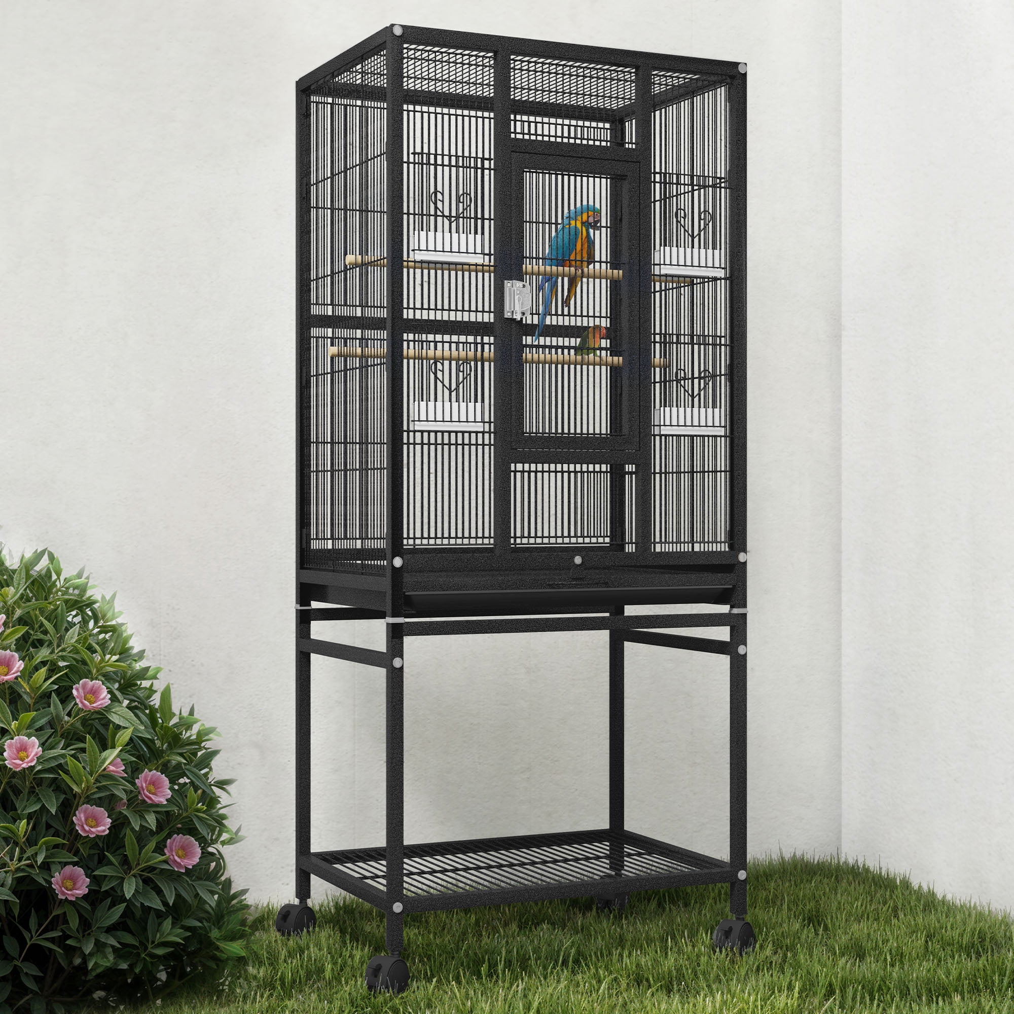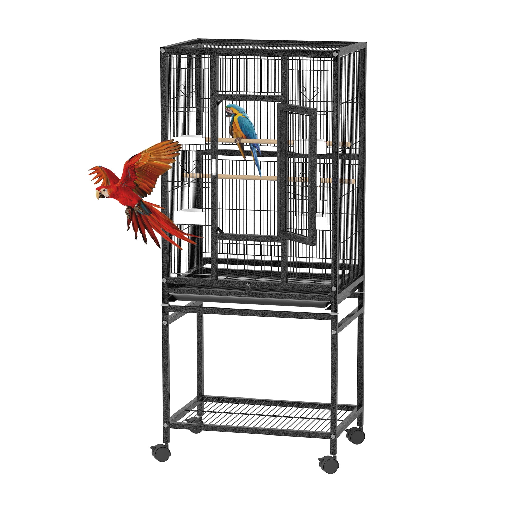 Uforic 53″ Metal Birdcage with Rolling Stand and Castor Wheels, Large Parrot Cage with 2 Perches and 4 Feeders, Spacious storage rack sits, Black