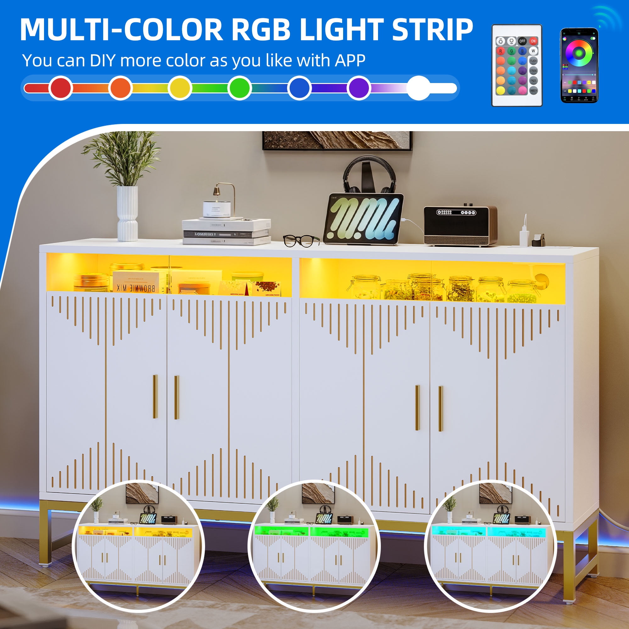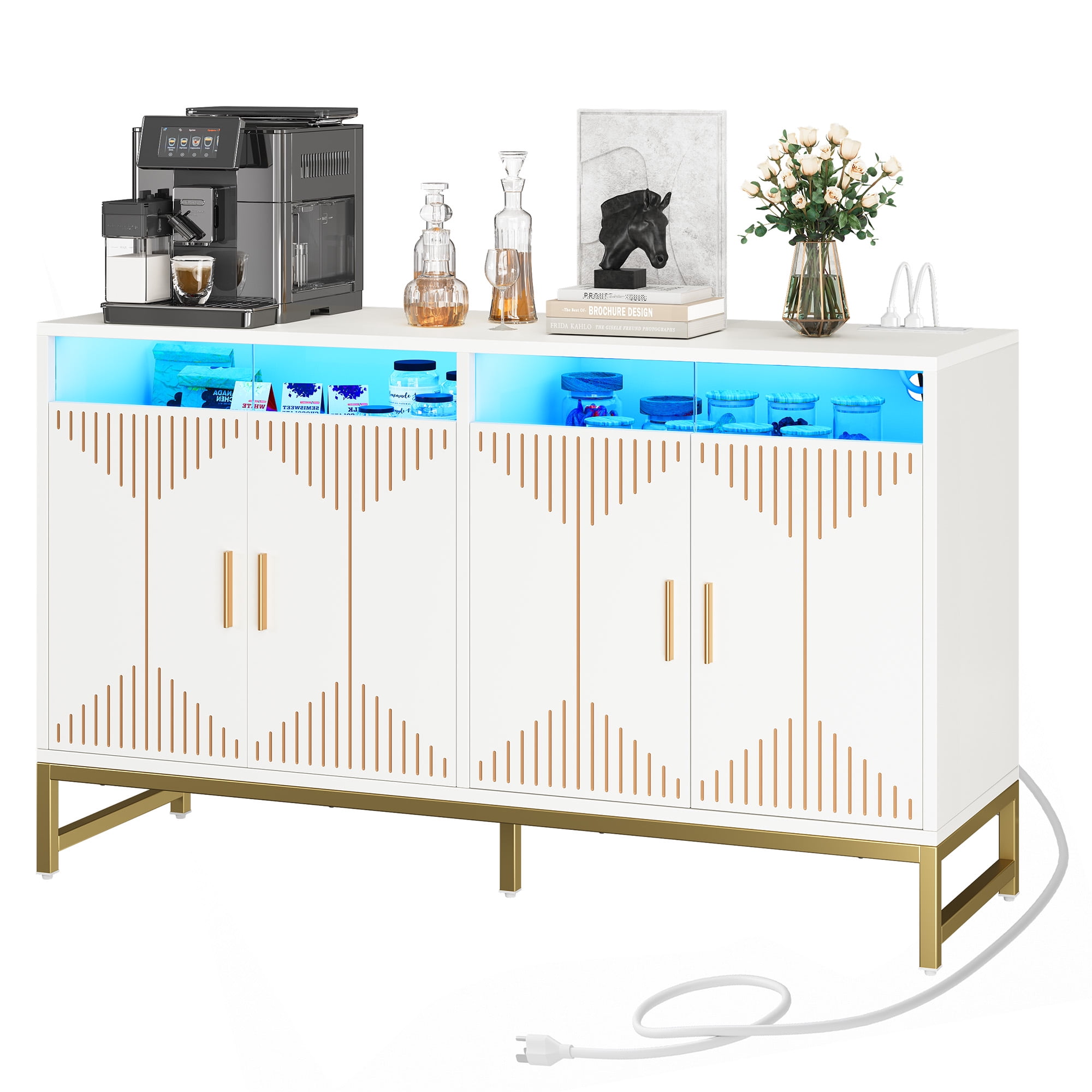 Uforic 55″ Buffet Sideboard Cabinets with LED Light, Modern Coffee Bar Cabinet with Power Outlet, Kitchen Storage Cabinet with 4 Door & Open Storage, Accent Cabinet Cupboard Console Table