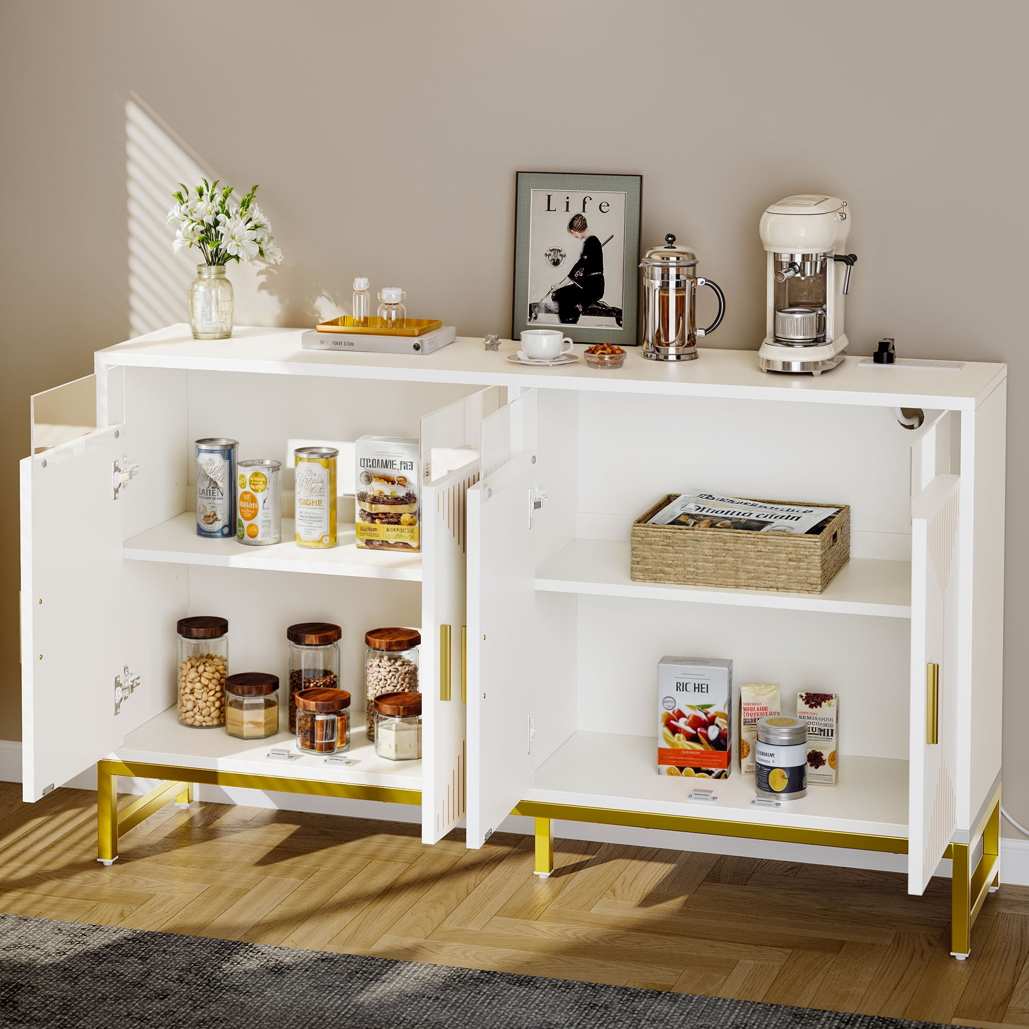 Stylish Sophistication: Revamp your space with our 55” wood buffet cabinet’s glossy white finish, adorned with elegant gold metal handles and legs. Intricately carved doors featuring acrylic accents exude sophistication and charm. Chic Illumination: Light up your space using the built-in LED strip, accessible through a remote control or app. Tailor the atmosphere to suit any occasion, from peaceful moments to festive gatherings. Practical Charging Options: Stay connected and organized with 2 AC outlets and 2 USB ports to power your devices. This spacious buffet cabinet provides practical solutions for your tech needs, ensuring seamless connectivity and organization. Ample Storage: Struggling with fluctuating storage needs? Our cabinet is an excellent fit for you! Equipped with 2 roomy cabinets and adjustable shelves, it’s ideal for organizing utensils, dishes, and more. Everything finds its right place here. Crafted for Longevity: Built to last! Our robust cabinet uses strong engineered wood and meticulous details. A tip-repellent buckle and extra support legs ensure years of stable storage. It provides secure positioning and tranquility.