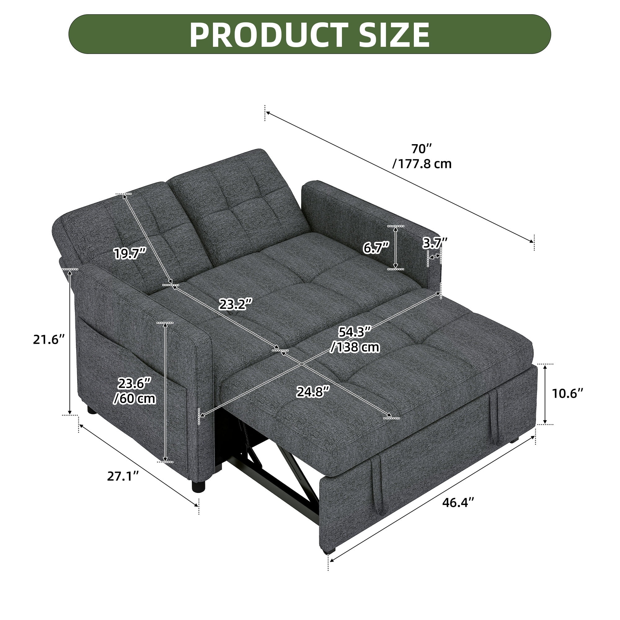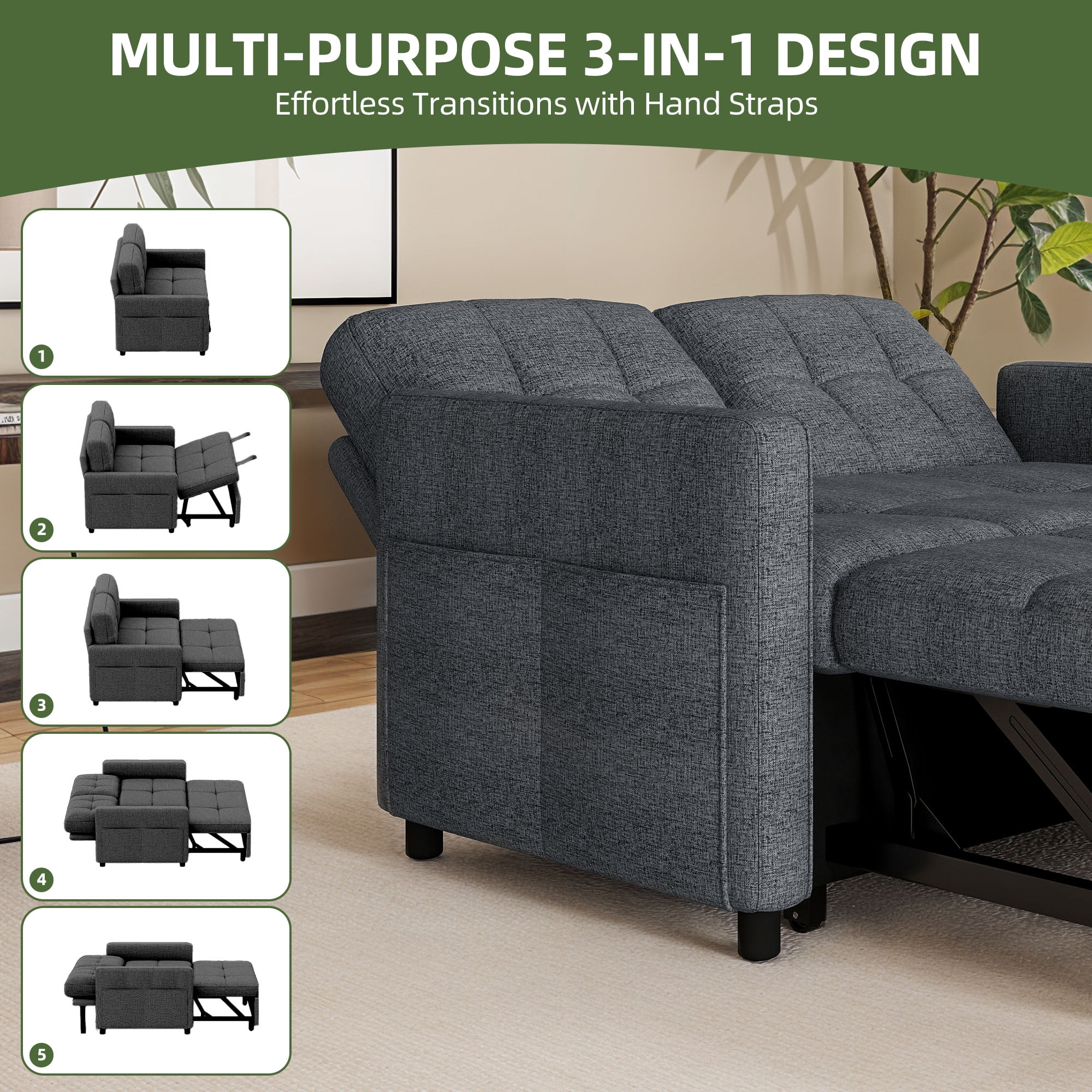 This 3-in-1 sofa bed is like the Swiss Army knife of furniture, ready to lounge, sleep, or entertain. Whether you’re crashing after a long day, chatting with friends, or binge-watching your favorite shows, it’s got your back. Adjust the backrest to five angles and find your ideal comfort zone, whether you’re gaming, reading, or sneaking in a nap. With a solid wood and iron frame, plus side pockets to stash your remote, snacks, and magazines, everything you need is within reach. The 5-inch cushion and 71.2 inches of space let you sprawl out in total comfort. Set it up easily, and you’ll be lounging in no time. Specifications: Color: Grey Material: Solid Wood, Iron Frame Overall Size: 27.1″D x 55″W x 35.4″H Room Type: Living Room Assembly Required:Yes Package Included: 1 x Sofa Bed 1 x Instructions 1 x Accessory Kit
