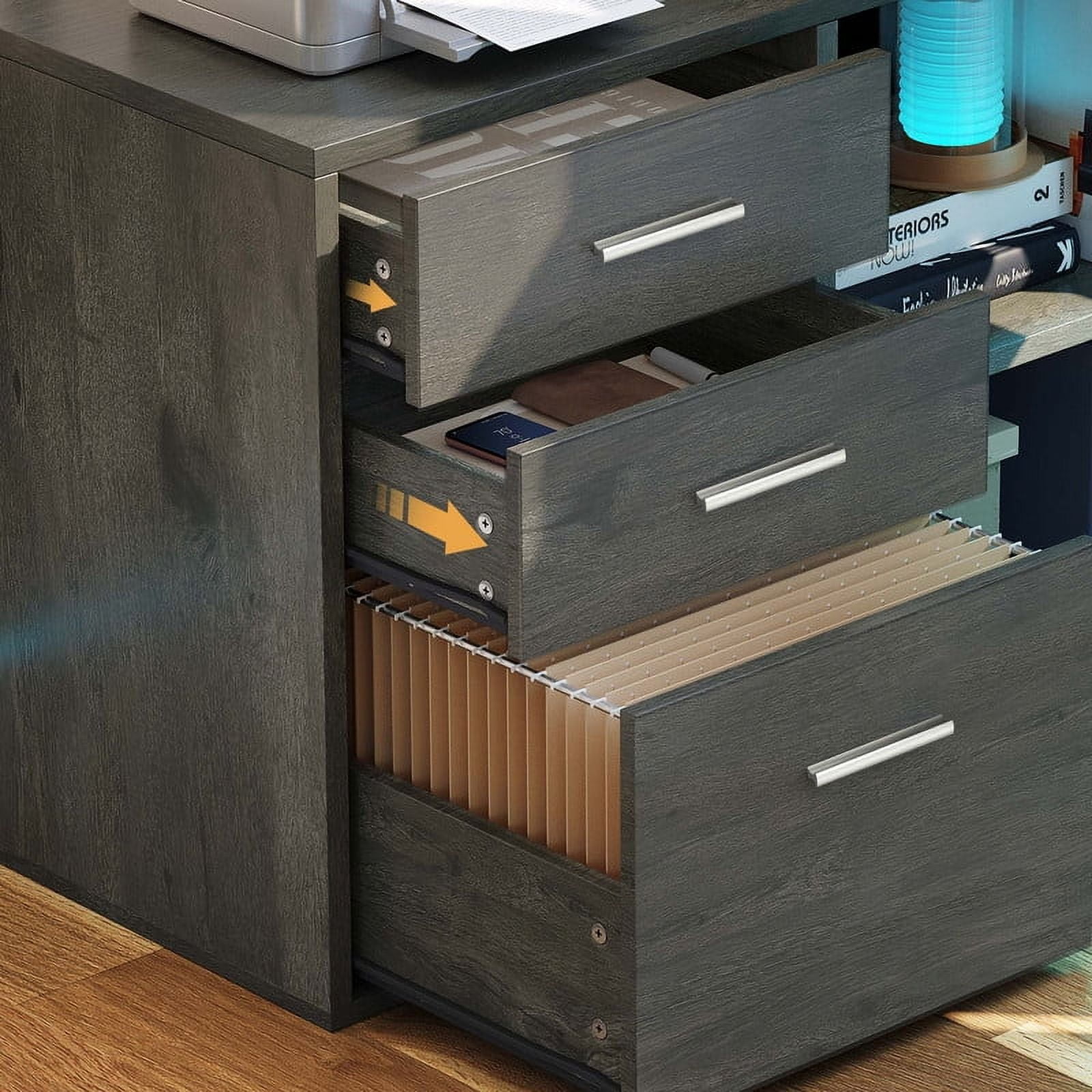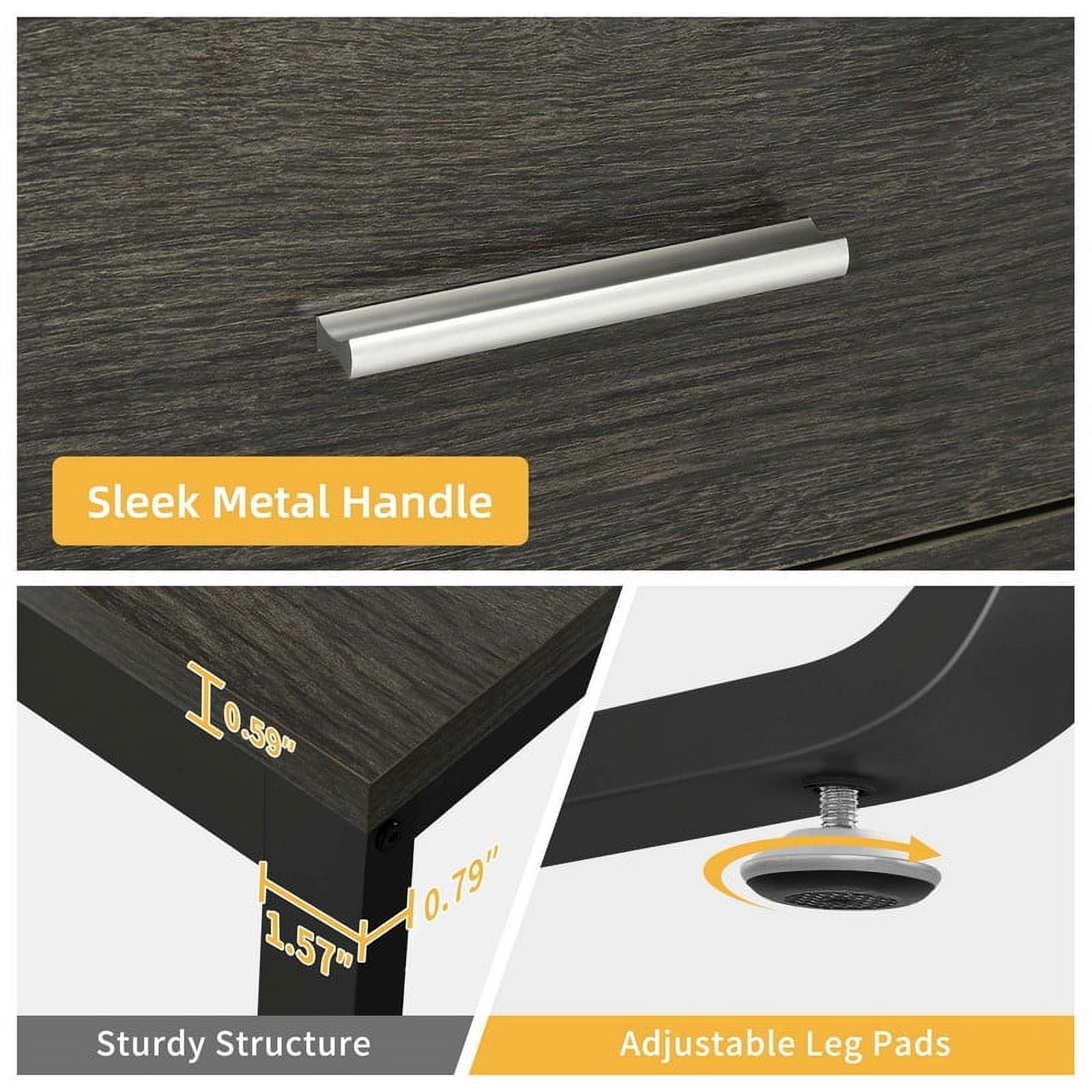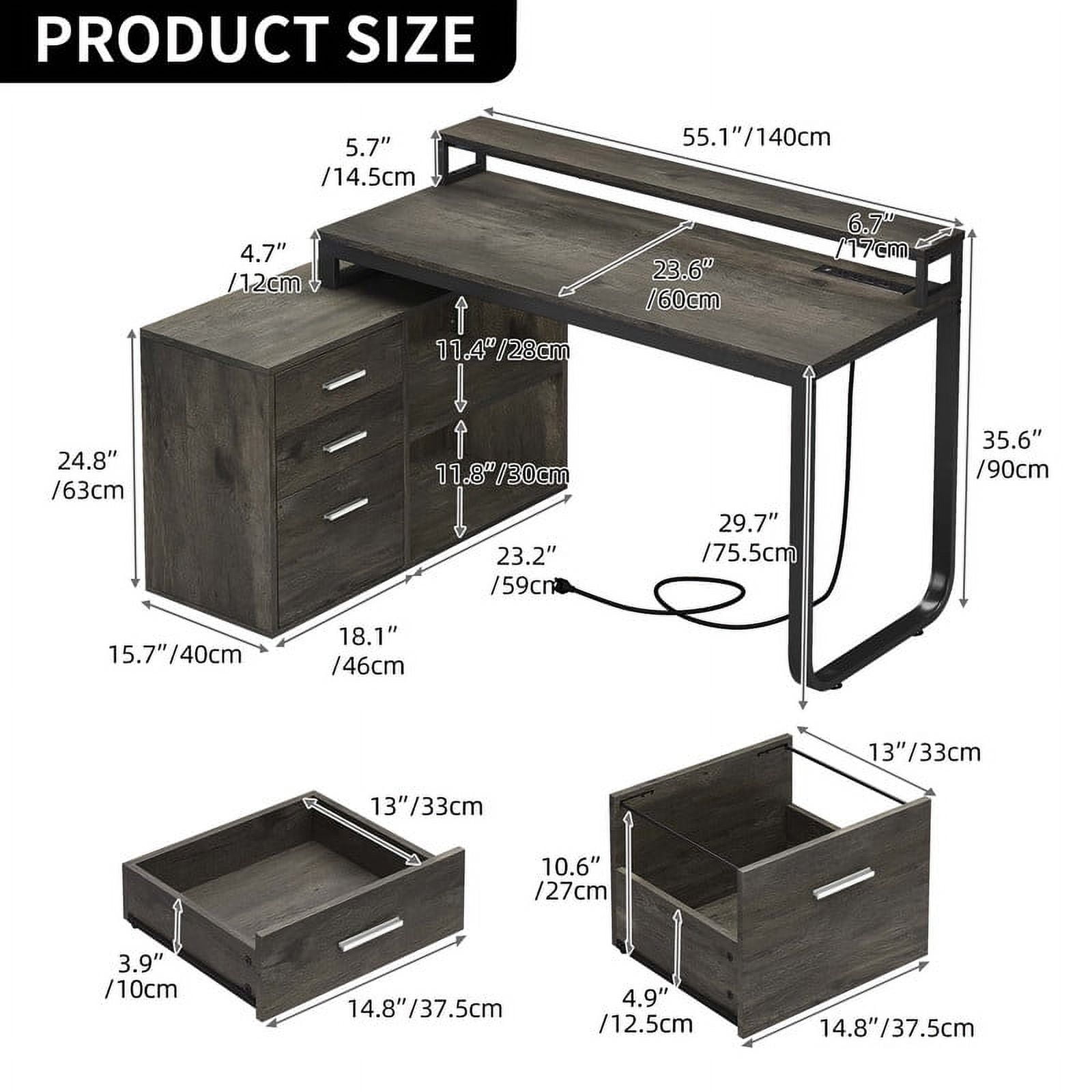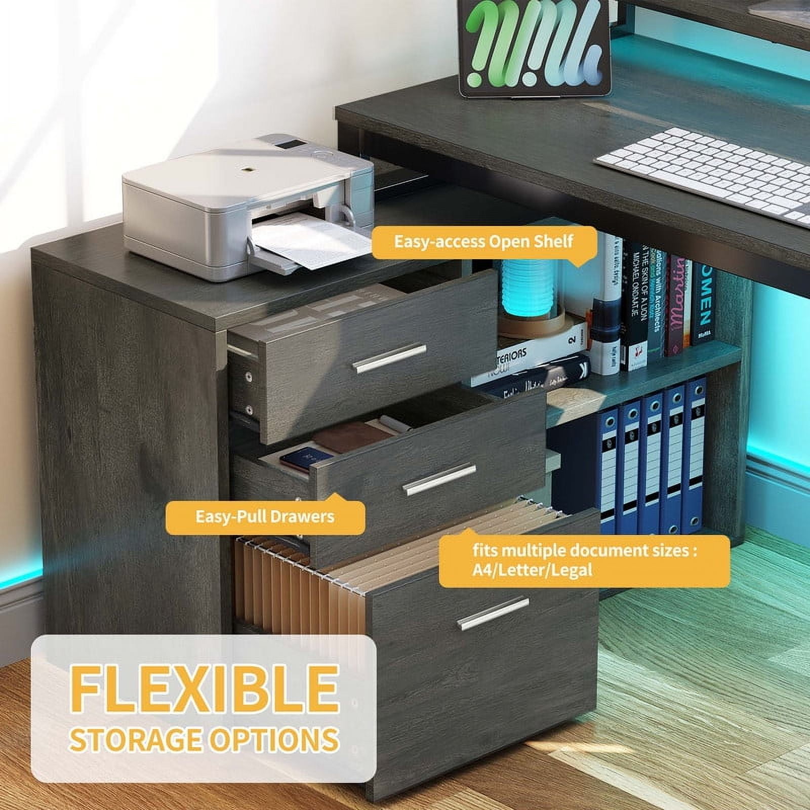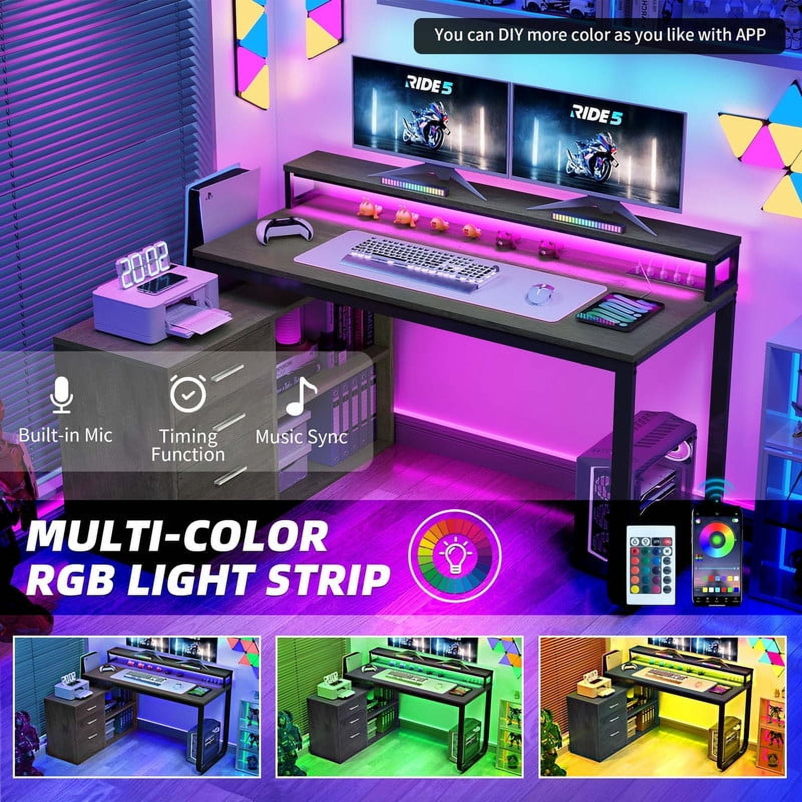 Expansive Work Surface: Elevate your work area with a generous computer desk that boasts a vast 55.1-inch length by 23.6-inch width desktop, complemented by a monitor stand for ergonomic comfort and an open shelf for organizing office essentials. Integrated Charging Hub: Simplify your charging routine with the L-shaped desk’s built-in charging station, featuring two USB ports, four power outlets, and a convenient 6.56-foot cord to power and charge laptops, tablets, printers, and other devices without hassle. Customizable LED Lighting: Set the mood of your workspace with the L-shaped desk’s RGB LED light strips, which can be personalized using a mobile app or remote control. Advanced features such as music synchronization and timer settings allow for a dynamic work ambiance. Space-Efficient Design: Maximize your space with the 2-in-1 corner desk that integrates a computer desk with a file cabinet, perfect for storing letter, A4, and legal-sized documents. The additional drawers and adjustable shelves help maintain a tidy organization for office supplies, with the spacious top also serving as an ideal printer stand. Durable Construction: Enjoy lasting use with a desk crafted from high-grade particle boards finished with a scratch-resistant coating. The robust U-shaped metal frame, measuring 1.57 inches by 0.78 inches, ensures stability and durability for years to come.