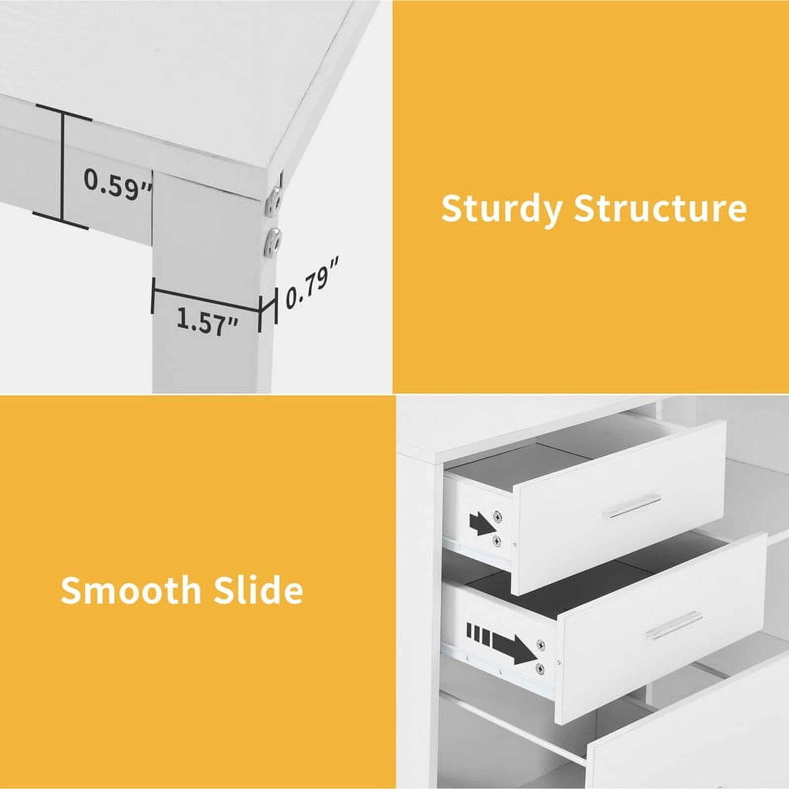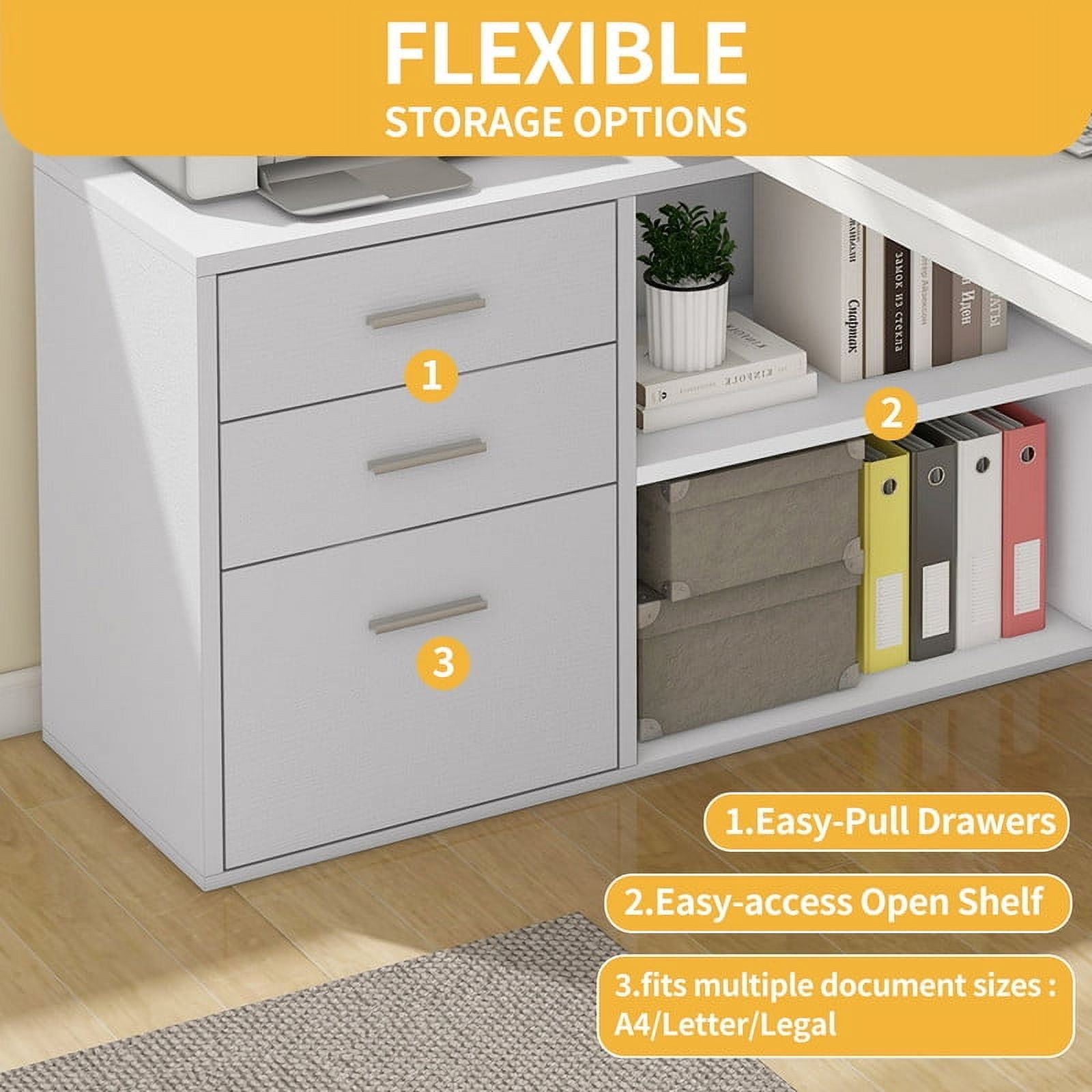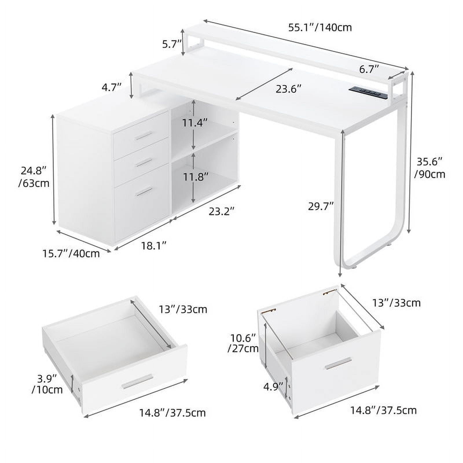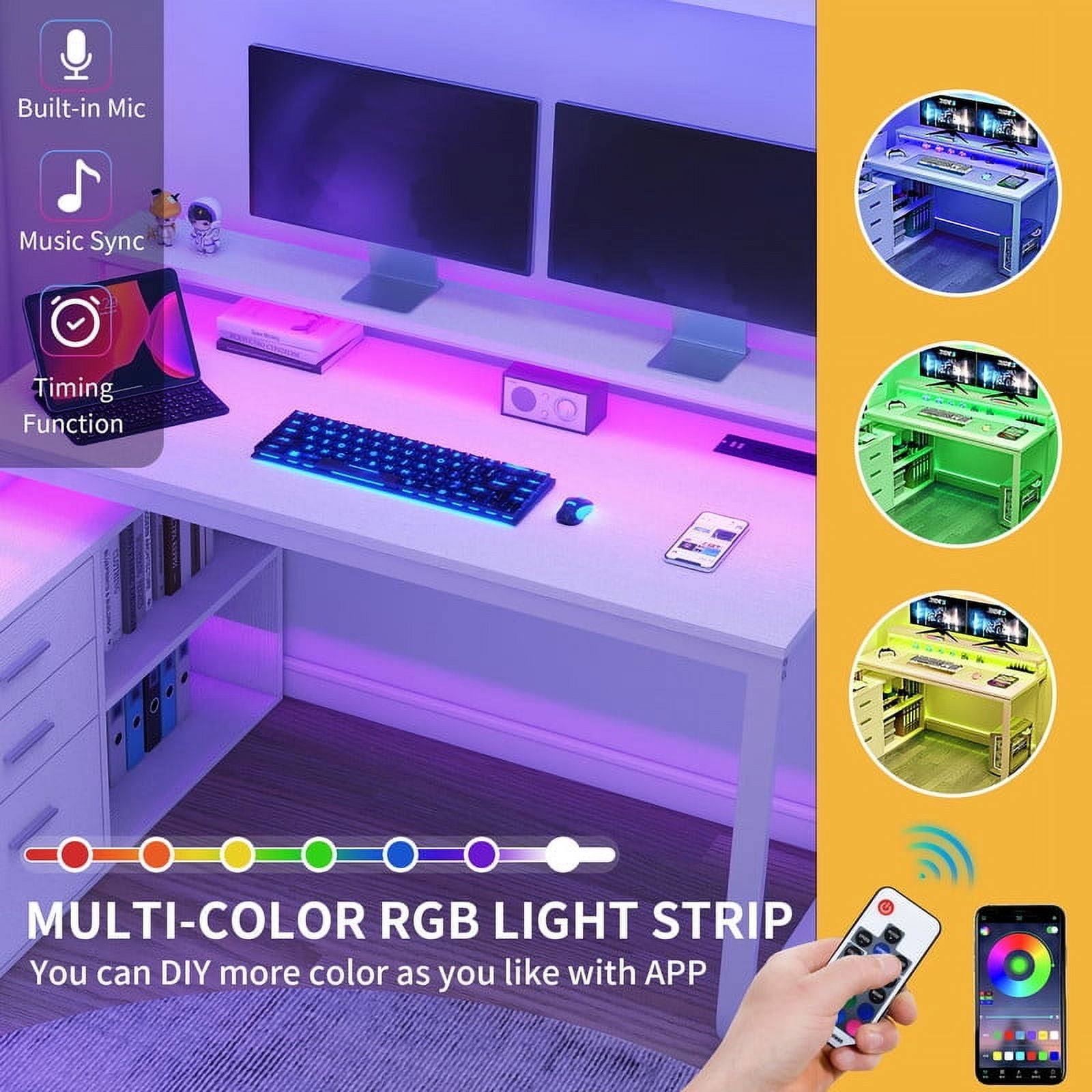 Spacious Work Surface: This L-Shaped desk offers a large 55.1″ x 23.6″ desktop with a monitor stand for better posture. An open shelf keeps office essentials organized, making it ideal for adults and teens in home or office settings. Built-in Charging Station: Stay powered with 2 USB ports, 4 outlets, and a 6.56-foot cord. Easily charge laptops, tables, and phones while working, gaming, or studying. Customizable LED Lights: Personalize your space with RGB LED Lighting. Control colors and brightness via a mobile app or remote, with music sync and timer options for fun and focused workspace. Smart Storage & Organization: A file cabinet fits letter, A4, and legal-sized documents. Drawers and adjustable shelves store office supplies, while the sturdy top doubles as a printer stand. Storage & DUrable Build: Made from high-quality particle board with a scratch-resistant finish. A sturdy U-Shaped metal frame (1.57″ x 0.78″) ensures long-lasting stability, perfect for daily use.
