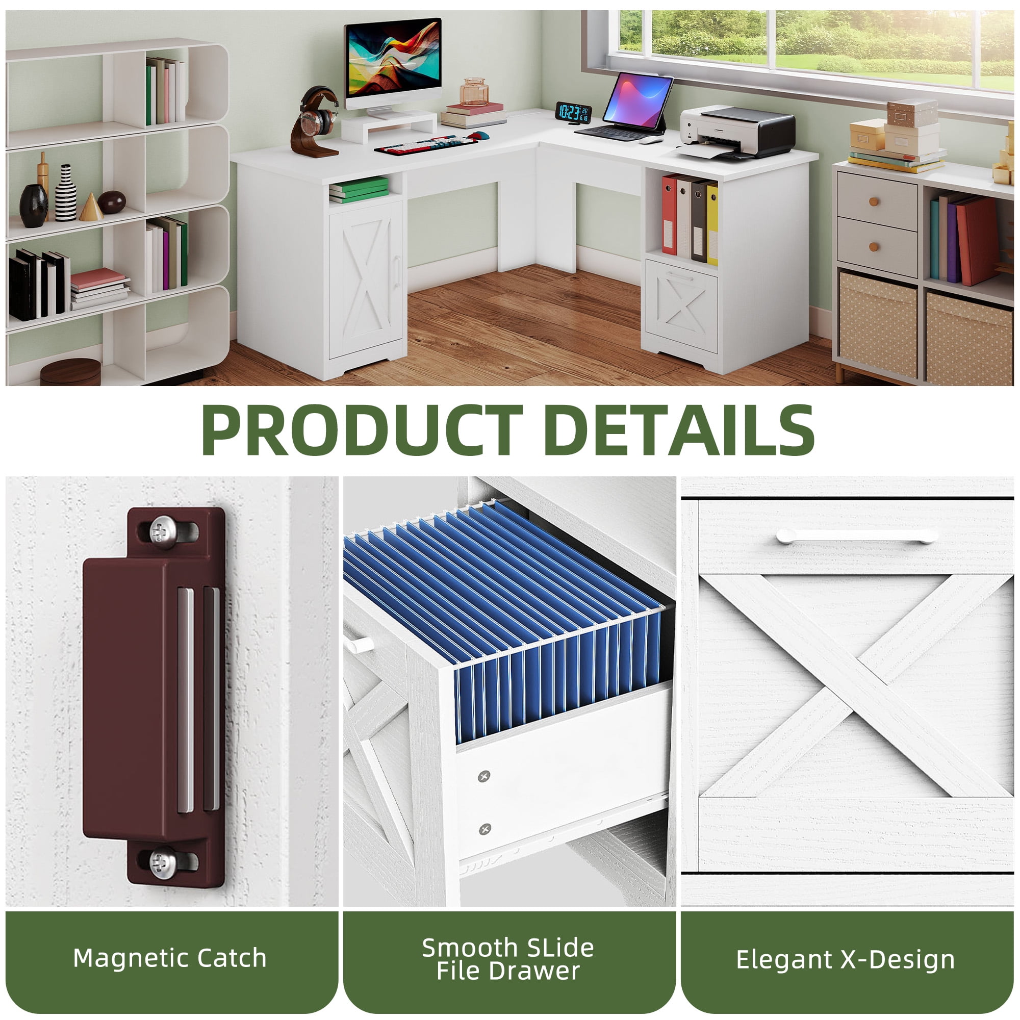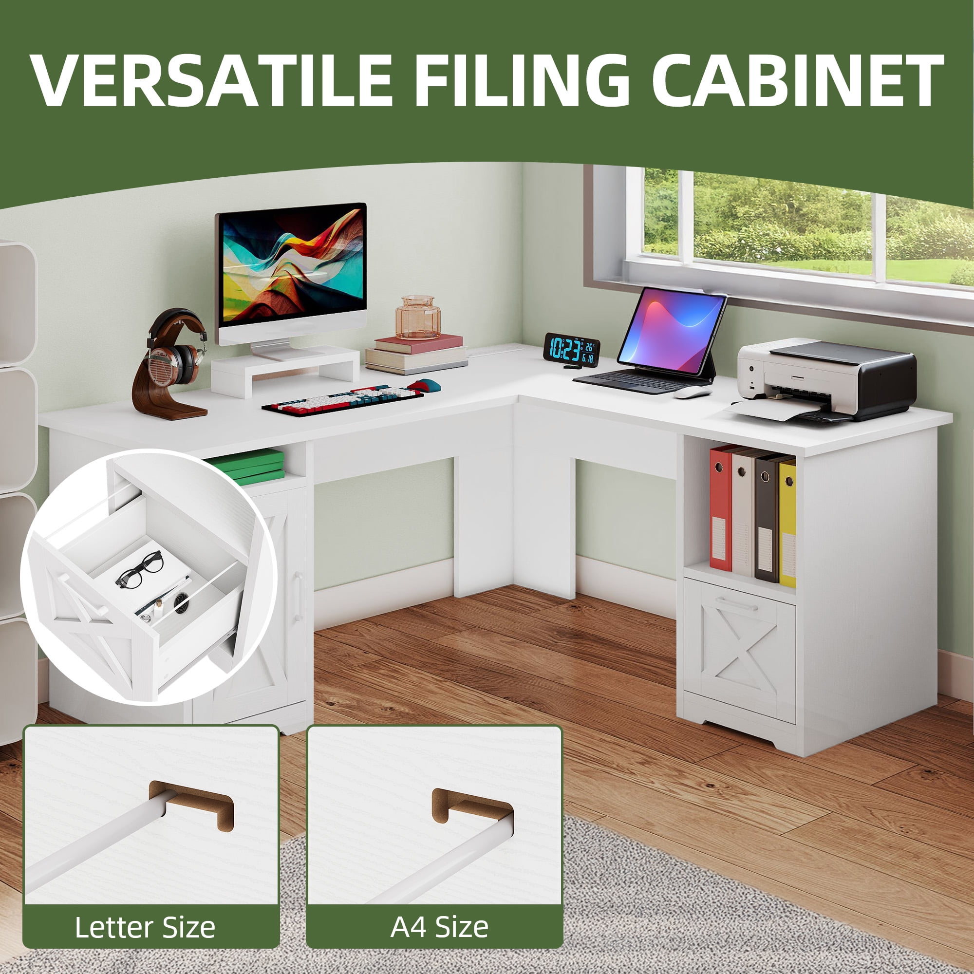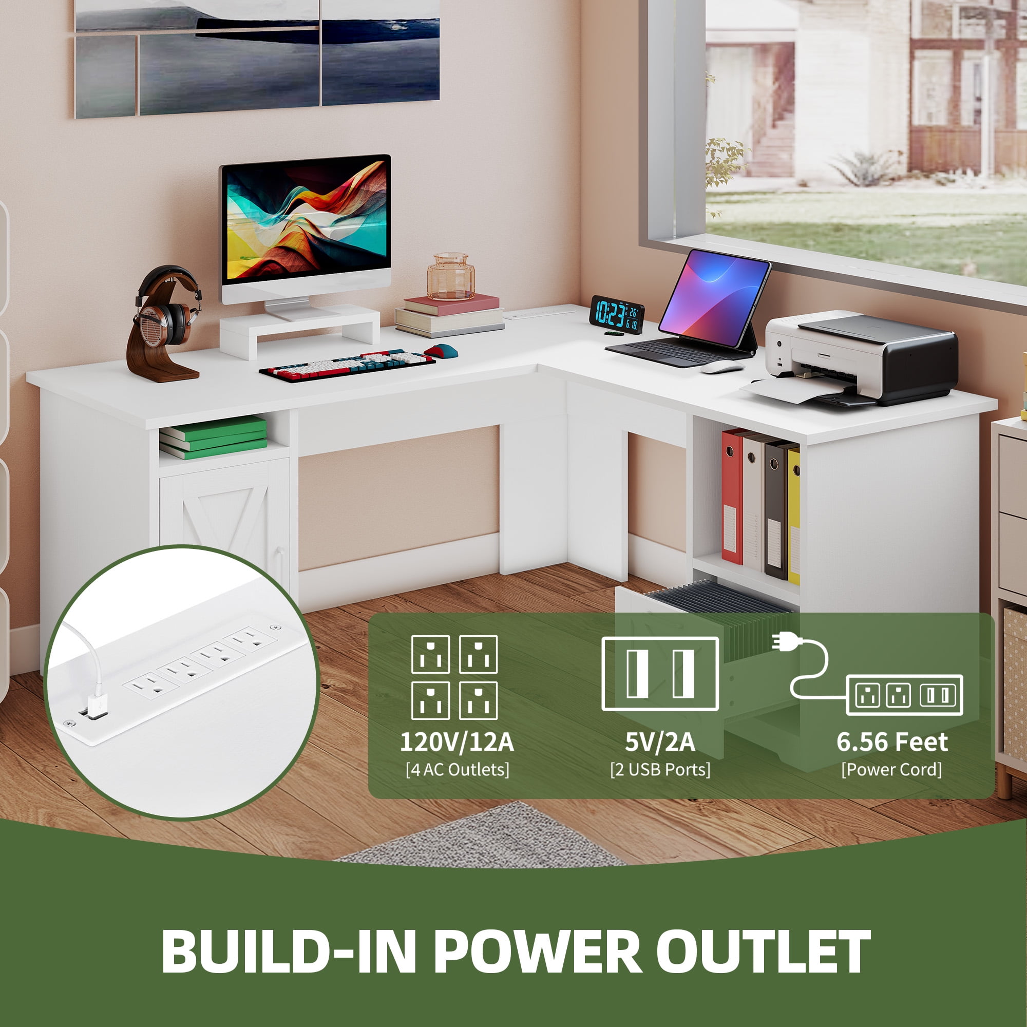 Integrated Power Solutions: Say goodbye to tangled cords and multiple power strips! This desk features 2 convenient USB ports and 4 standard outlets, allowing you to charge your essential devices like laptops, tablets, and gaming accessories directly from the desk. Keep your workspace streamlined and your devices always powered up. Corner-Friendly Design: The L-shaped corner desk is engineered to perfectly nestle into any room’s corner, transforming underutilized space into a productive workstation. It’s perfect for creating a dedicated home office, crafting a cozy writing nook, or setting up an immersive gaming area-all while maintaining a sleek and stylish aesthetic. Comfortable and Adjustable: The ergonomic monitor stand is designed to move and adjust to your needs. Position your screen at the perfect height to maintain a natural posture, reducing eye and neck strain during long hours of work or gaming. This thoughtful design ensures both comfort and efficiency. Organized Storage Solutions: Keep your workspace clutter-free with the desk’s built-in storage options. It provides ample space to store letter- and A4-sized documents, books, and small office supplies, ensuring everything is neatly arranged and easily accessible. This helps you stay focused and boosts your productivity. Adaptable to Your Needs: Whether you’re working, writing, or gaming, this computer desk adapts to your diverse activities. Its flexible design makes it a valuable addition to any home or office, offering a comfortable and efficient space tailored to your specific tasks and preferences.