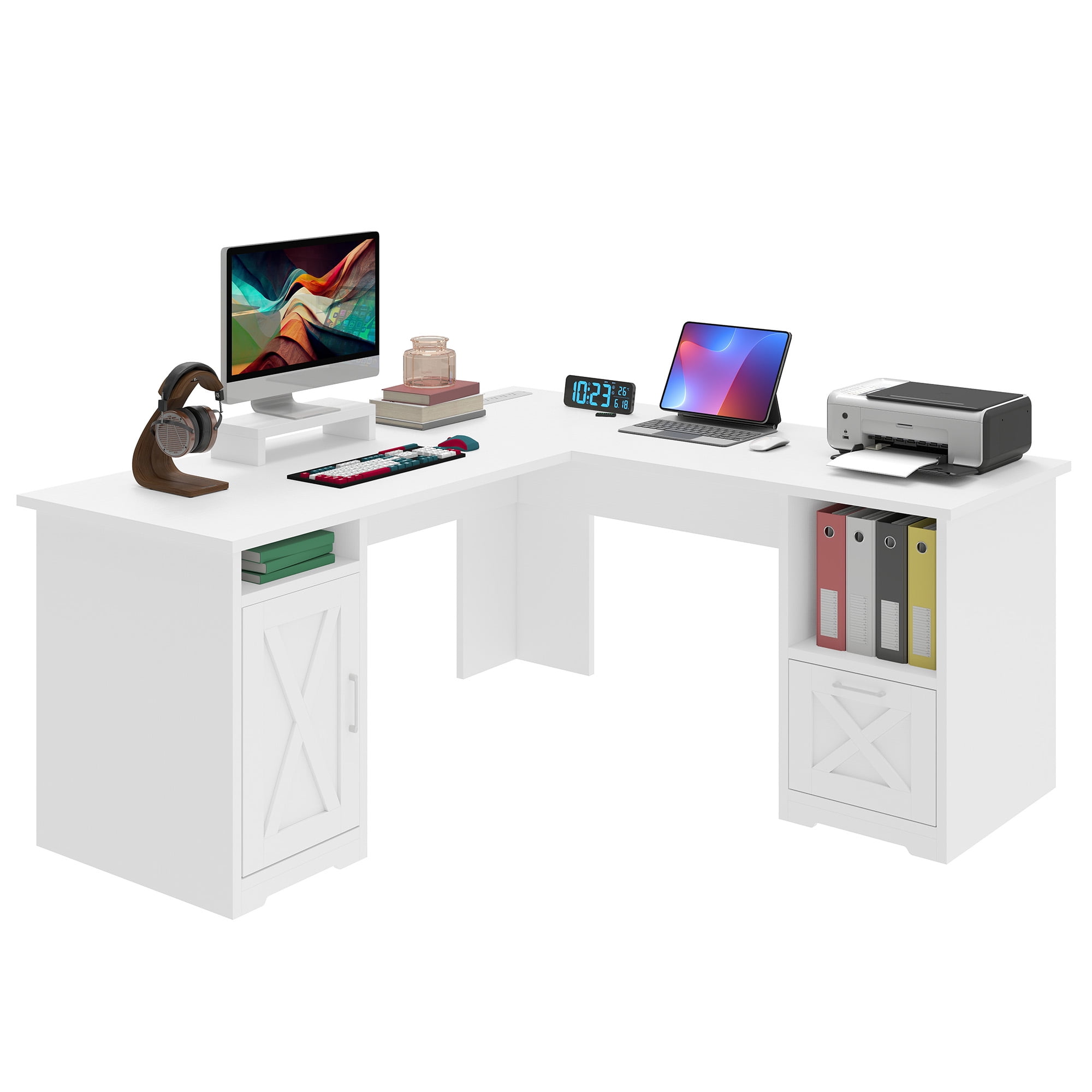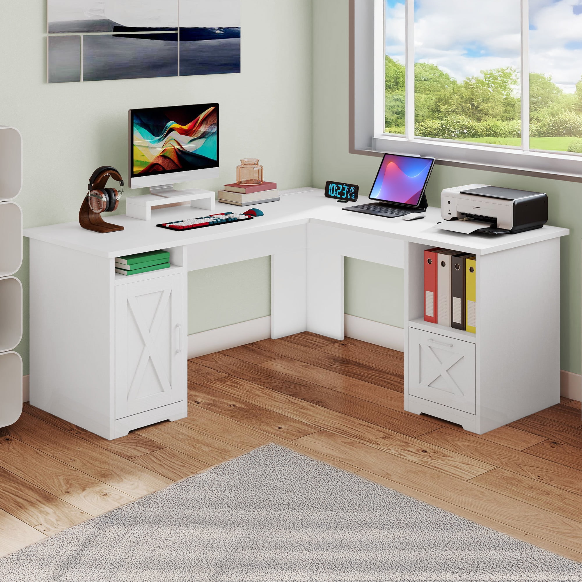 Uforic 59″ L Shaped Desk with Power Outlets,Large Computer Desk with Drawers, Home Office Desk,White