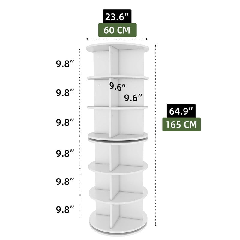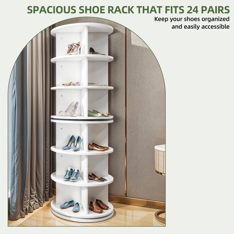 Make the most of your corner with our functional 6-tier rotating shoe rack! Ideal for living rooms, sleeping rooms, or balconies, it turns clutter into a chic display, showcasing your shoes and accessories like a trendy boutique. The 360° rotation lets you grab your favorites easily. Made from robust engineered wood, it’s built to last and won’t wobble. Easy to assemble and featuring a sleek white finish, this stylish marvel keeps your space tidy and your style game strong! Grab your favorites with a spin and let the organizing fun begin! Specifications: Color: White Material: Engineered Wood Overall Size: 23.6″D x 23.6″W x 64.9″H Room Type: Entryway, Bedroom, Living Room, Home Office Assembly Required:Yes Package Included: 1 x Shoe Rack 1 x Instructions 1 x Accessory Kit