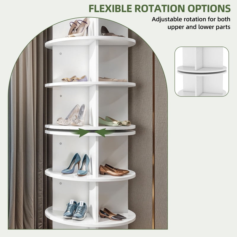 6-Tier Shoe Storage – Organizes up to 18-24 pairs of shoes depending on size and type 360° Rotating Design – Easily spin the rack to access your shoes, bags, and accessories from any angle Space-Saving & Stylish – Perfect for corners, making the most of small spaces while adding a modern touch Divided into Upper & Lower Sections – Features two rotating platforms for convenience Smooth & Quiet Rotation – Equipped with EVA cushioning at the base to reduce noise and protect floors Multi-Functional Storage – Use it for shoes, handbags, books, or even plants—ideal for any room! Easy to Assemble – Includes a clear instruction manual and labeled parts for a hassle-free setup