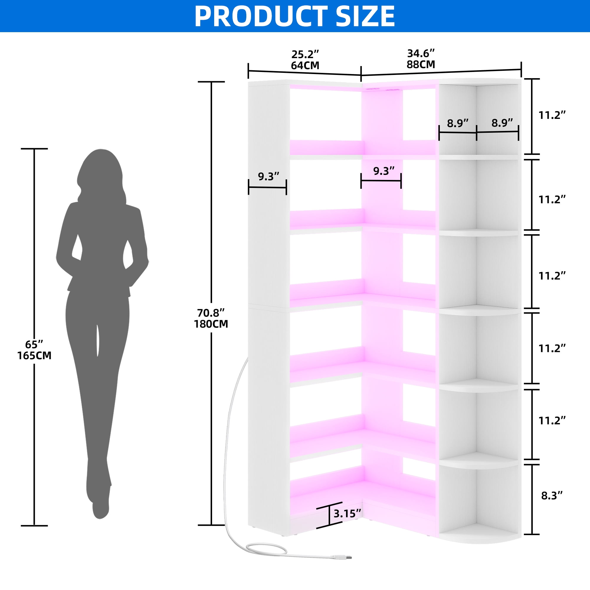 Uforic 6 Tier Bookshelf with LED Light, 70.8 ” Modern White Bookcase, L-Shaped Bookcase Corner shelf Storage Organizer Display Shelf for Home Office, Living Room,Bedroom