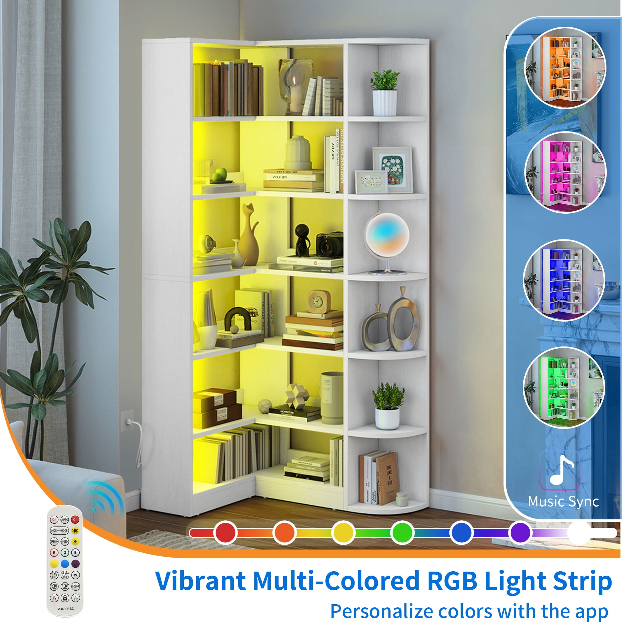 Versatile Exhibition: Embrace our pristine white bookshelf, a symphony of six tiers harmonizing vertical storage and display elegance. Ideal for showcasing an eclectic mix of treasures—be it books, botanicals, memories—its open layout invites seamless accessibility and boundless organizational creativity. Contemporary Opulence: Infuse your setting with the transformative allure of our L-shaped bookshelf, a graceful fusion emboldening any corner with its sleek 90˚ finesse. From nurturing intimate reading alcoves to bestowing sophistication upon your living haven or workspace, this masterpiece radiates a modernity that captivates. Resilient Foundation: Encompassing dual-reinforcement and wall-mounting versatility, our white bookcase stands as a bastion of assurance and steadfastness, resilient even amidst homes animated by spirited companions. Bask in the reassurance of exhibiting your treasures with composure and serenity. Enduring Artistry: Meticulously fashioned from enduring engineered wood, our resilient 6-tier corner bookshelf promises stalwart longevity and enduring charm, a testament to steadfast style and functionality destined to endure through the years. Innovative Progressions: Immerse in unparalleled convenience with our L-shaped masterpiece, boasting a certification of excellence and an LED light ensemble controllable by app or remote means. Revel in its Sync capabilities, dimmable allure, timed precision, and a gamut of hues, as it elevates your space with a melange of sophistication and adaptability like no other.