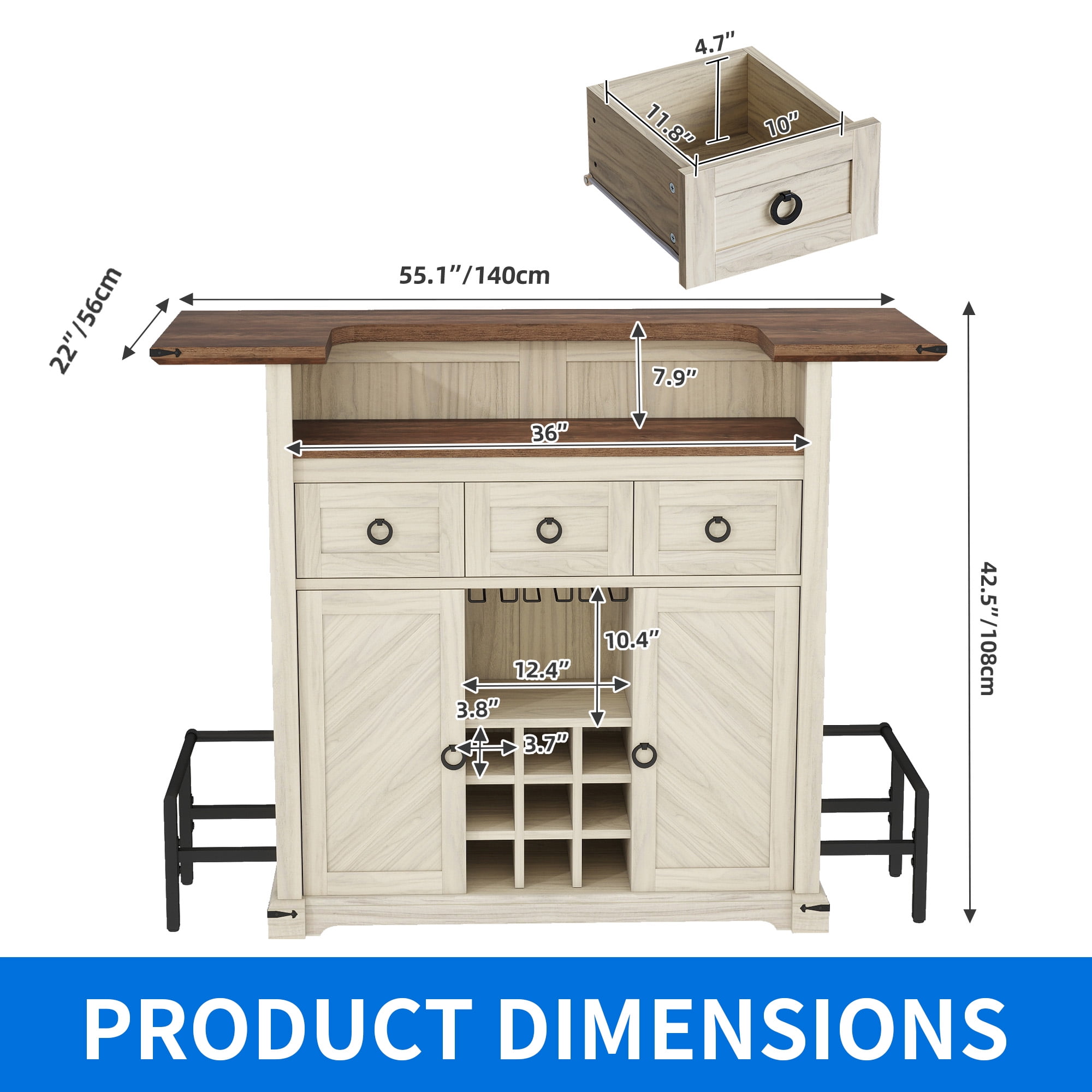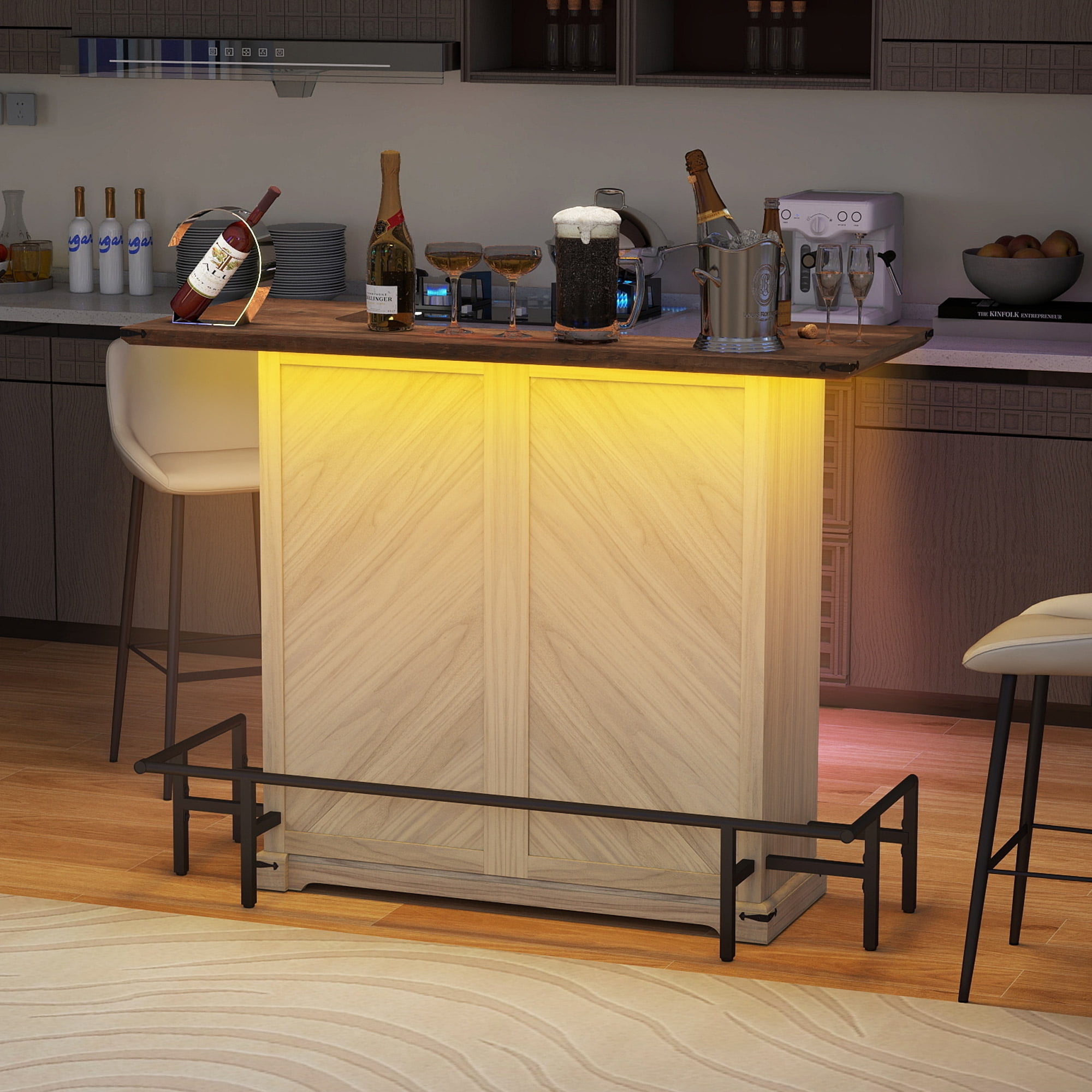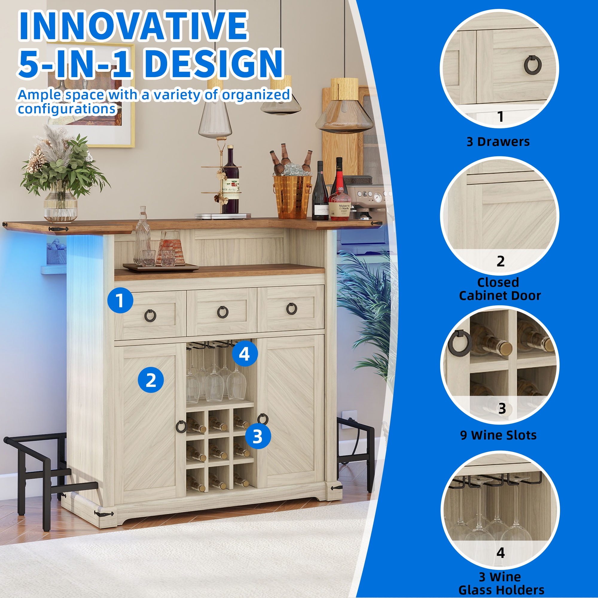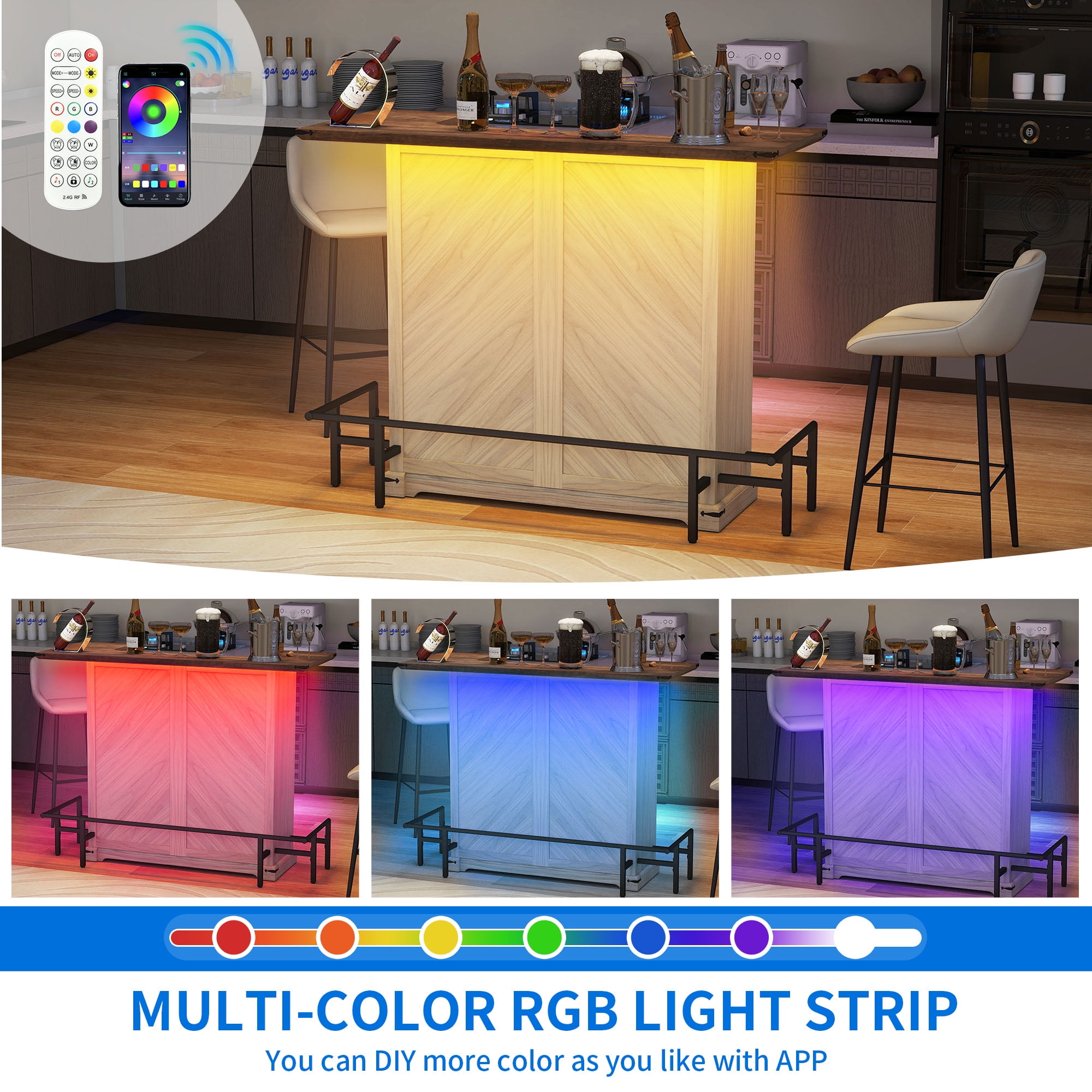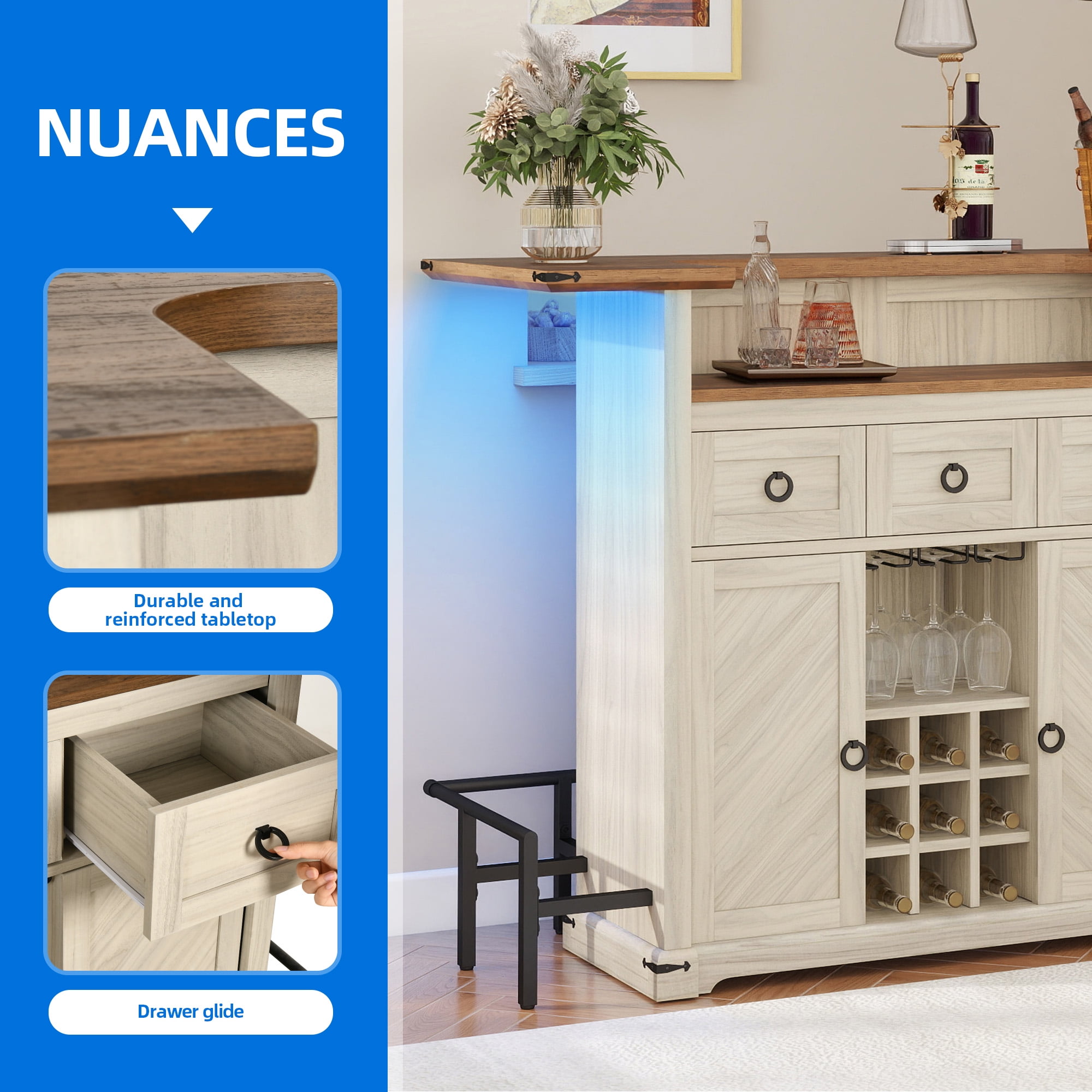 Organic Elegance: Embrace the allure of nature with Uforic furniture collection, harmoniously blending earthy tones and wooden accents to evoke a rustic yet sophisticated charm, enveloping any space in comfort and tranquility. Illuminated Entertainment Hub: Elevate your hosting prowess with our bar cabinet, adorned with LED strips offering a palette of 7 colors and diverse lighting modes. Effortlessly adjust the ambiance to create a soothing and chic setting, enhancing every gathering with a touch of refinement. Efficient Storage Solution: Our compact mini bar table cabinet boasts three drawers, dual storage tiers, versatile adjustable shelves, stemware racks for 12 glasses, and dedicated wine compartments accommodating 9 bottles. Crafted with practicality in mind, elevate guest comfort and convenience with every gathering. Versatile Functionality: Experience the flexibility of a multi-purpose tabletop design, bolstered by non-slip pads, additional stabilizing feet, and a protective guard rail. Perfect for a range of activities, this unit seamlessly integrates into any living area, adding both functionality and style. Robust Build, Effortless Setup: Engineered with sturdy materials and a reliable base, our bar cabinet ensures enduring stability for long-lasting enjoyment. Streamlined assembly is facilitated by comprehensive instructions and included accessories, guaranteeing a hassle-free setup and maintenance experience. Product Net Content Uom: 1* Home Bar Unit