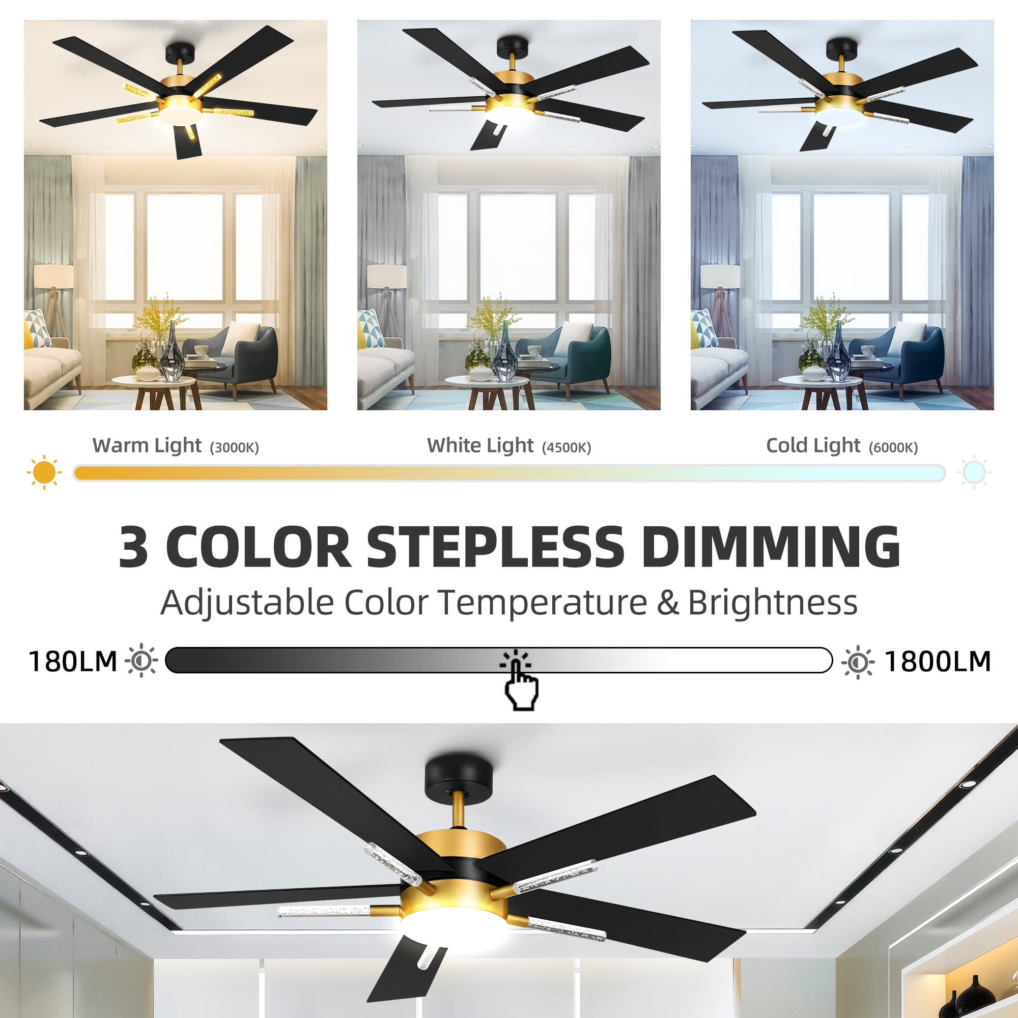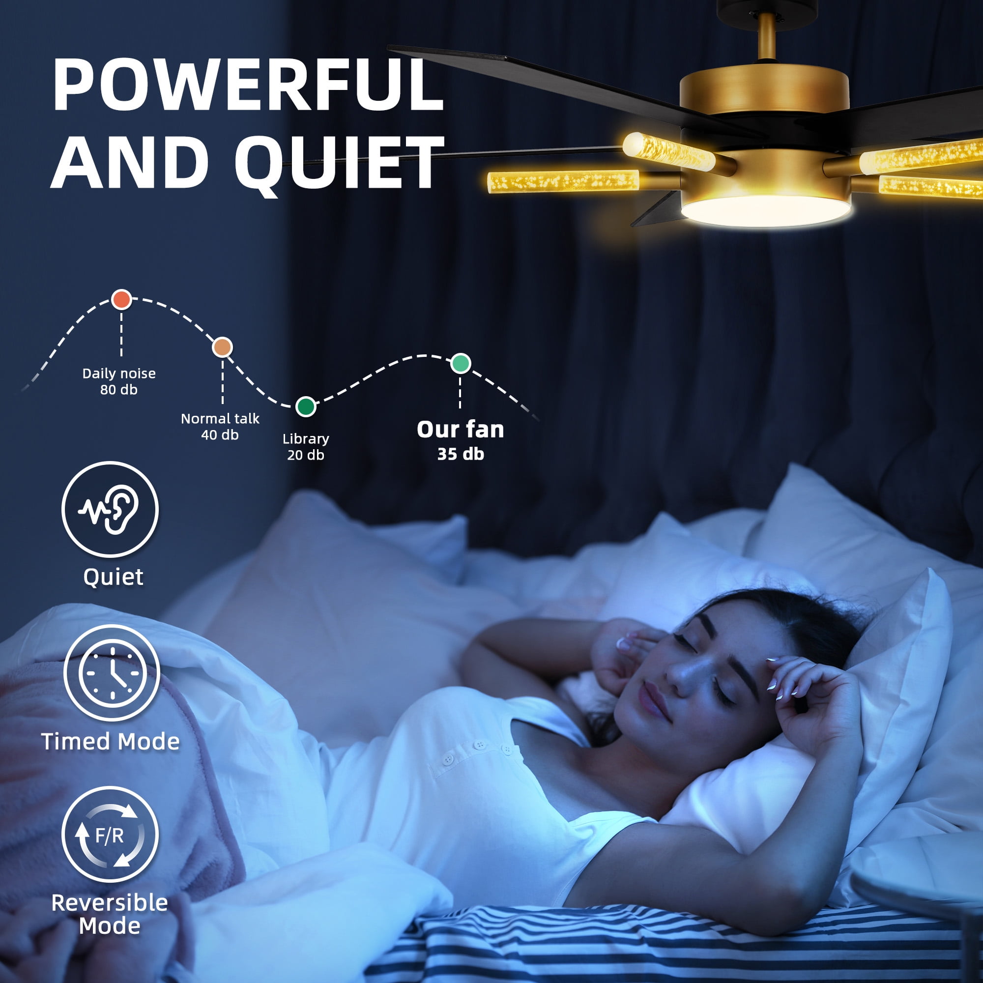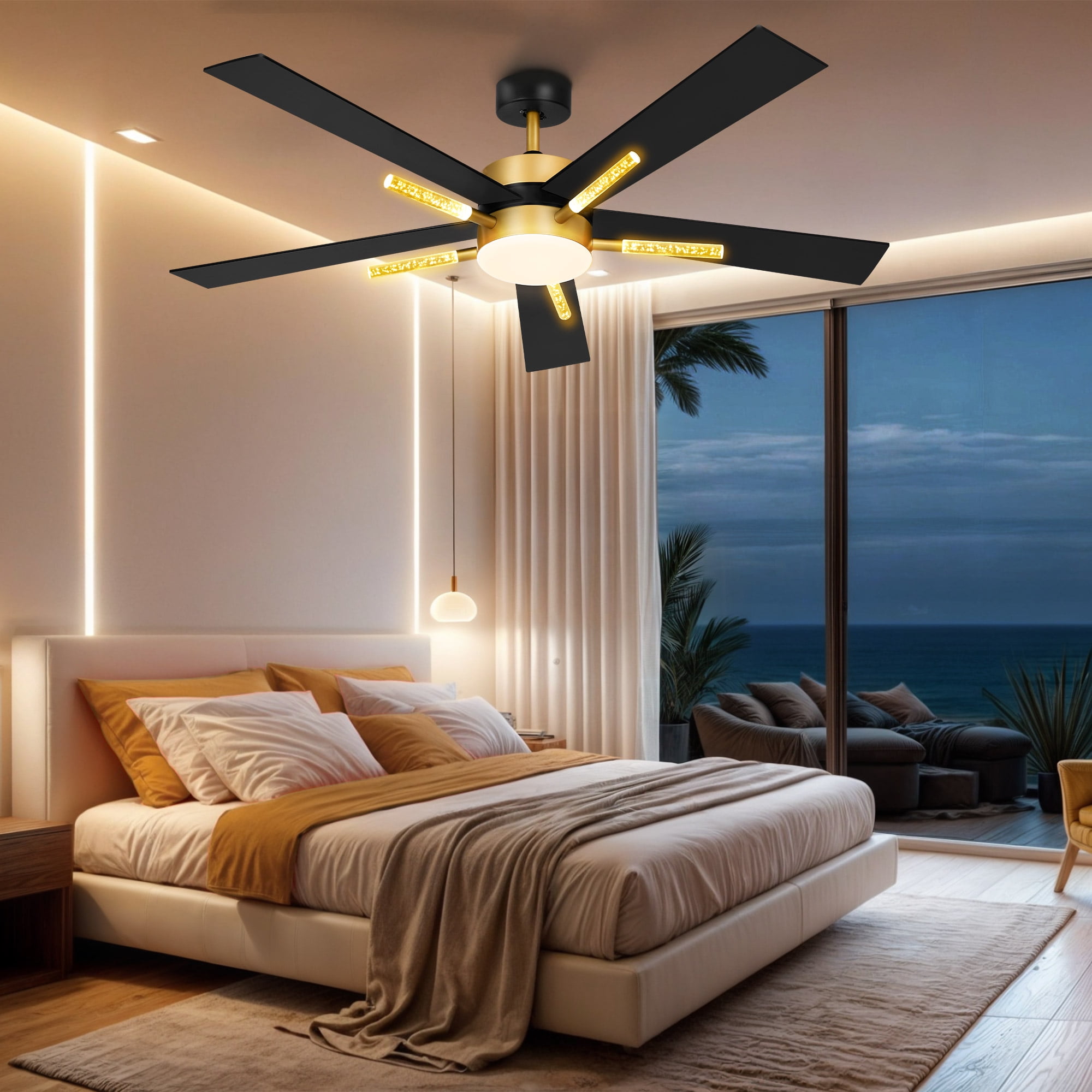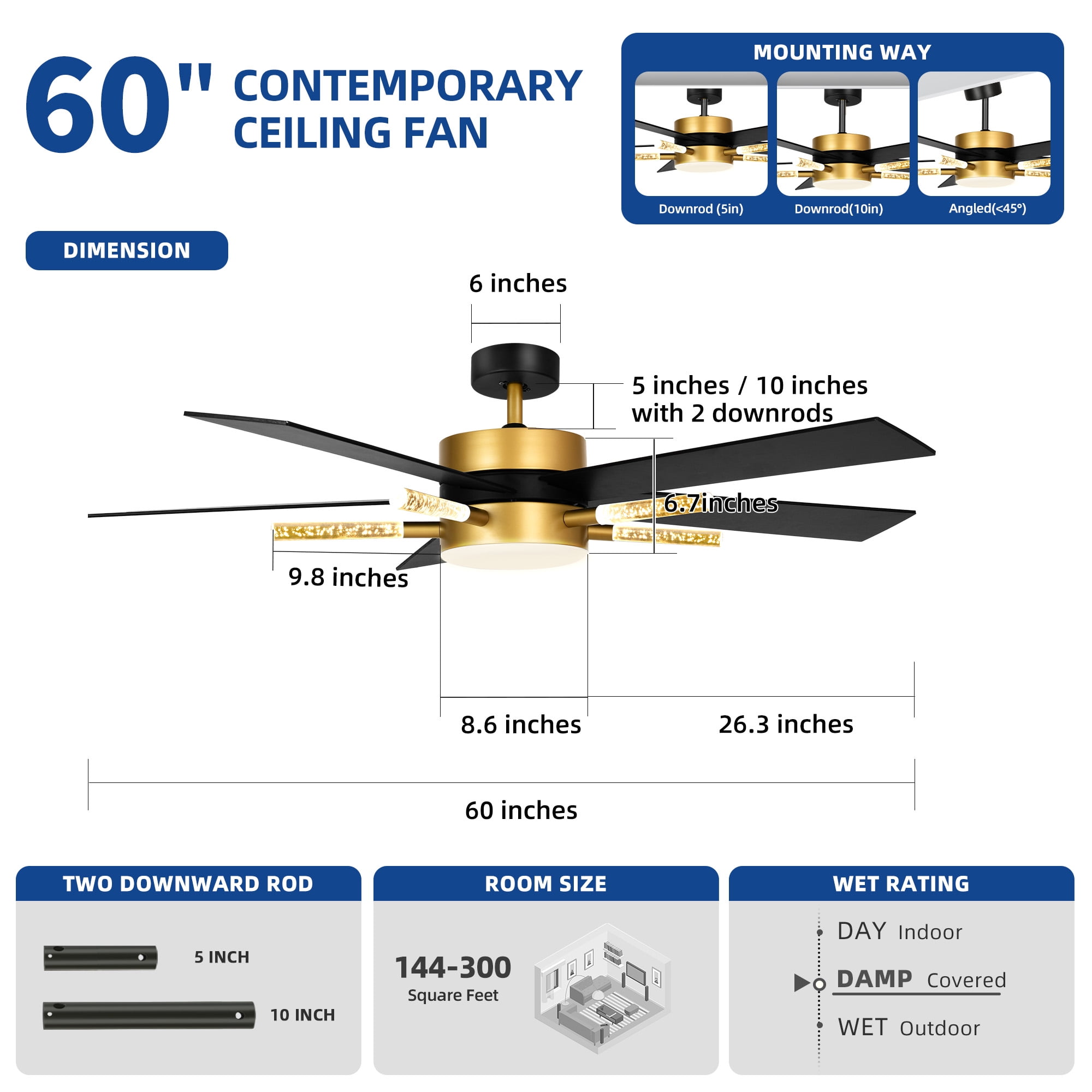 Custom Crystal Design: Turn heads with our crystal-enhanced ceiling fan! These shimmering rods not only upgrade your decor but also create mesmerizing light patterns, adding a touch of luxury and modern flair to any room. Adjustable LED Brilliance: Light up your life with our versatile LED ceiling fan! From cozy warm glows to bright daylight hues, set the ideal mood for every occasion. Dim or brighten with ease for intimate dinners or lively gatherings. Silent 6-Speed Motor: Embrace serene breezes with our silent 6-speed motor, operating under 35dB for a peaceful ambiance. Effortlessly control it via remote, set a convenient timer for energy efficiency & enjoy its memory function for easy adjustments. All-Season Comfort: Stay cozy year-round with our innovative 5-blade marvel! Its DC motor reverses airflow for cooling in summer and circulating warmth in winter. Efficient and effective, it promises comfort and savings without compromise. Effortless Setup: Upgrade with ease using our breeze creator! Includes 5-inch and 10-inch rods for any ceiling height, plus all you need for quick setup. Transform your space with style and function!