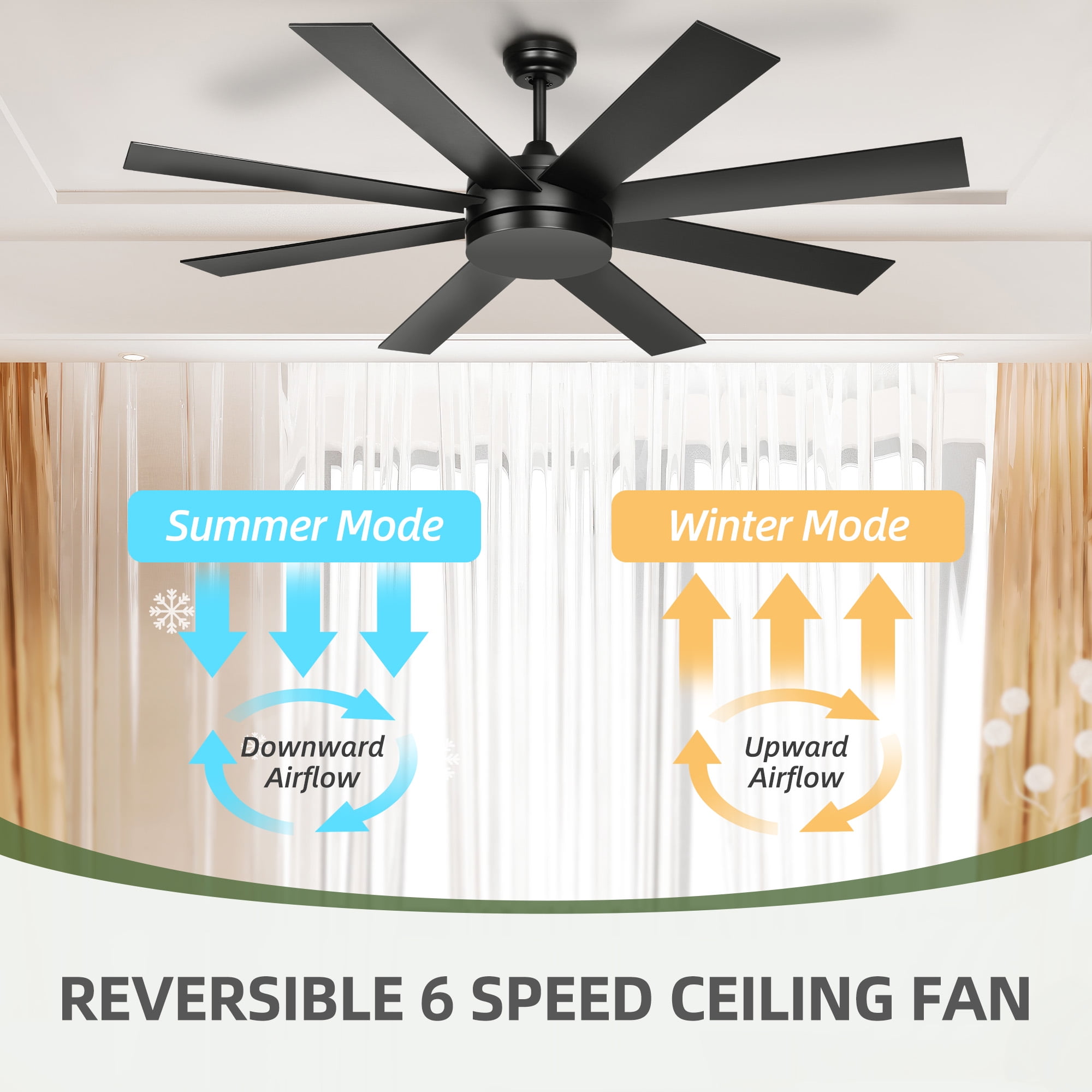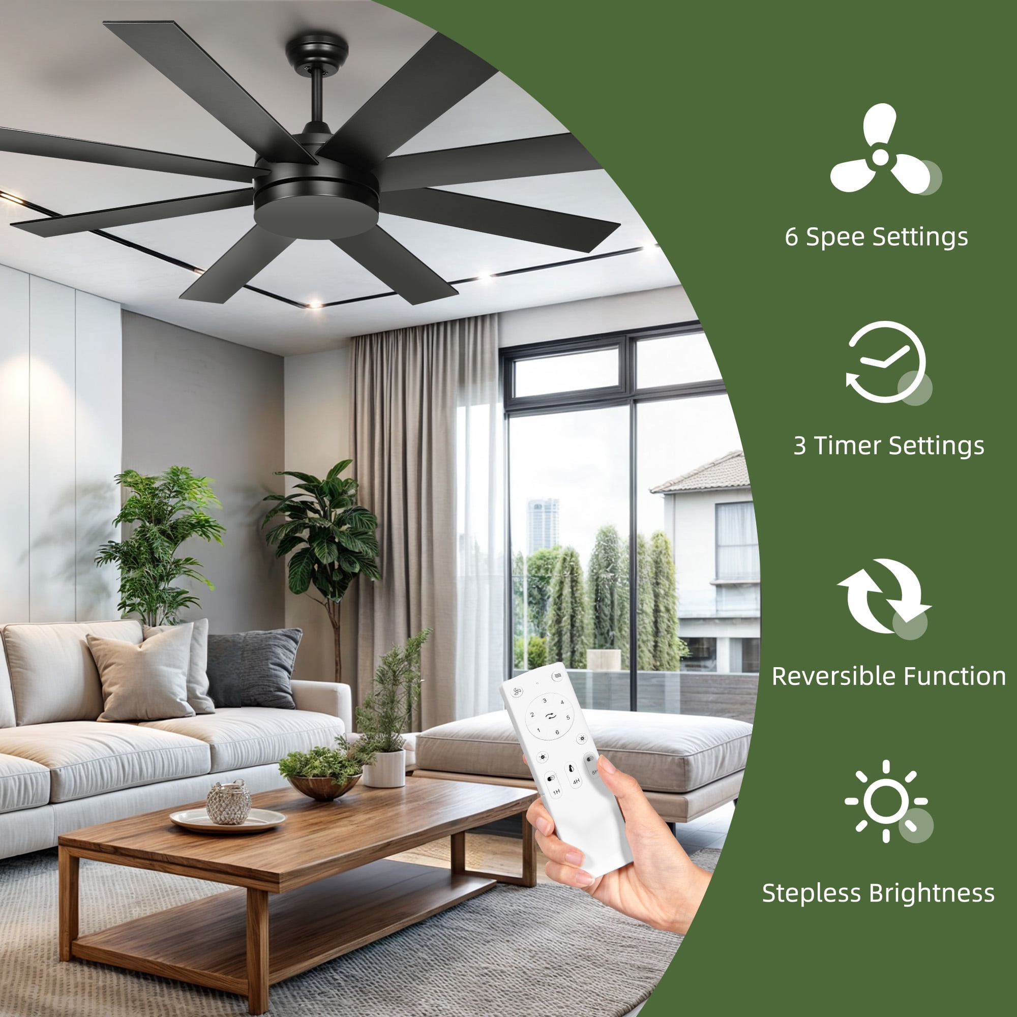 Contemporary Design with ETL Certification: This modern black ceiling fan carries an ETL certification, ensuring safety and quality. Its sleek profile and processed ABS fan blades offer durability and water resistance, making it suitable for indoor or covered outdoor spaces. It’s a stylish addition that showcases your taste to guests. Simple and Straightforward Assembly: This ceiling fan comes with both a 5-inch and 10-inch downrod, allowing for either downrod or angled mounting options. It includes pre-installed wire clips, instructions, a balance kit, and all necessary accessories for straightforward wire connection and installation, making the setup process easy and hassle-free. Quiet and Versatile 6-Speed Motor: Equipped with a silent DC motor, this outdoor ceiling fan operates at a quiet 35db, providing a tranquil environment for various activities such as reading, working, or sleeping. The 6-speed settings allow you to customize the airflow to your preference. Innovative Remote Control: The remote control for this ceiling fan operates with a tap and a silent beep, making it user-friendly. It features a timer function with settings of 1, 2, 4, or 8 hours, enhancing convenience, health, and energy efficiency. The wall-mount holder is a thoughtful addition for easy storage. All-Year Airflow Control: The reversible switch on this ceiling fan without a light lets you change the direction of the airflow, ensuring cool air in summer and evenly distributed warm air in winter, keeping your space comfortable throughout the year.