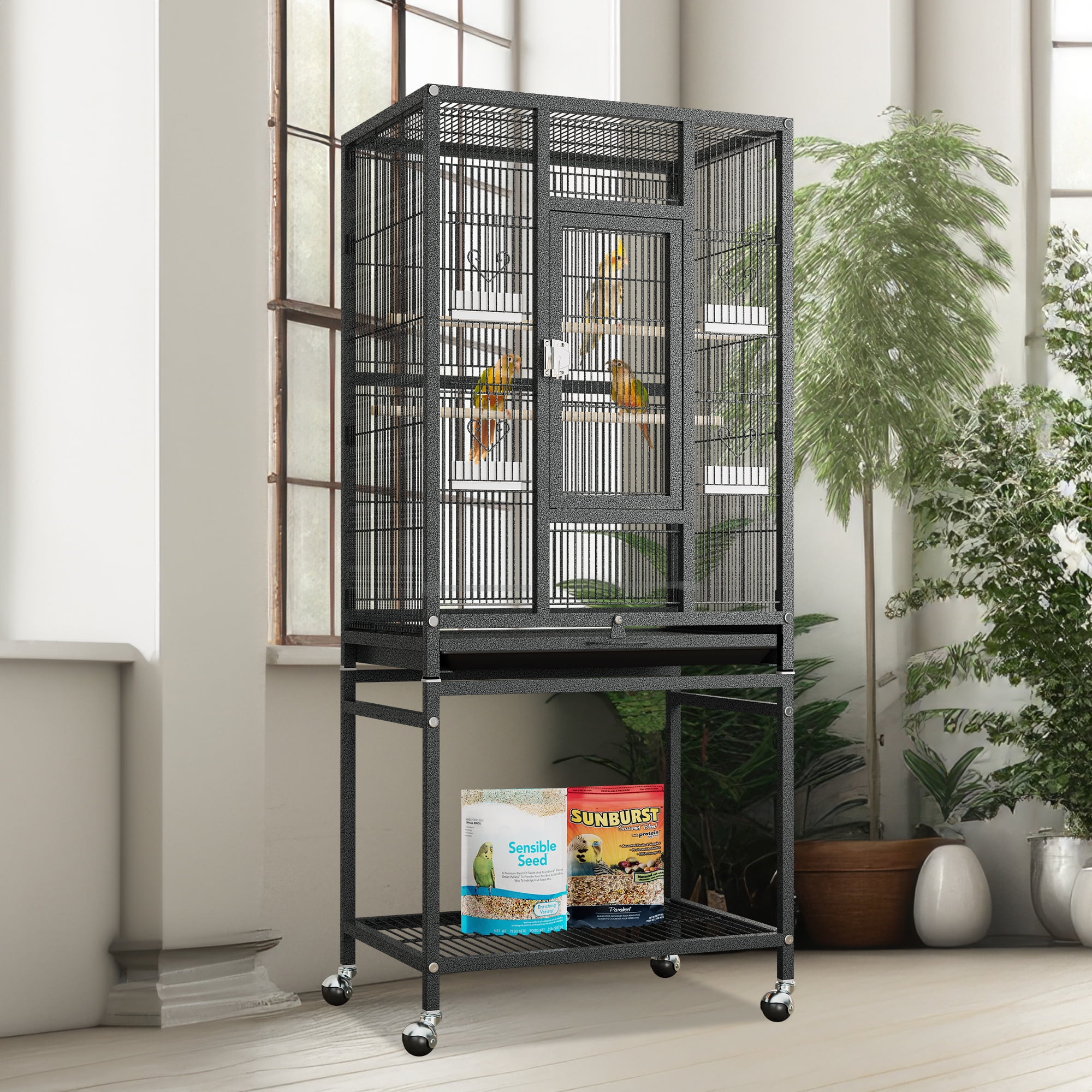 Uforic 62″ Metal Birdcage with Rolling Stand and Castor Wheels, Large Parrot Cage with 3 Perches and 4 Feeders, Slide-Out Tray, Black
