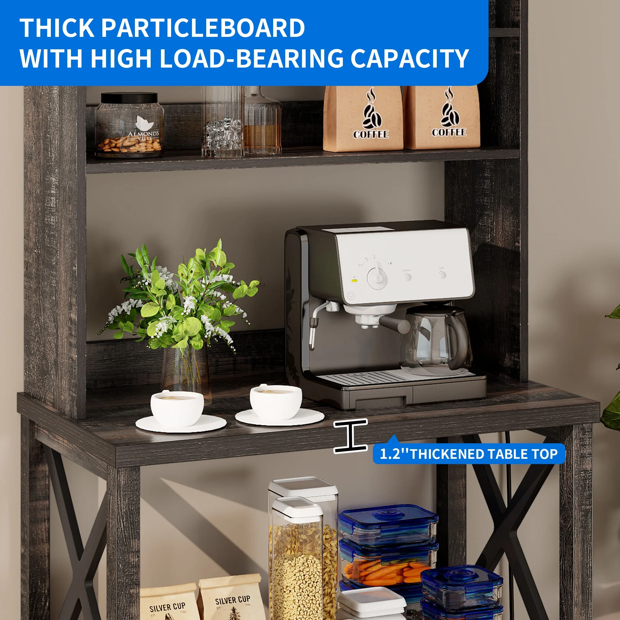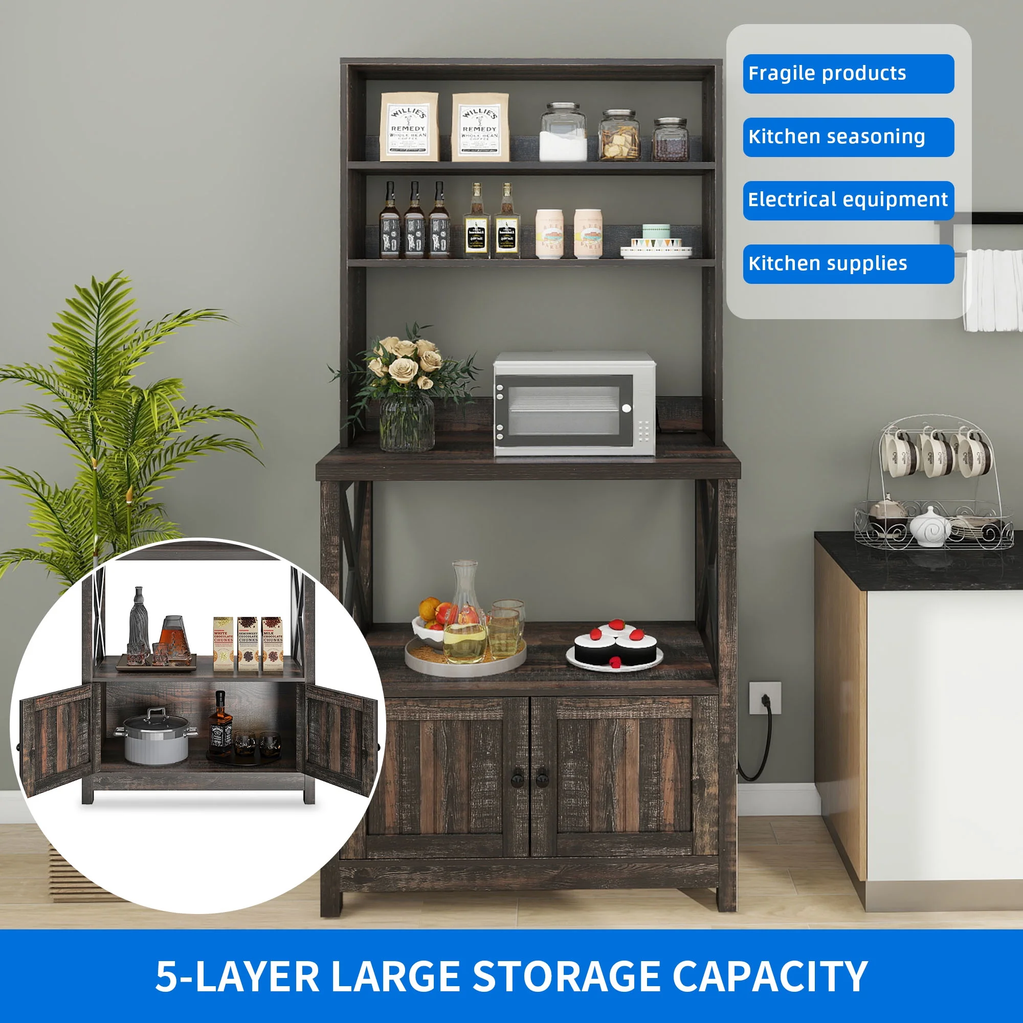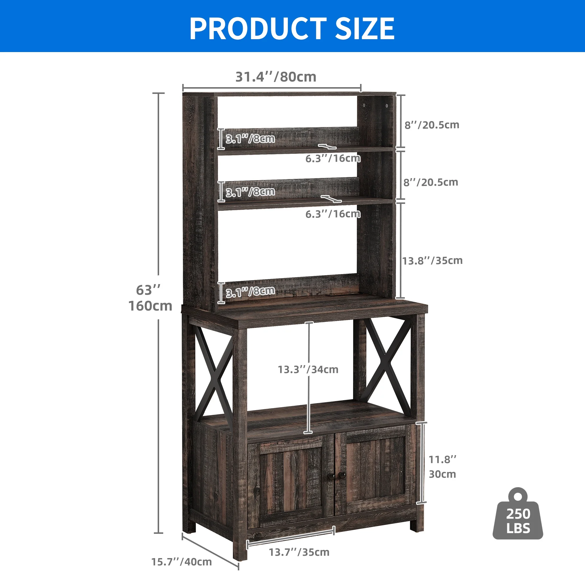 Ample Storage: Organize your kitchen items effortlessly with the 4-tiered shelves on the Uforic Baker’s Rack, ensuring everything has its designated place Doors Design: The inclusion of a cabinet with doors on this baker’s rack ensures that your stored items are protected from dust and stains, maintaining their cleanliness and quality Charging Station: Enjoy the convenience of 2 power outlets and 2 USB ports integrated into the design, allowing for easy charging of your devices directly on the microwave stand High-Quality Material: Crafted from premium MDF board, this kitchen baker’s rack is exceptionally sturdy, durable, and boasts excellent weight-bearing capacity, providing a reliable storage solution for your home Versatile Usage: With ample storage space and convenient charging features, this Baker’s Rack can be utilized in various spaces such as the kitchen, living room, dining room, and more, adding functionality to different areas of your home Easy Assembly: Follow the provided instructions for a hassle-free setup of this Baker’s Rack, ensuring a smooth and straightforward installation process Customer Service: Your satisfaction is our priority. For any inquiries, feel free to contact us via email. Rest assured, any issues will be promptly addressed to ensure your complete satisfaction