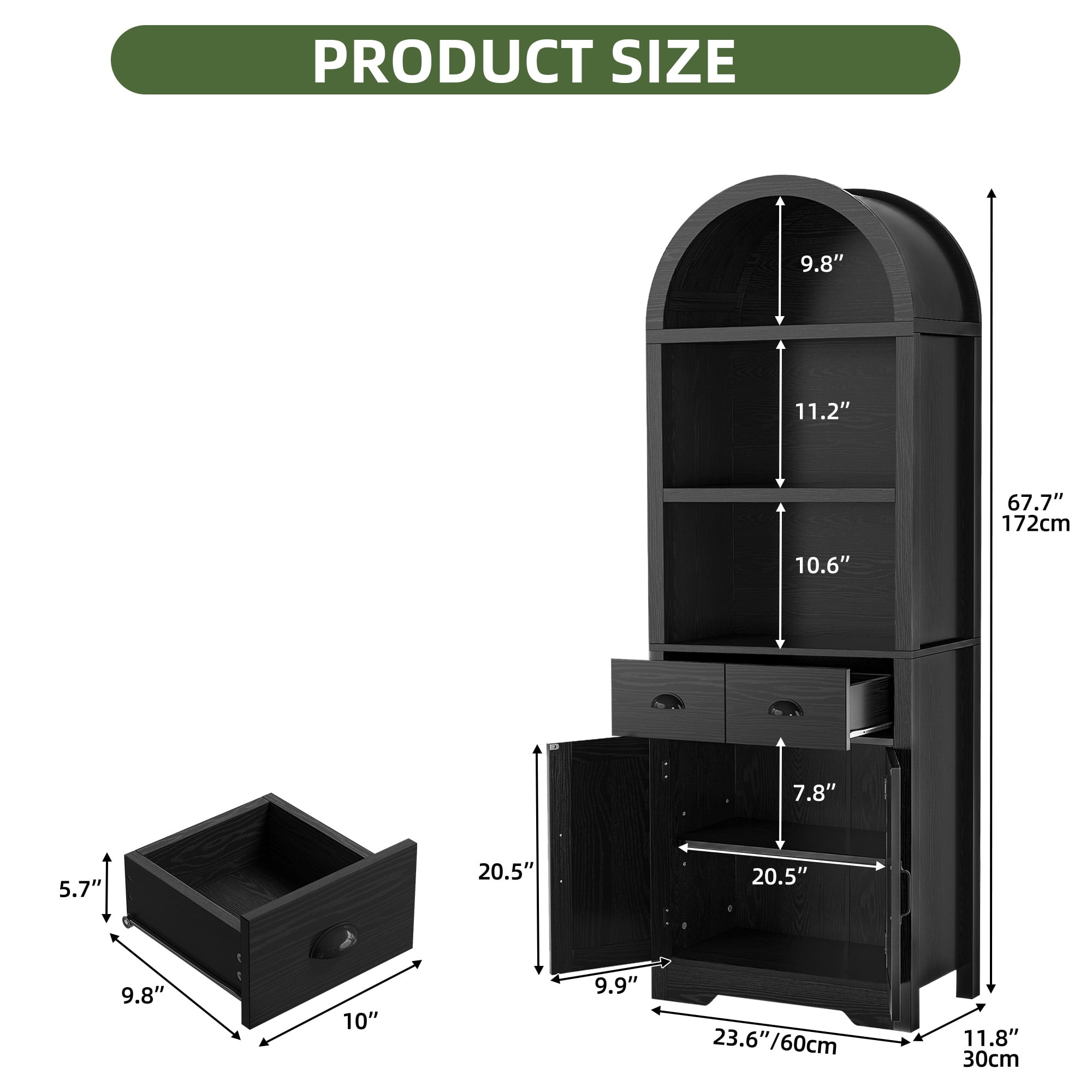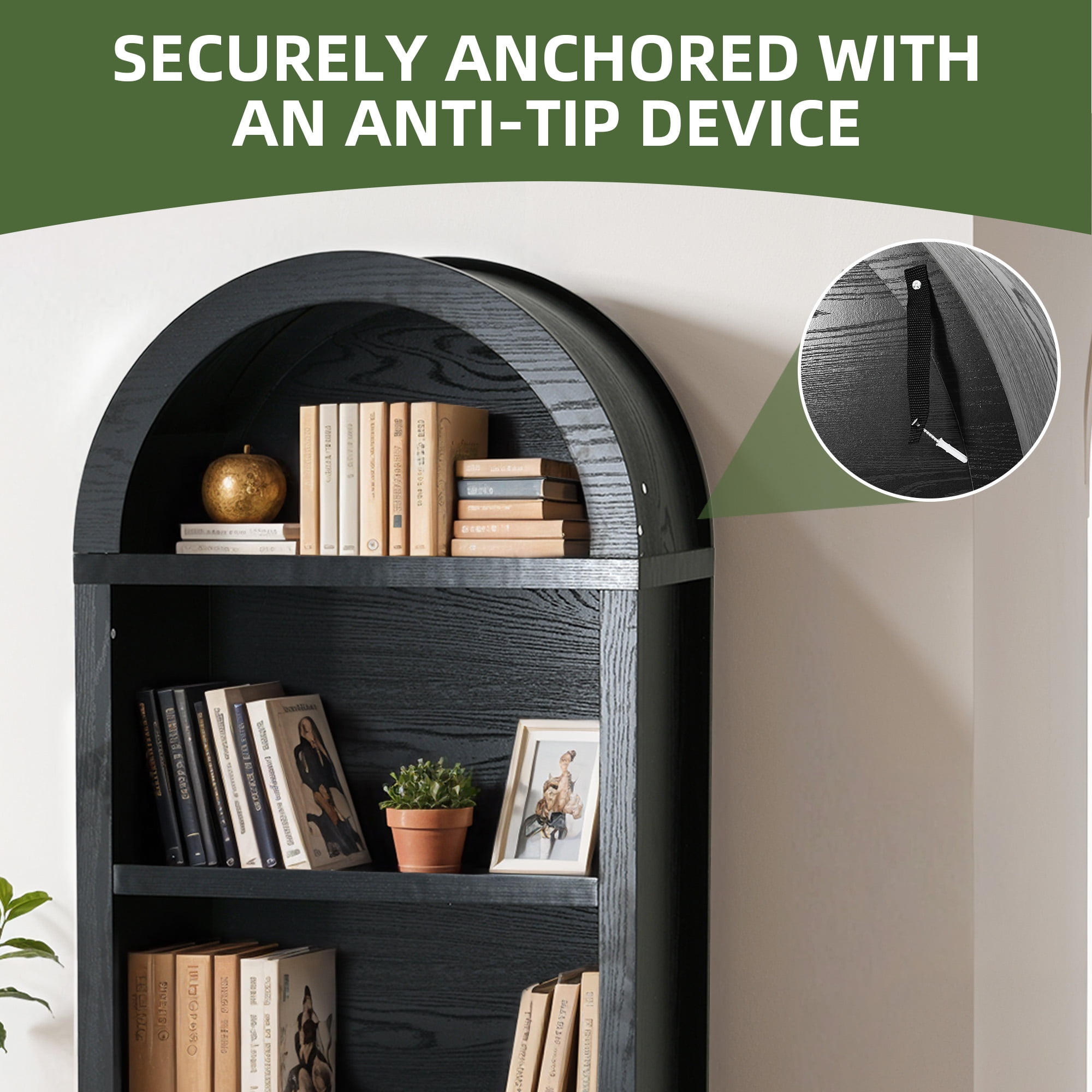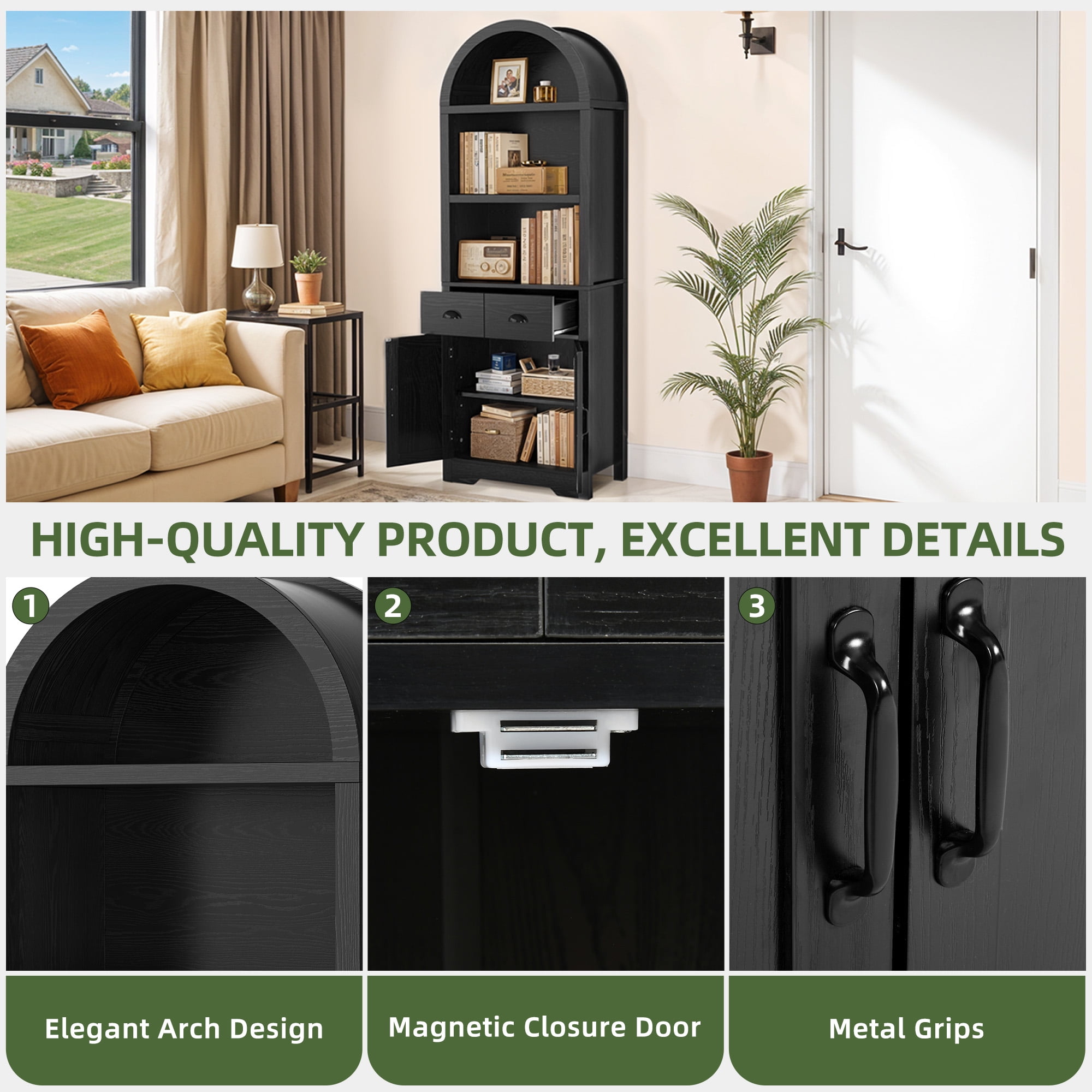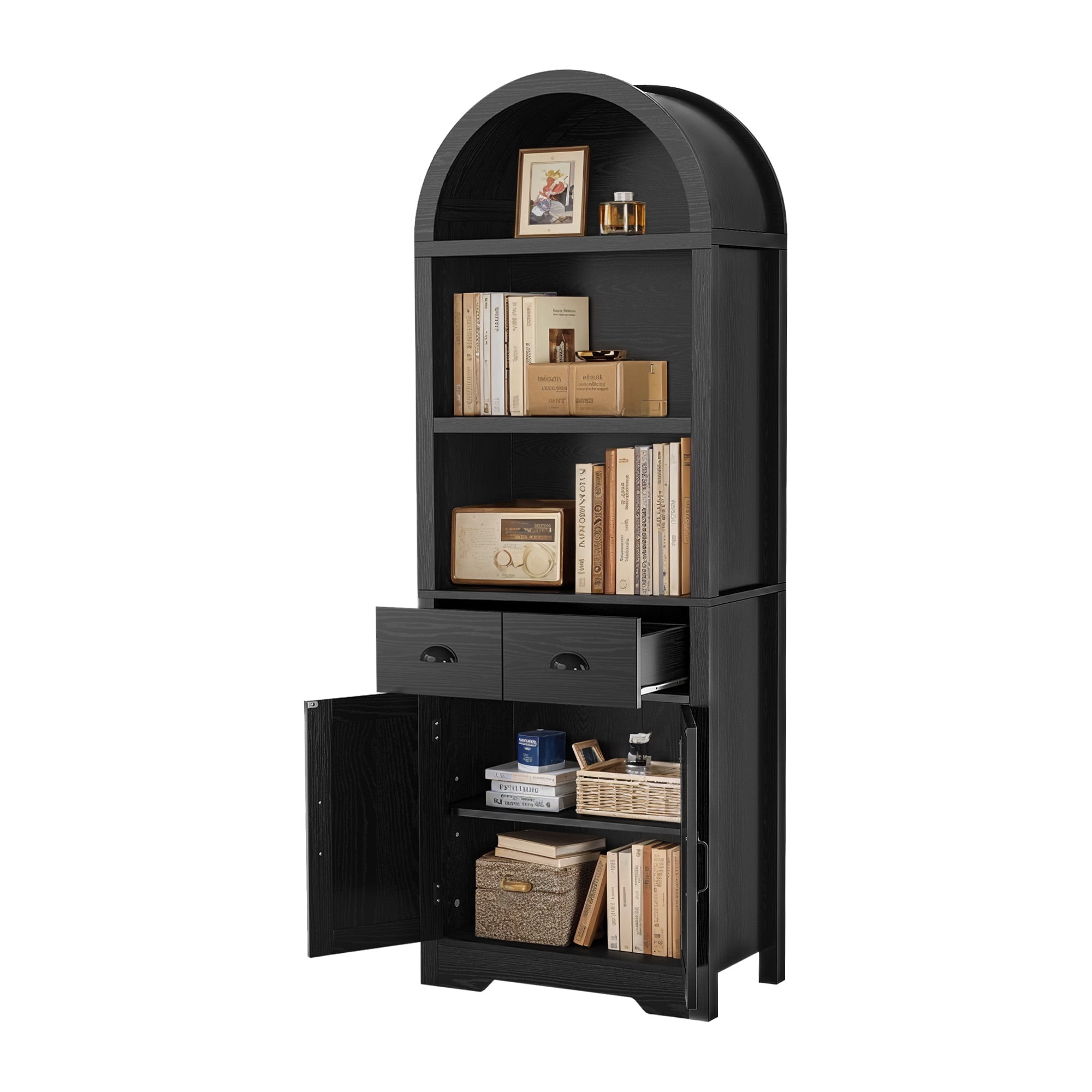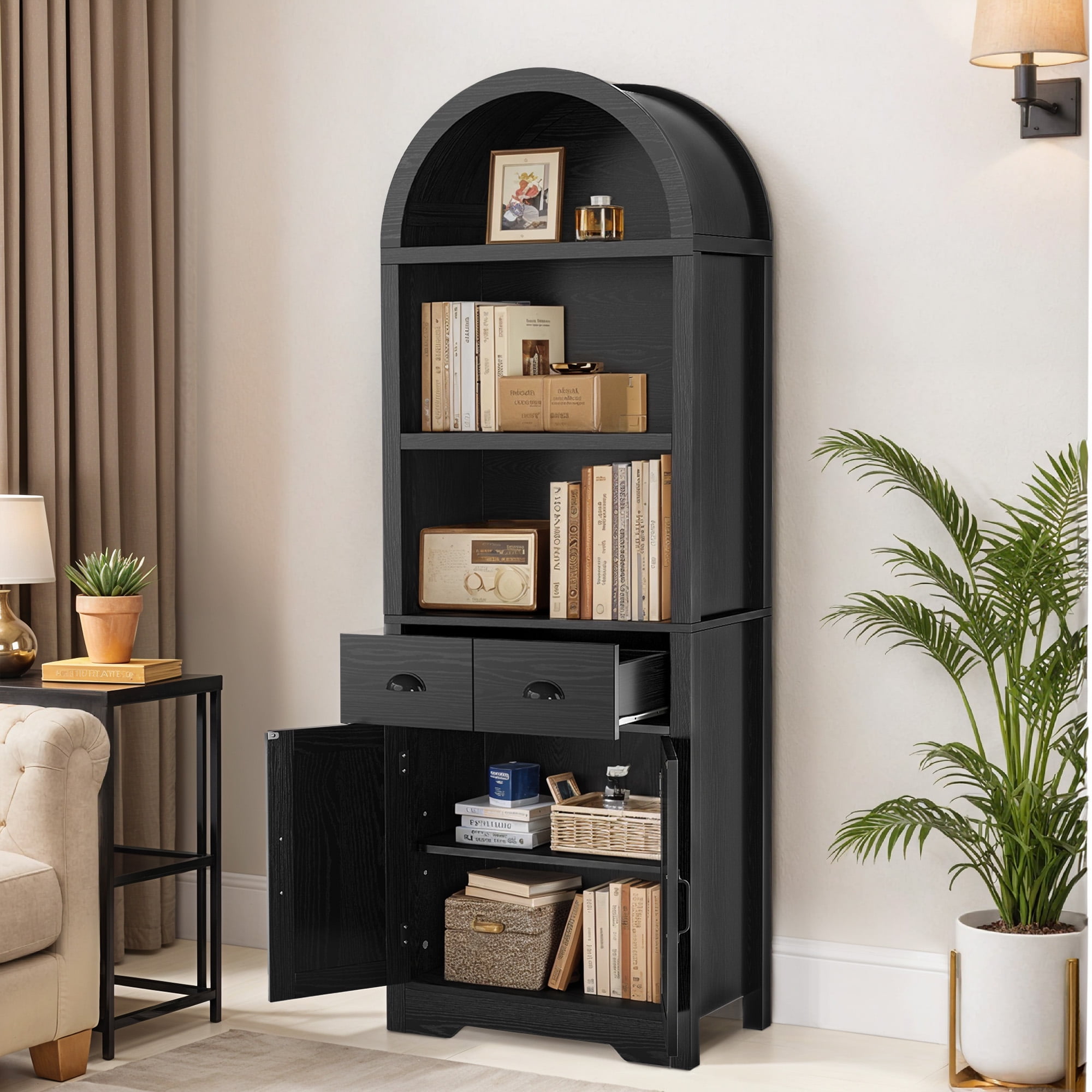 Chic Arched Bookshelf: Enhance your home with our tall arched bookshelf. Offering both open and concealed storage, it blends modern elegance with practicality to help you organize and display your essentials beautifully. Multi-Storage Bookcase: Our arched bookcase offers 3 spacious shelves for your decor and books, 2 drawers for organizing essentials, and a cabinet with an adjustable shelf, providing versatile storage for items of all shapes and sizes Adaptable Storage Solution: More than a bookshelf, this multi-purpose storage piece can easily double as a kitchen cabinet, entryway organizer, or more, bringing smart, flexible storage to any space in your home while enhancing its functionality. Built for Longevity: Made from robust engineered wood, our bookcase is designed to last with a strong load-bearing capacity for years of use. Plus, it includes non-tipping kits for stability, preventing wobbling and keeping your items secure. Simple Assembly: Our tall bookshelf is designed for effortless assembly, featuring clear instructions and pre-labeled parts that make putting it together quick and easy, so you can enjoy your organized space right away.