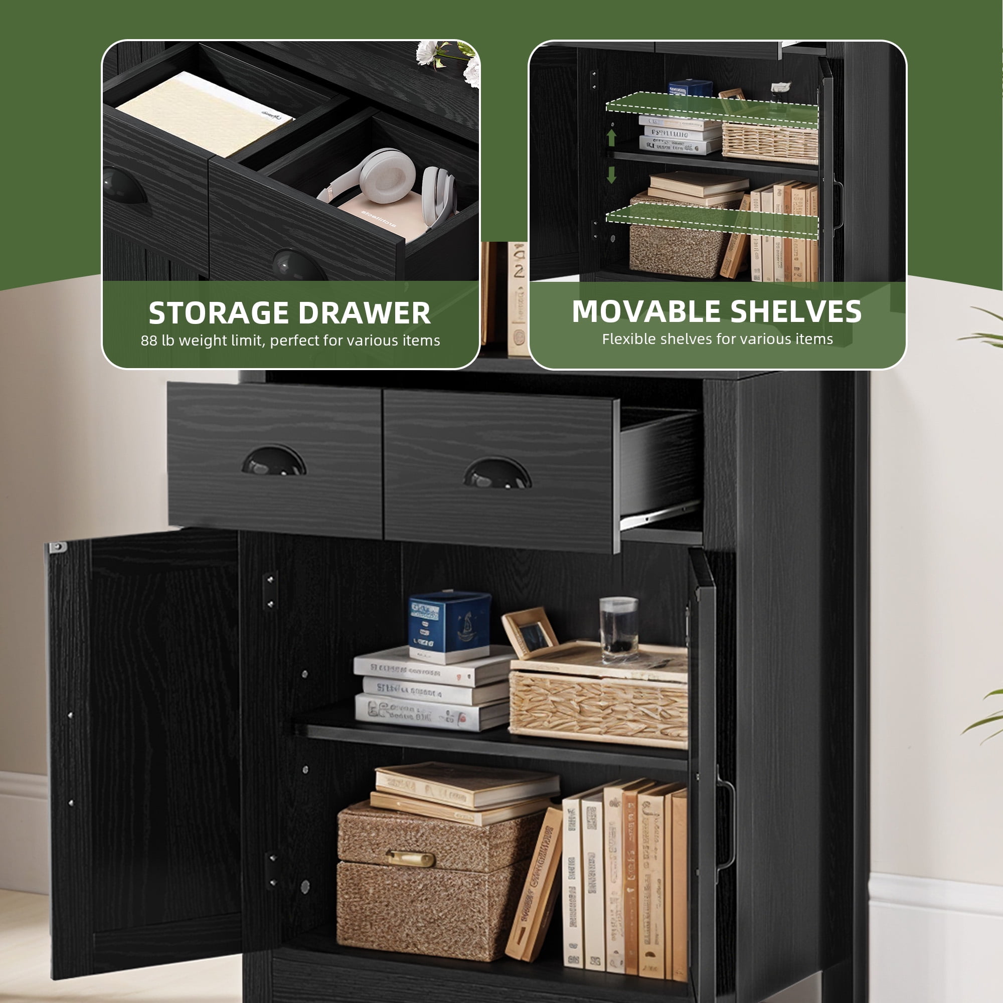 This ain’t your average bookshelf, it’s a statement piece. Its arched design is seriously chic, and those hidden storage spots are a total game-changer. With 3 shelves, 2 drawers, and a cabinet with an adjustable shelf, this beauty keeps your space organized and stylish. Whether you’re storing books, decor, or kitchen essentials, this tall black bookcase has you covered. Say goodbye to clutter and hello to a beautifully organized space. Specifications: Color: Black Material: Engineered Wood Overall Size: 11.8″(D)x23.6″(W)x67.7″(H) Room Type: Living Room, Kitchen, Entryway Assembly Required: Yes Package include: 1 x Bookshelf 1 x Instructions 1 x Accessory Kit
