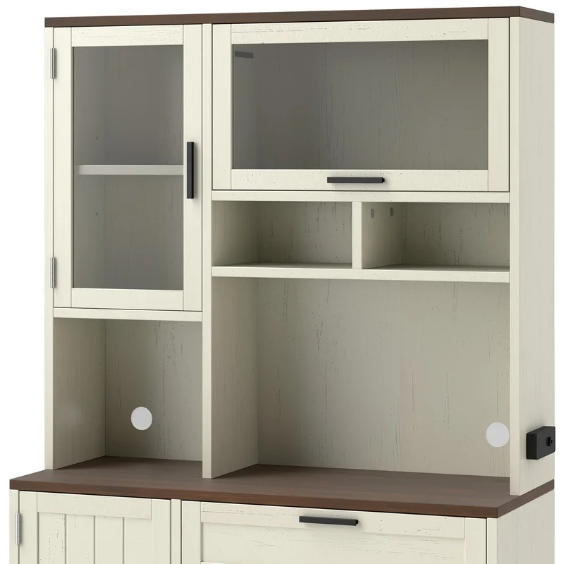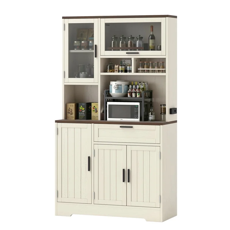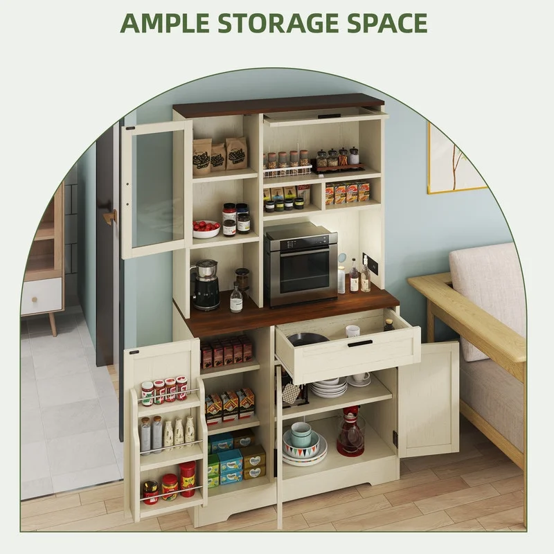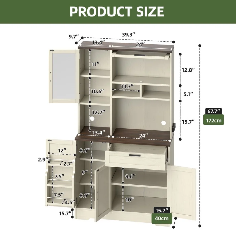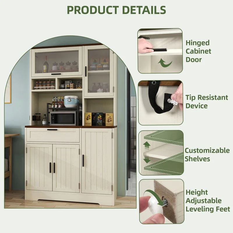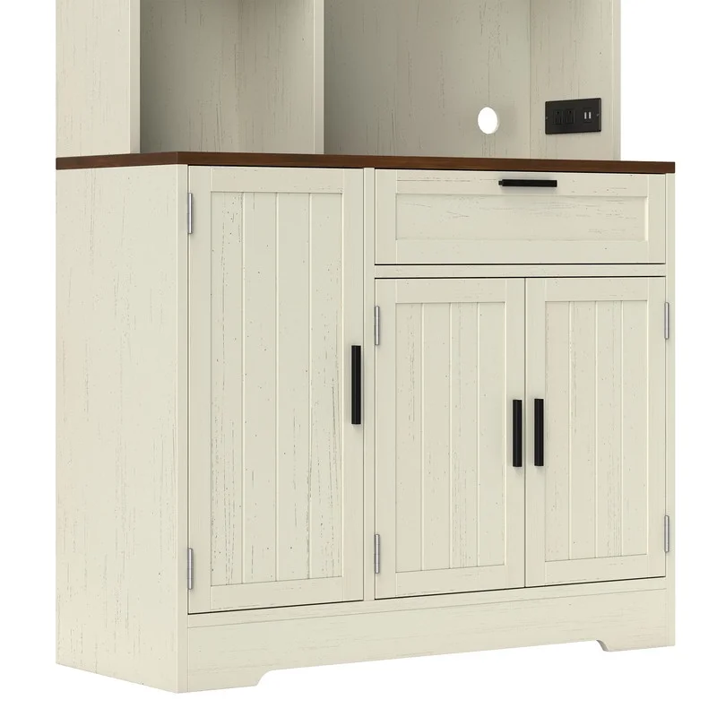 Massive Storage Magic: This pantry cabinet turns chaos into order with its multiple compartments, keeping everything from spices to pots in one spot. The adjustable shelf handles tall items, while the smooth-sliding drawer keeps your things secure and tidy. Convenient Charging Hub: We’ve added 2 outlets and 2 USB ports, making it super easy to plug in your kitchen gadgets like microwaves and coffee makers. No need for a messy power strip. The large cutouts keep cords tidy, so you can focus on your culinary creations. Stable & Durable: Equipped with tip-proof kits, this pantry cabinet secures to the wall, ensuring safety. Crafted from durable engineered wood, it’s strong enough for your heavy kitchen gears. Stability and durability are no longer a worry. Charming Country Vibes: Infuse your kitchen with the delightful charm of farmhouse style. The warm white walnut finish and chic stripes create a cozy atmosphere, ensuring you enjoy entertaining and whipping up delicious meals. Quick Setup & Easy Care: With pre-labeled parts and clear instructions, assembling this pantry cabinet is as easy as pie. Its finish requires little cleaning, so you can enjoy more time doing what matters without worrying about tedious cleanup.