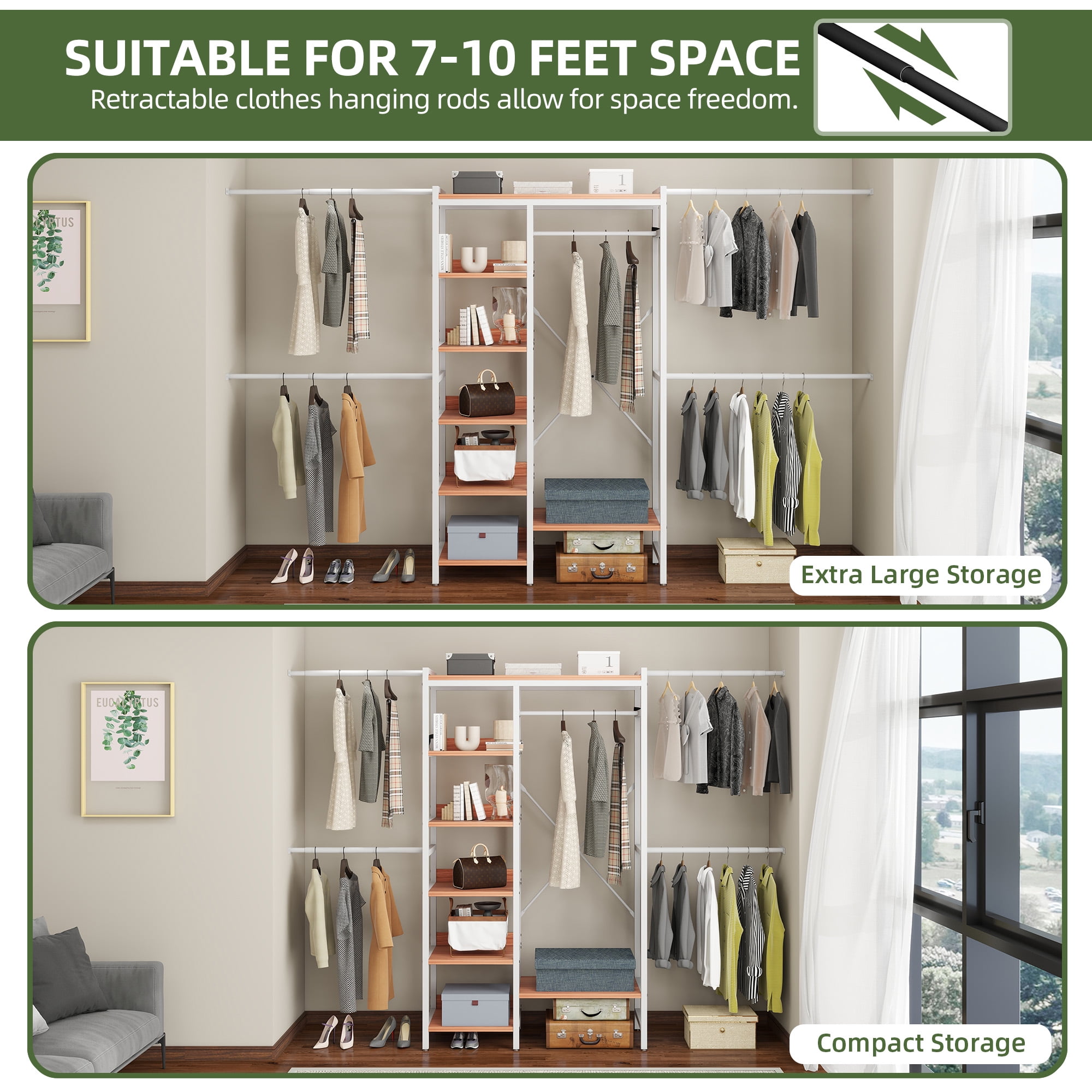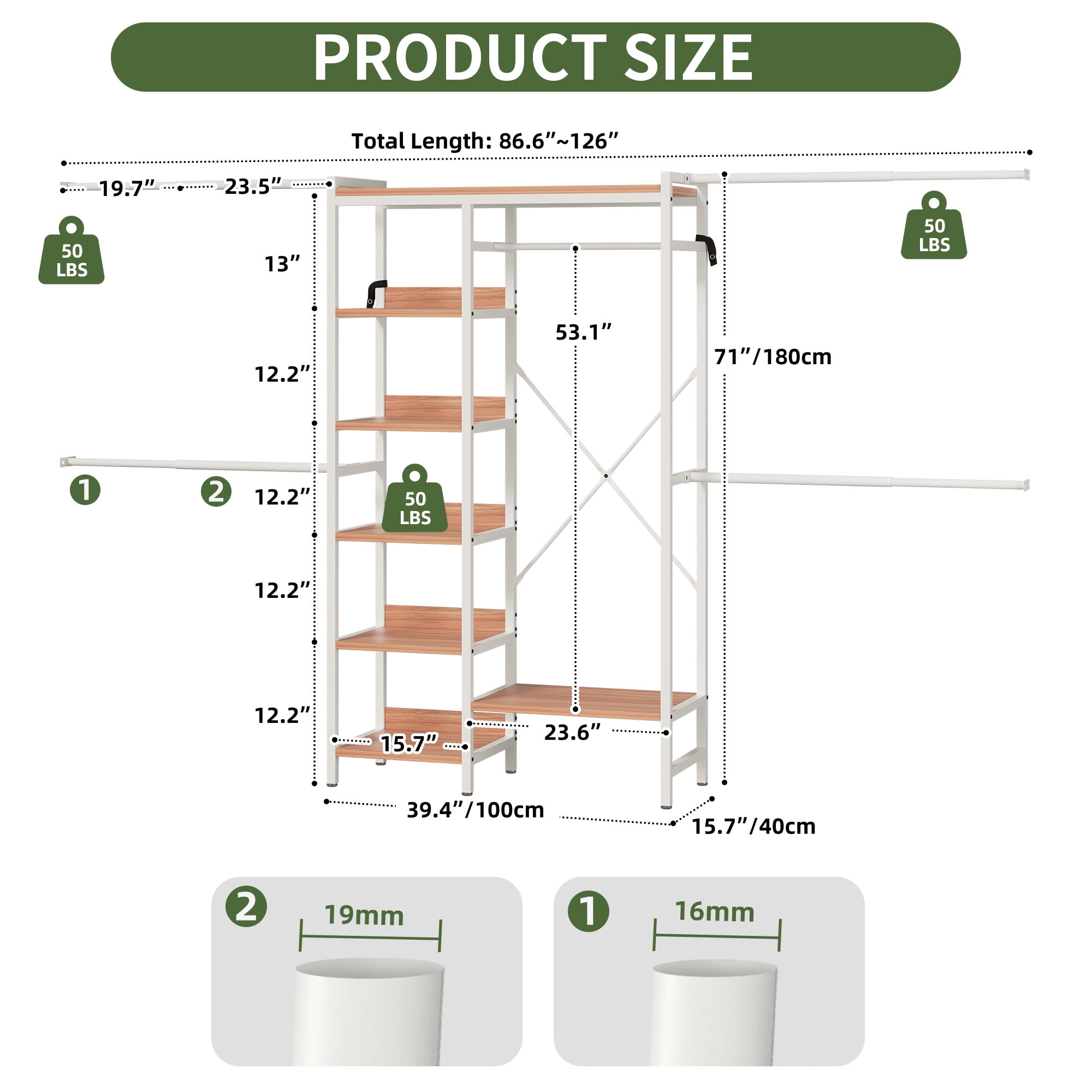 Strength and Stability: Crafted from a robust metal frame and engineered wood shelves, this closet system is a testament to durability. Enhanced with leveling feet and a non-tipping kit, rest assured of secure and stable storage for years. Smart Storage: Revel in the convenience of 7 storage shelves and 5 hanging areas, effortlessly organizing your bags, shirts, dresses, and coats. Grab what you need in seconds and step into each day feeling refreshed and stylish. Effortless Access: Unleash the potential of your wardrobe with this organizer, ensuring your outfits and accessories are neatly displayed for easy retrieval. Bid farewell to chaos and welcome a streamlined dressing experience. Assembly? Easy Peasy: Clear instructions and all the necessary hardware are included, making assembly a breeze. Experience a smooth installation process, empowering you to create a harmonious space in a matter of moments. Tailored to You: Sized at 86.6″~118″L x 15.7″W x 71″H. It’s designed to fit walk-in closets or space from 7 to 10 feet wide, this organizer features four adjustable telescopic rods (23.6″ to 39″) for a truly personalized storage solution.